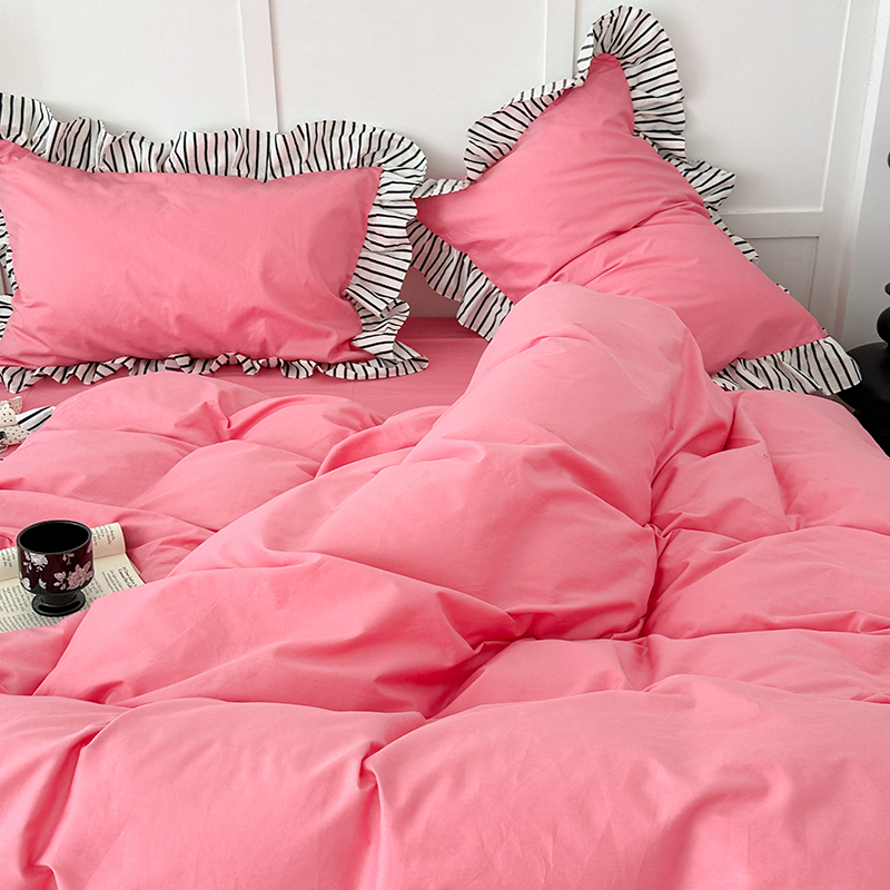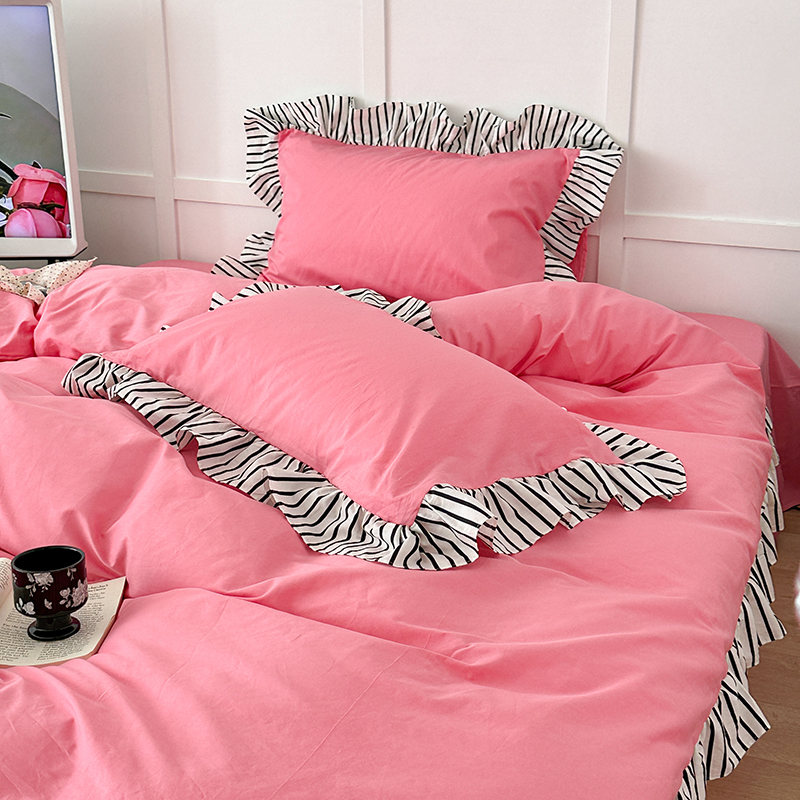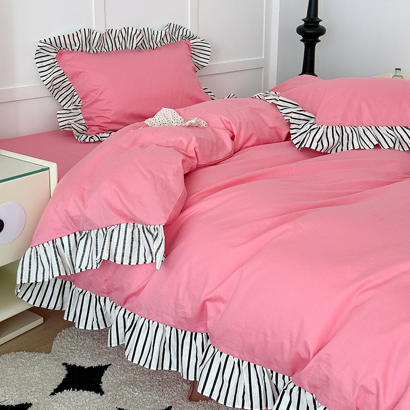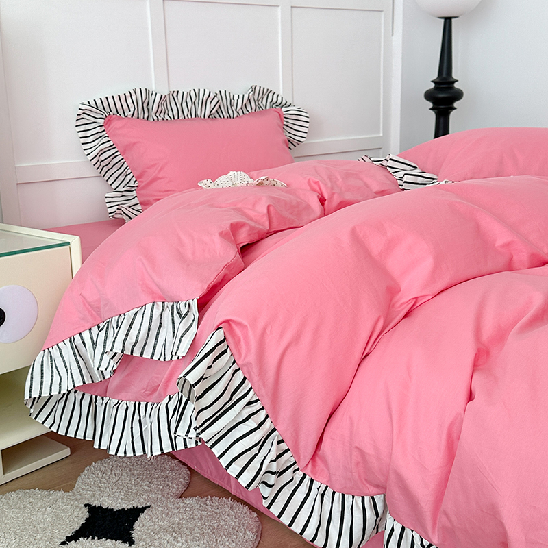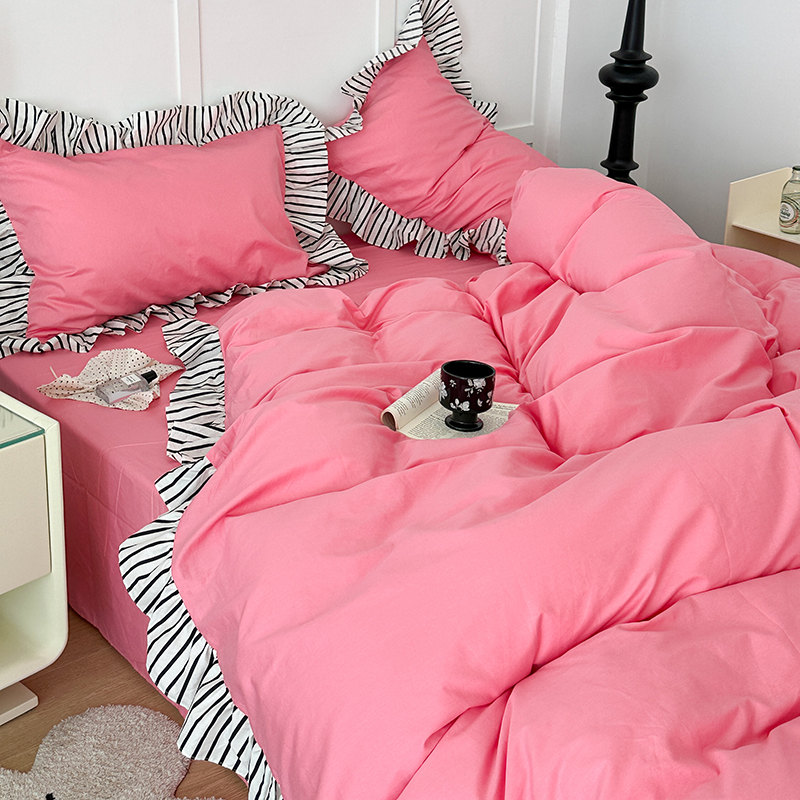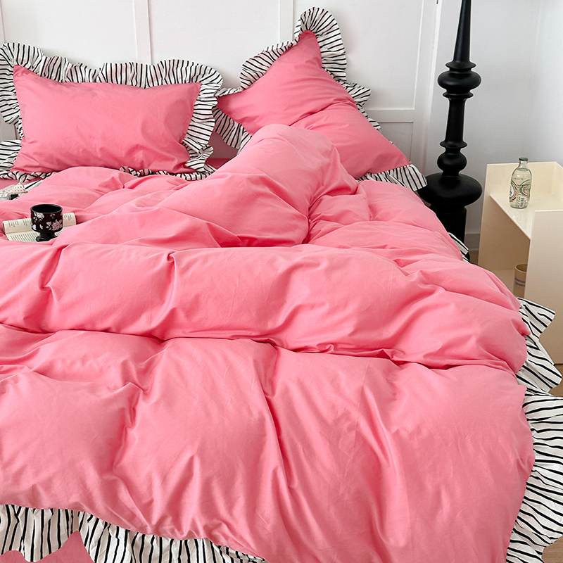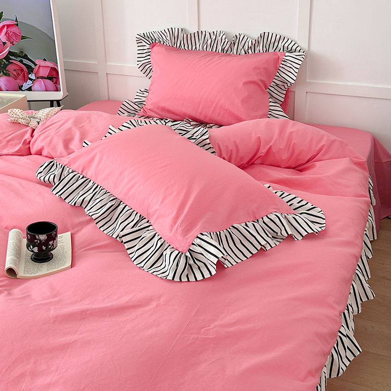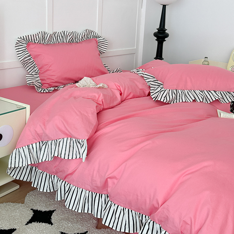 昔可家纺 2024新款纯色亲肤条纹花边四件套 千禧黑条