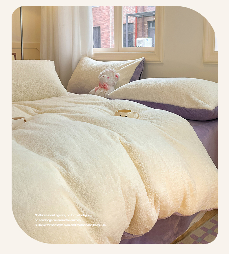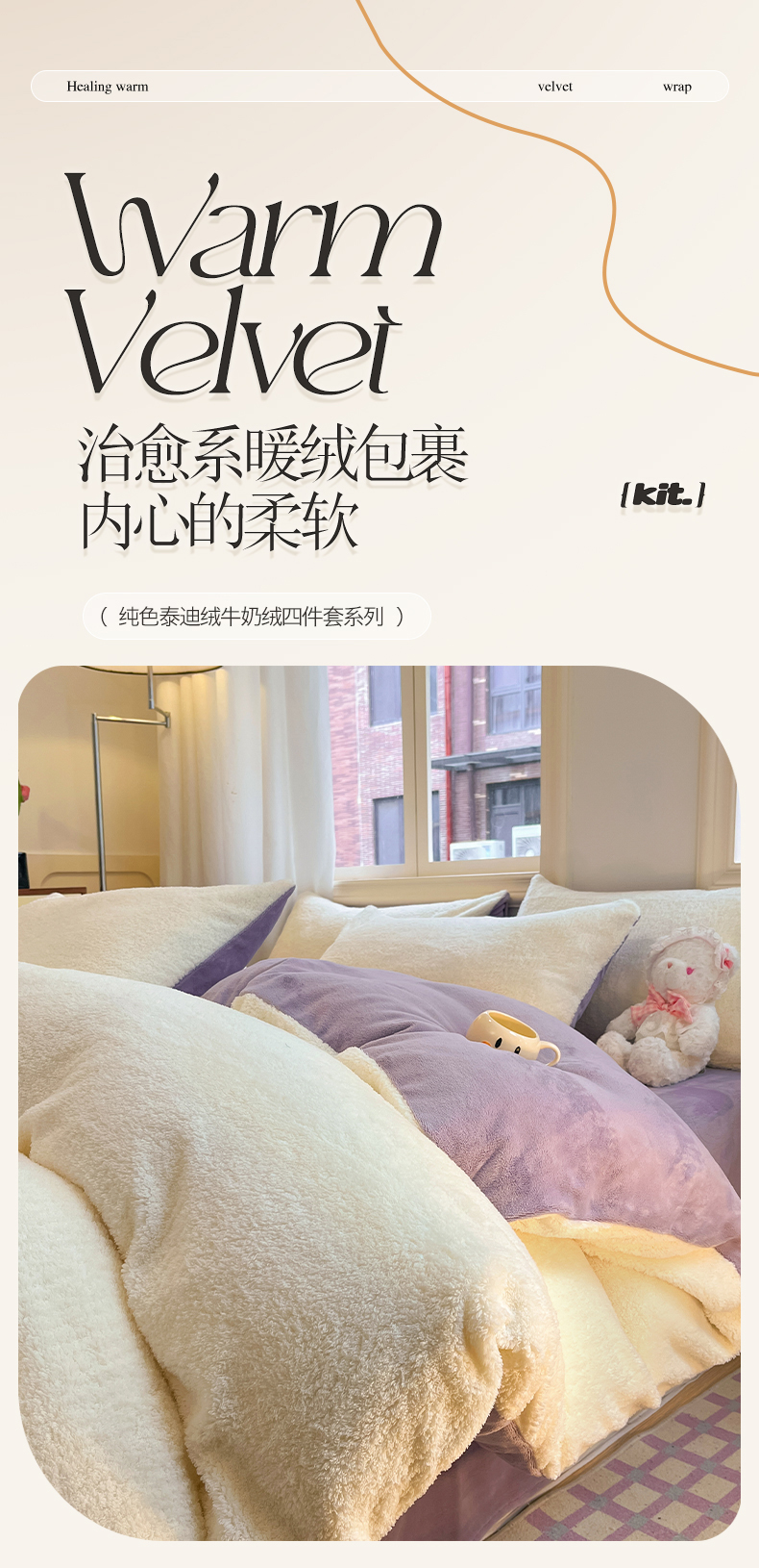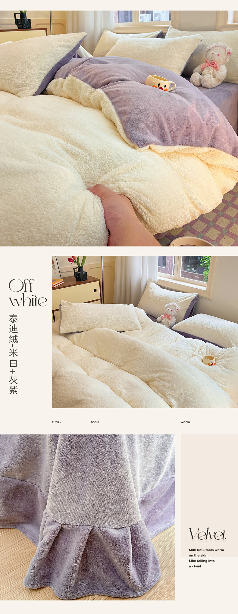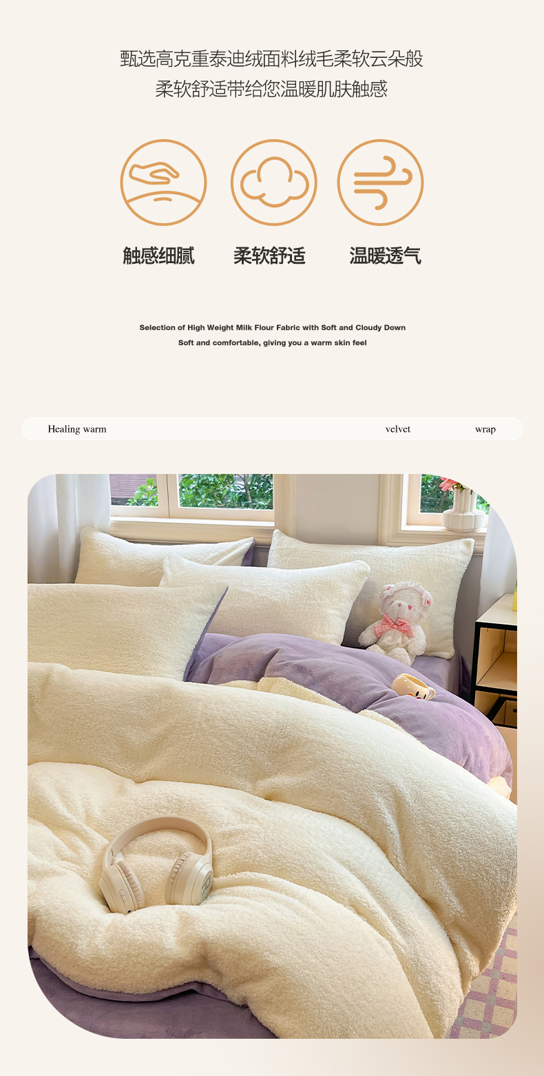 商品名称:绘萱家居 2024新款高克重泰迪绒纯色牛奶绒四件套双拼法莱绒珊瑚绒 泰迪绒-米白+灰紫