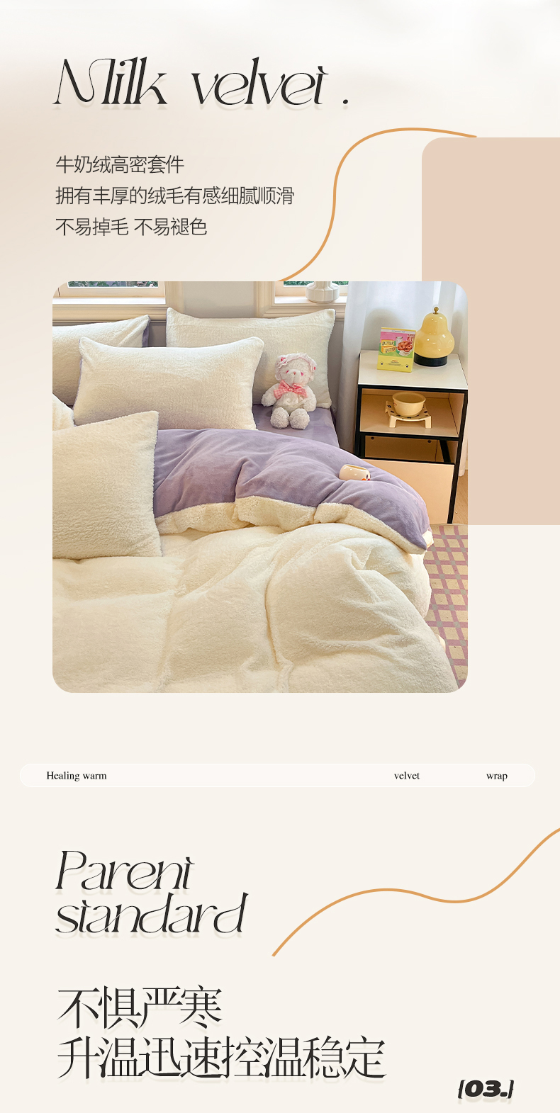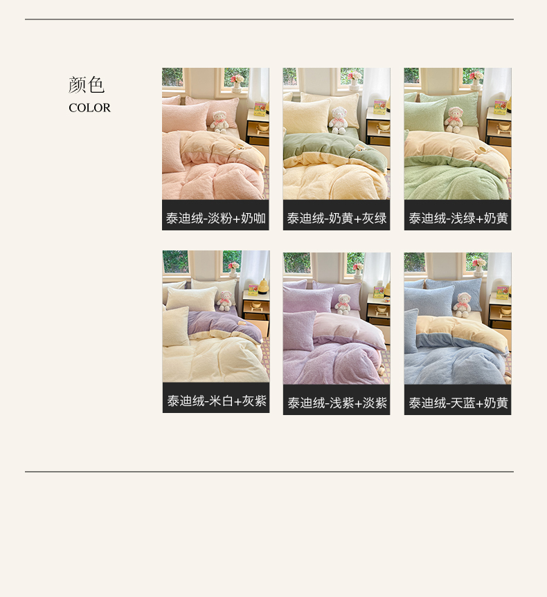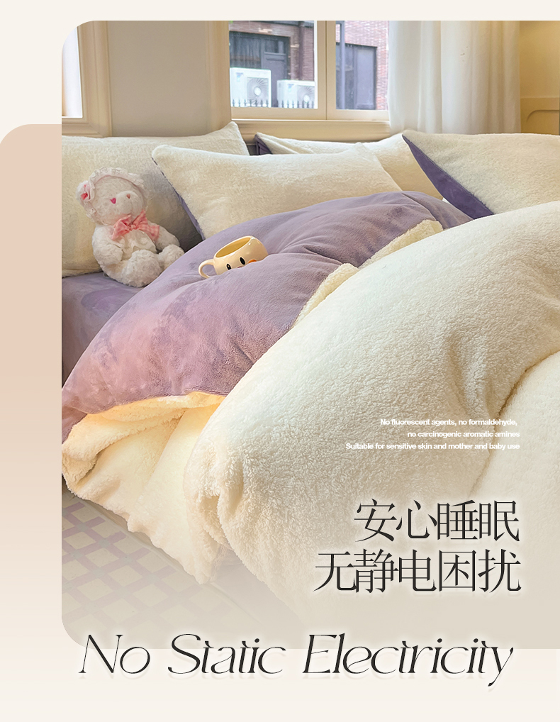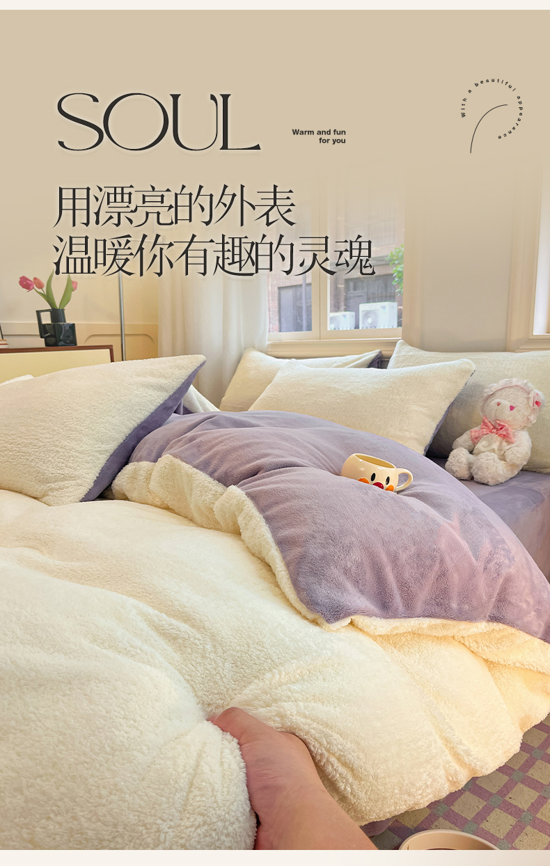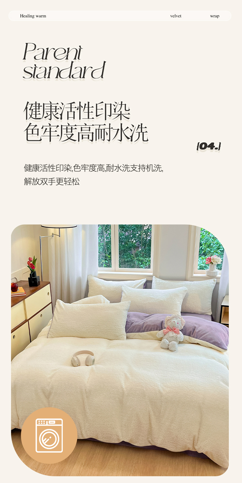 商品名称:绘萱家居 2024新款高克重泰迪绒纯色牛奶绒四件套双拼法莱绒珊瑚绒 泰迪绒-米白+灰紫