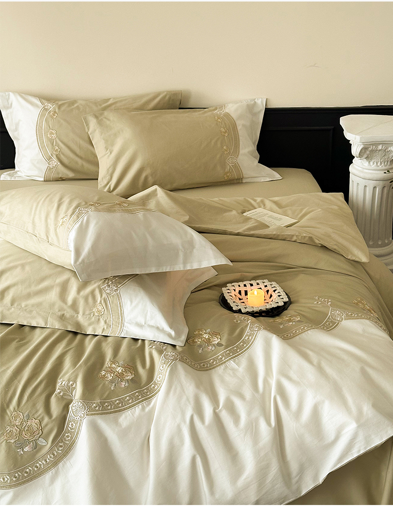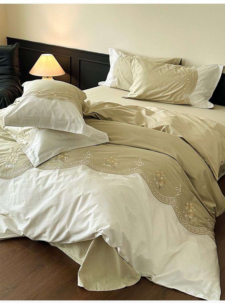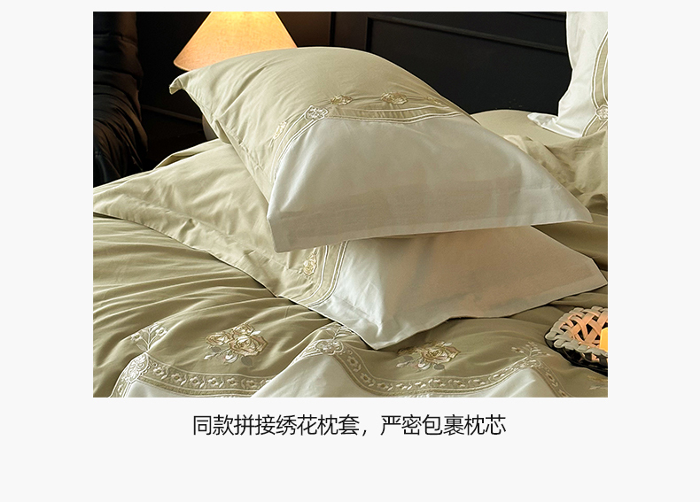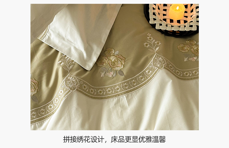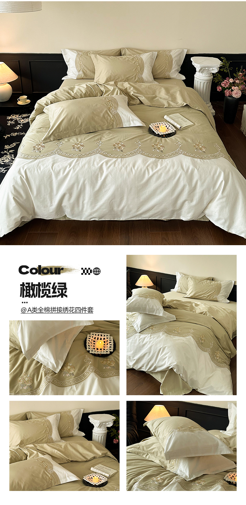 商品名称:懒猫家纺 2024新款全棉拼接绣花套件四件套 橄榄绿