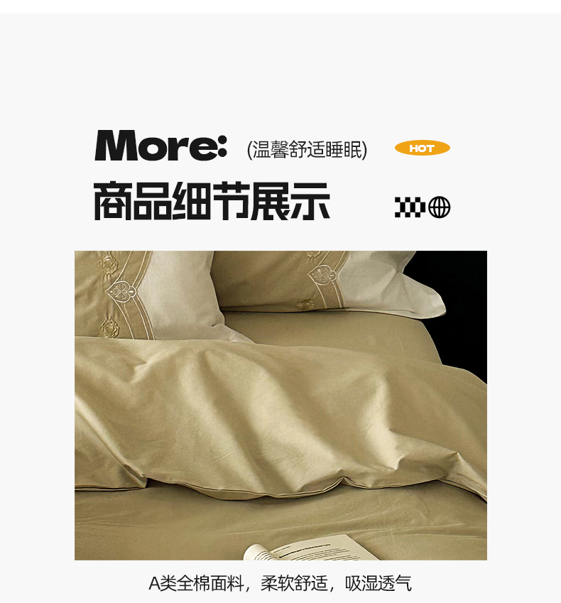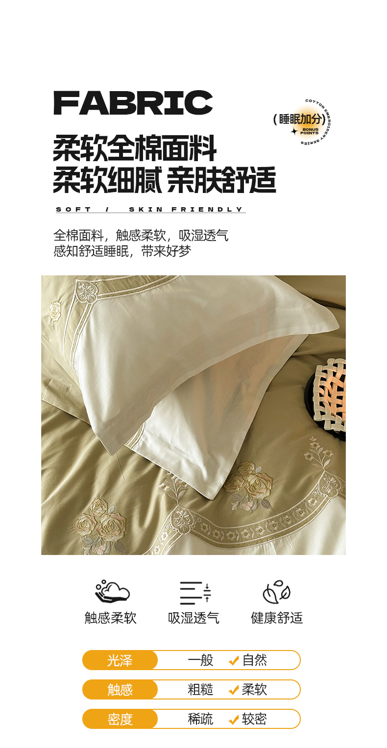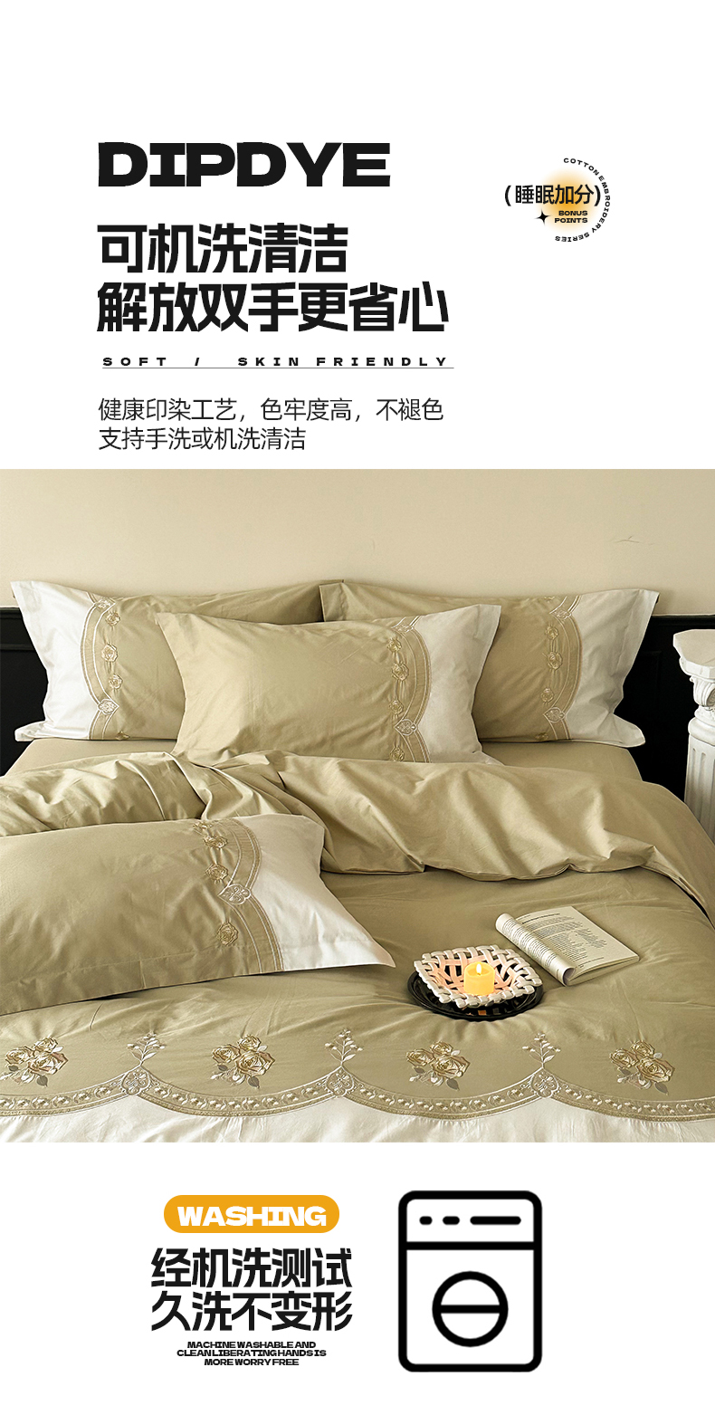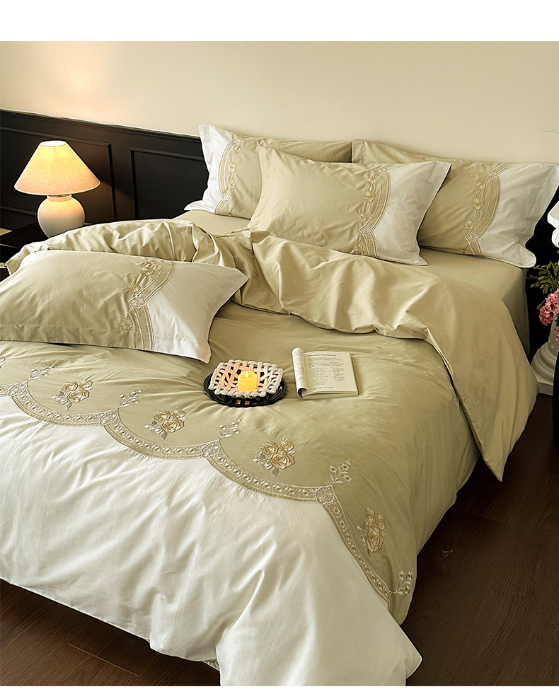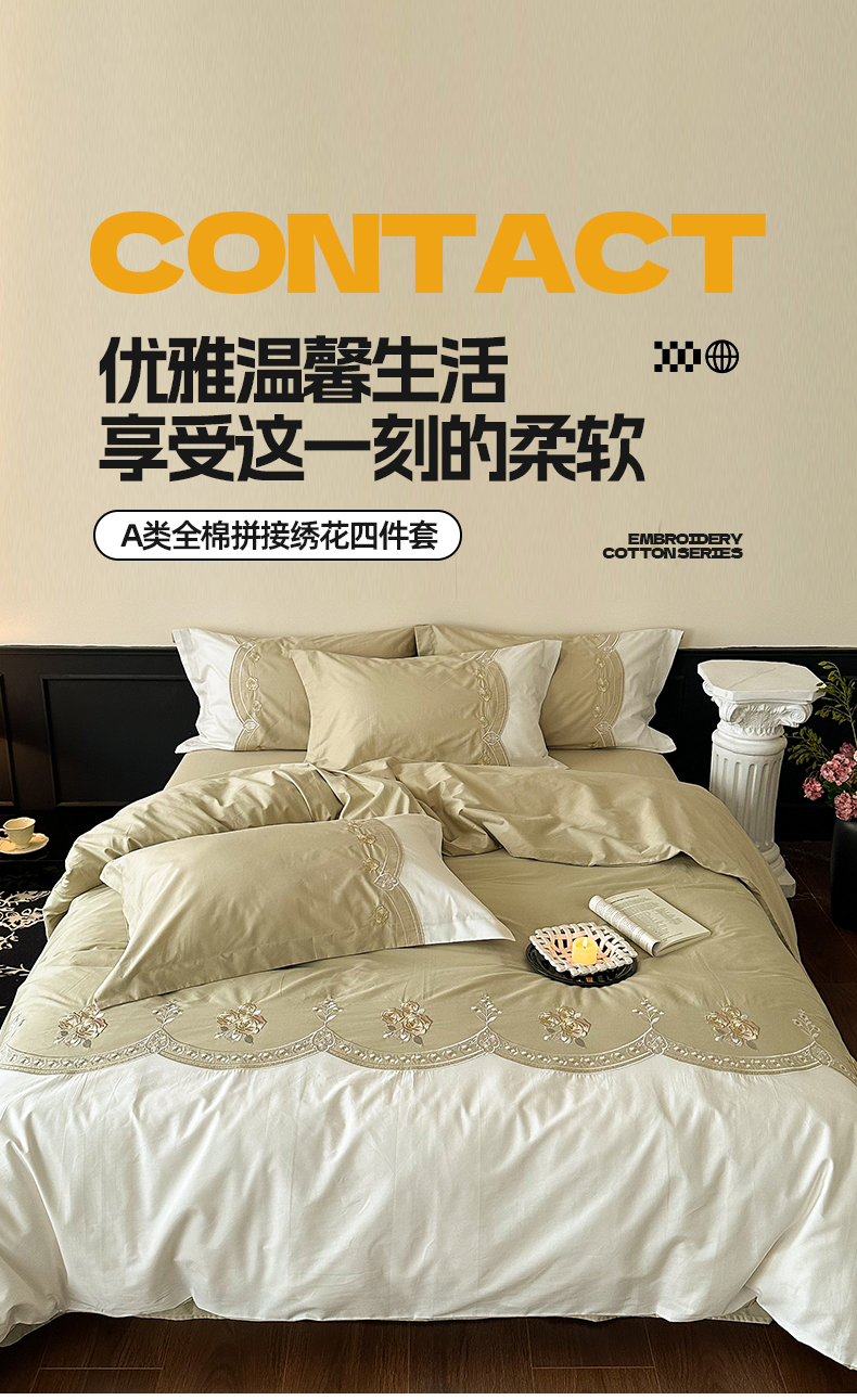 商品名称:懒猫家纺 2024新款全棉拼接绣花套件四件套 橄榄绿