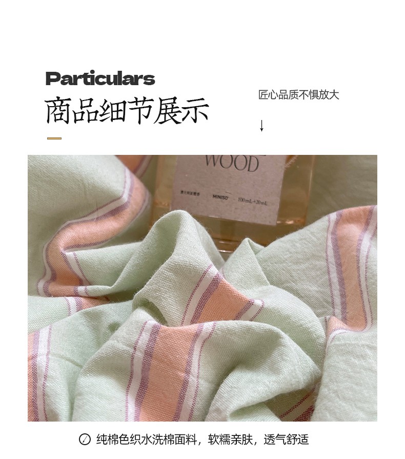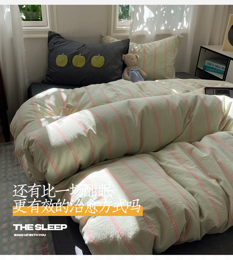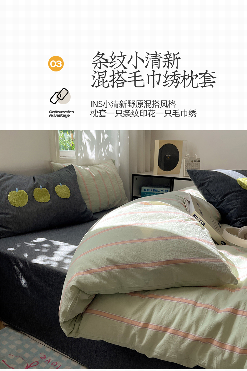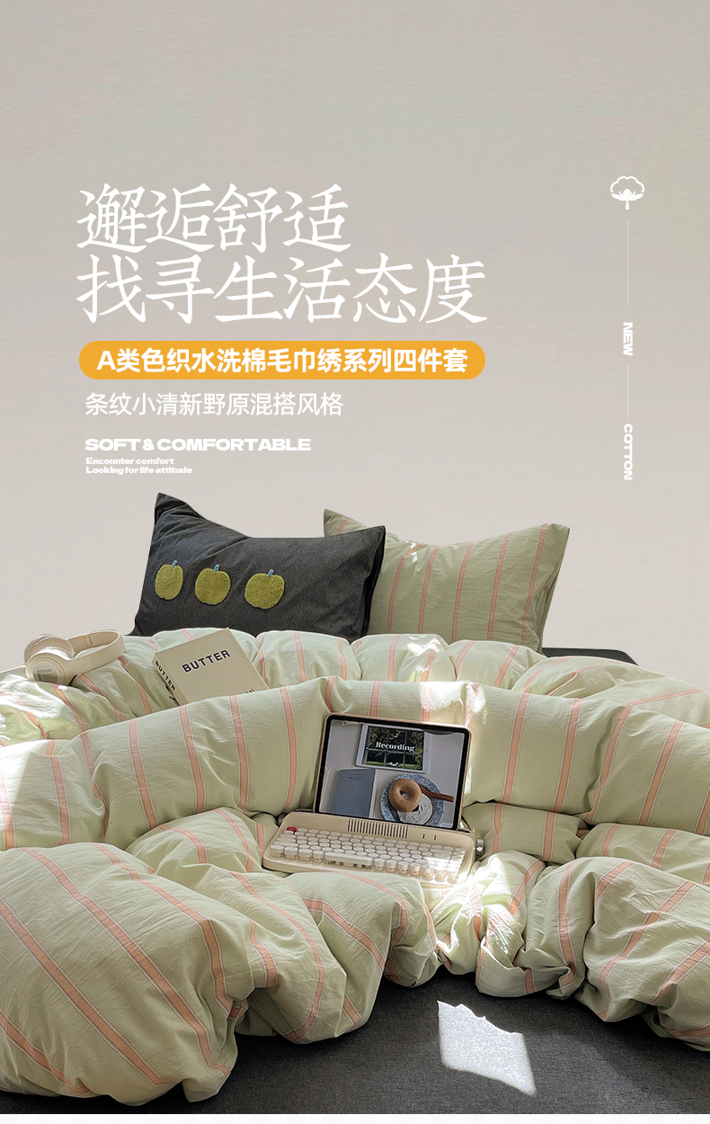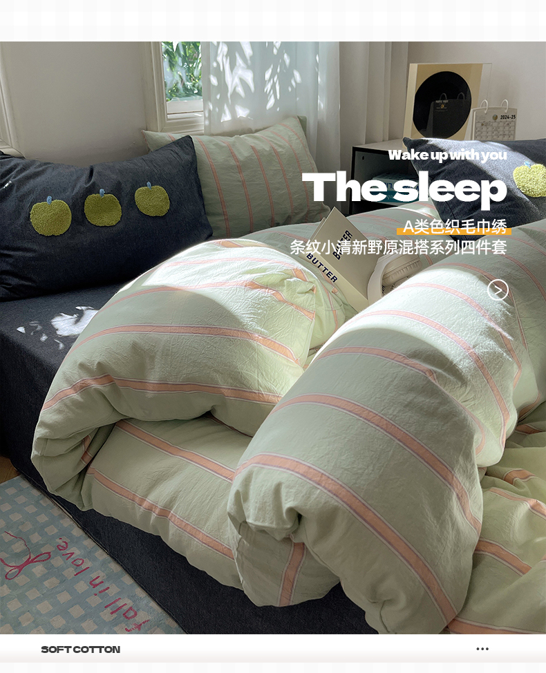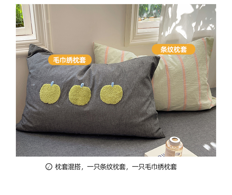 当前位置: 91家纺网 > 商品网购 > 床品套件 > 四件套 > 其它四件套 > 桃子家居 2024新款A类色织毛巾绣条纹小清新野原混搭纯棉系列四件套 色织水洗棉-桔条苹果