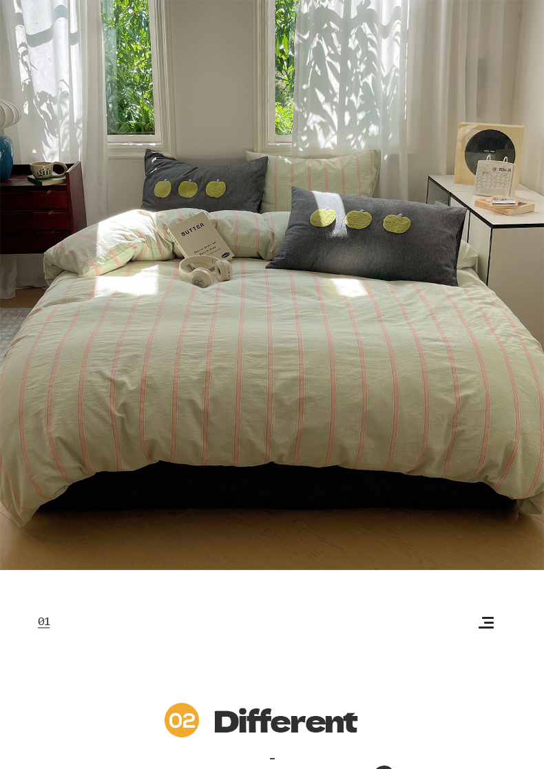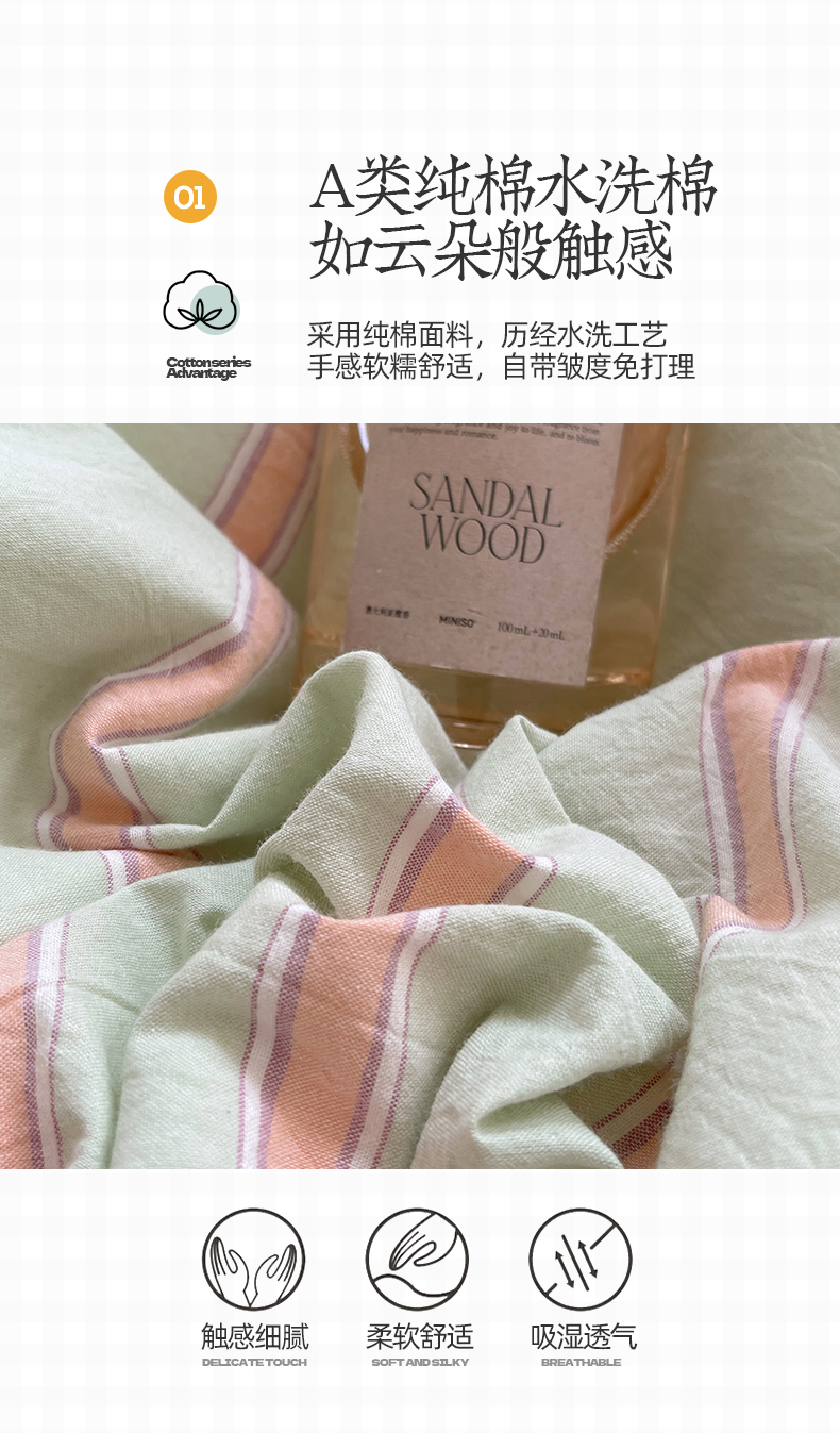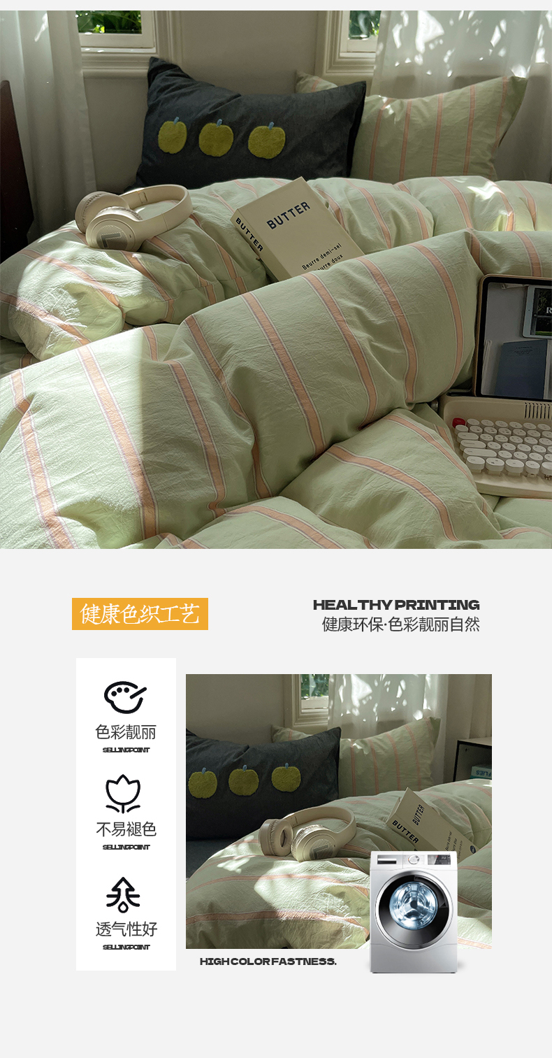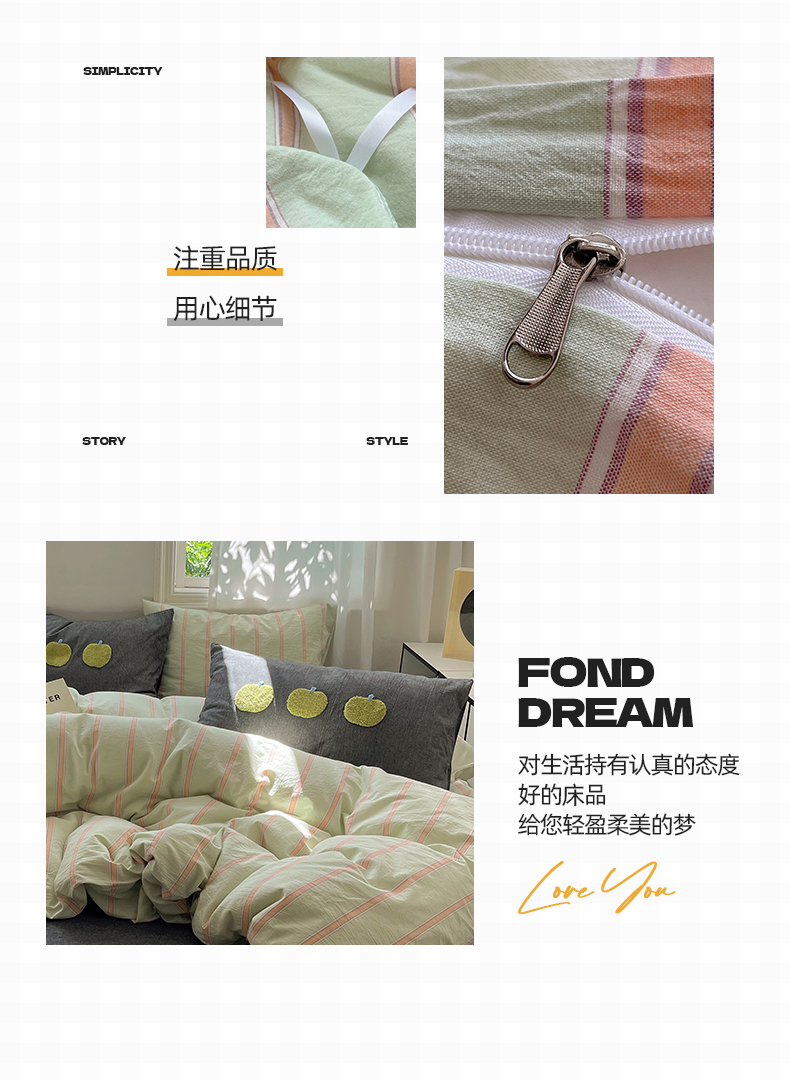 当前位置: 91家纺网 > 商品网购 > 床品套件 > 四件套 > 其它四件套 > 桃子家居 2024新款A类色织毛巾绣条纹小清新野原混搭纯棉系列四件套 色织水洗棉-桔条苹果