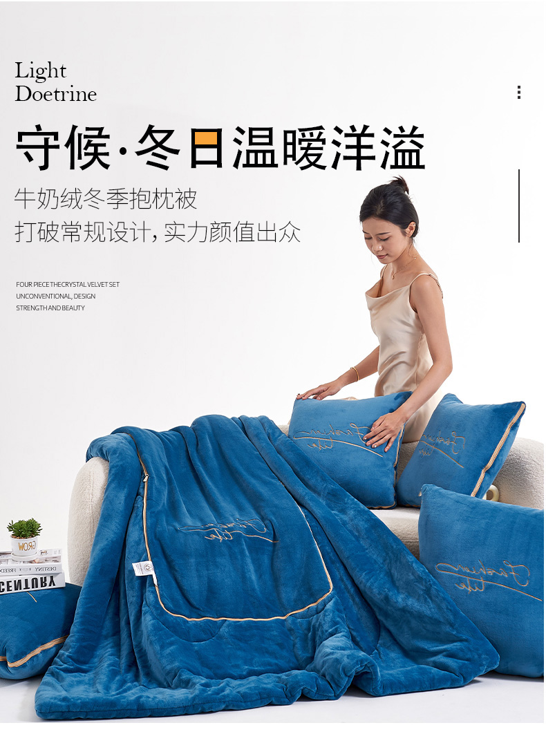 照世家纺 2024新款牛奶绒轻奢抱枕被 宝石蓝