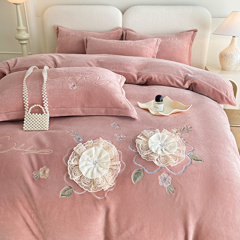 孟鑫家纺 2025新款加厚牛奶绒手工花绣花四件套莱茵花园系列 莱茵花园-豆沙