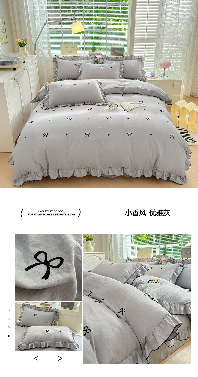 当前位置: 91家纺网 > 商品网购 > 床品套件 > 四件套 > 水洗棉四件套 > 慕希家纺 2024新款精品刺绣韩版水洗棉四件套-小香风 小香风-优雅灰