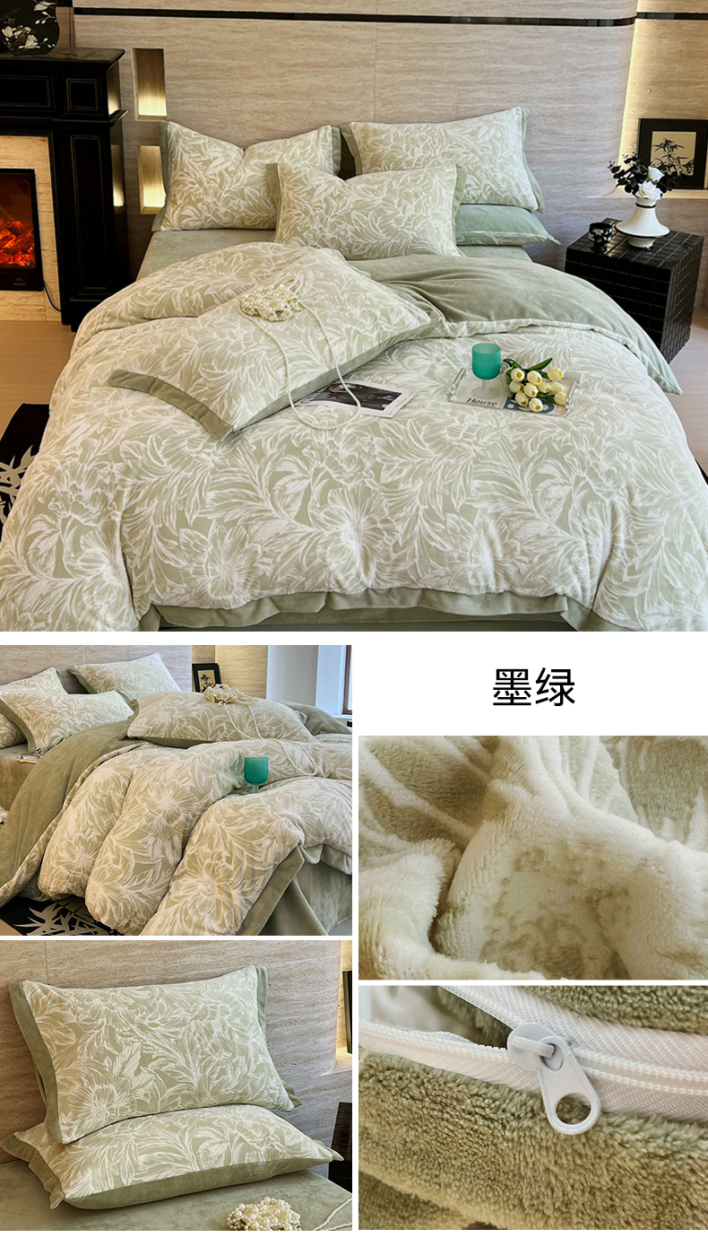 佰亿莱 2024新款高克重雕花牛奶绒轻奢拼角四件套 墨绿