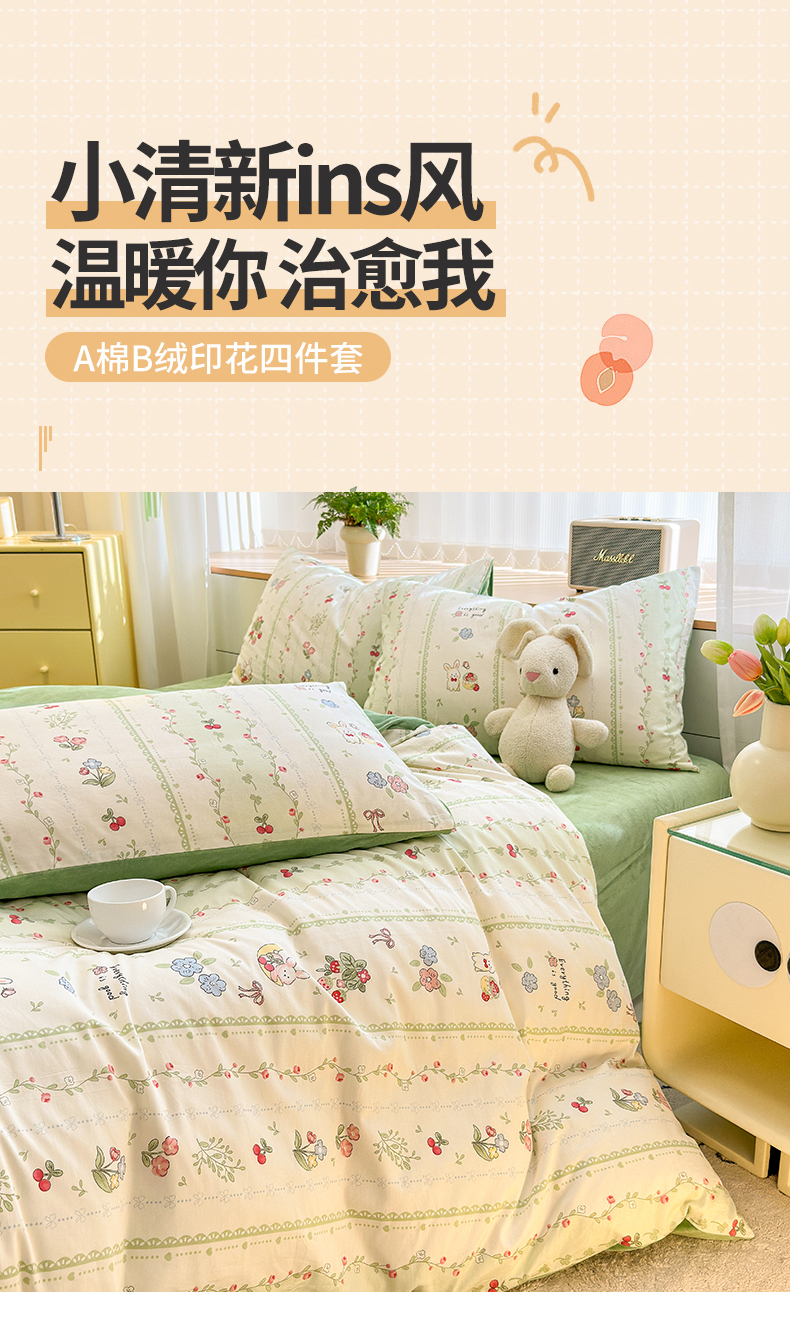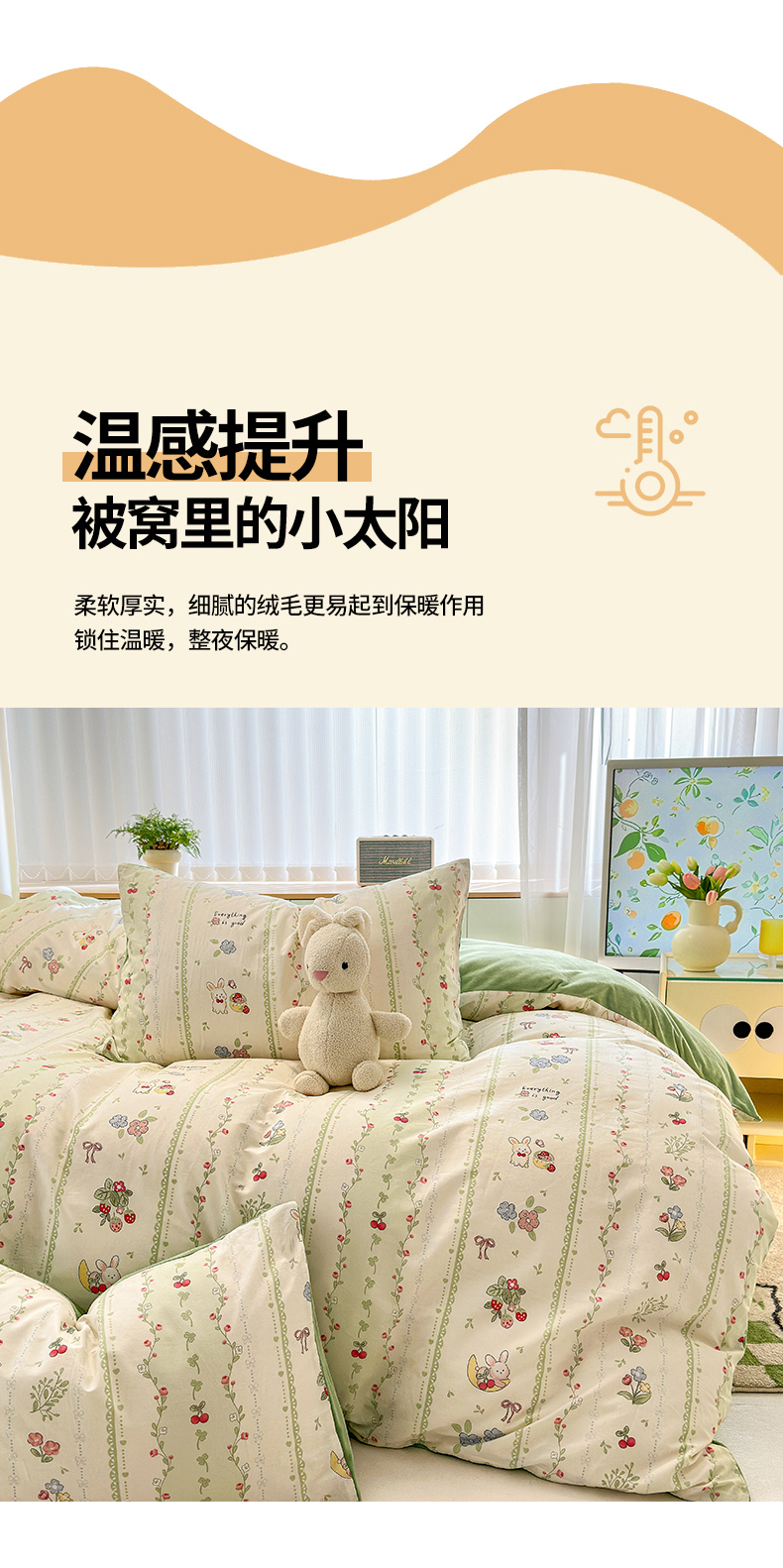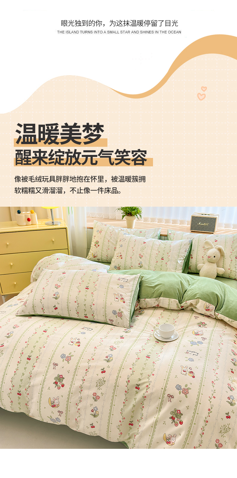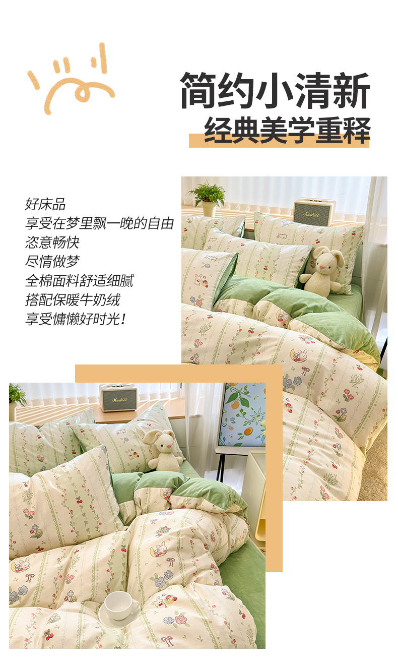 当前位置: 91家纺网 > 商品网购 > 床品套件 > 四件套 > 其它四件套 > 清雅福 2024新款小清新ins棉加绒印花四件套系列-棉绒风格二 草莓兔