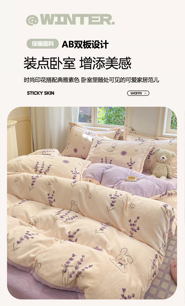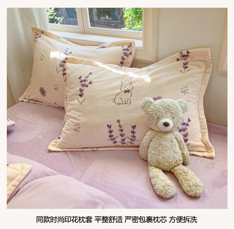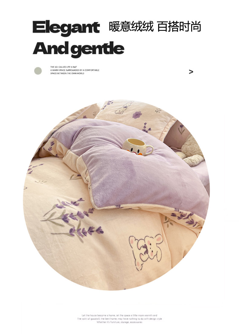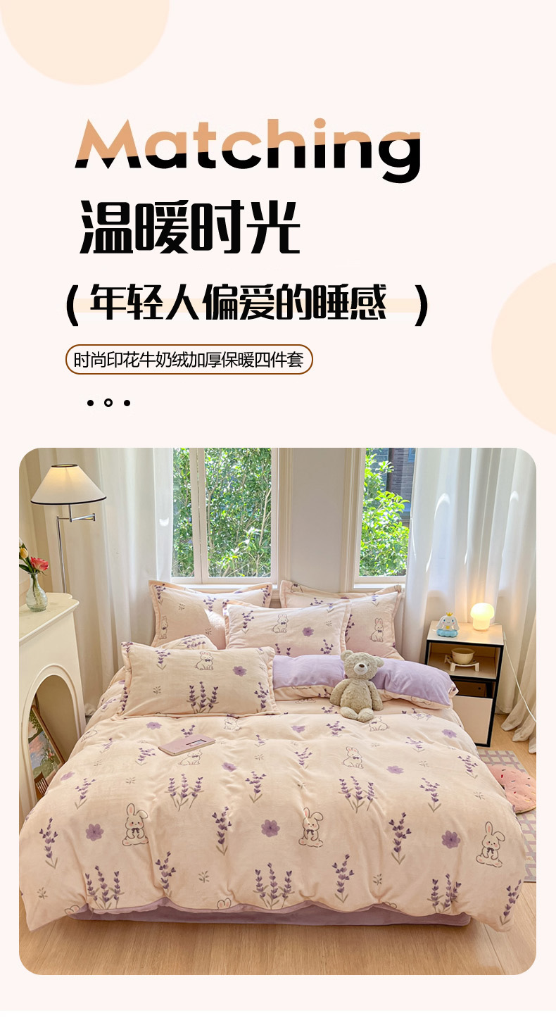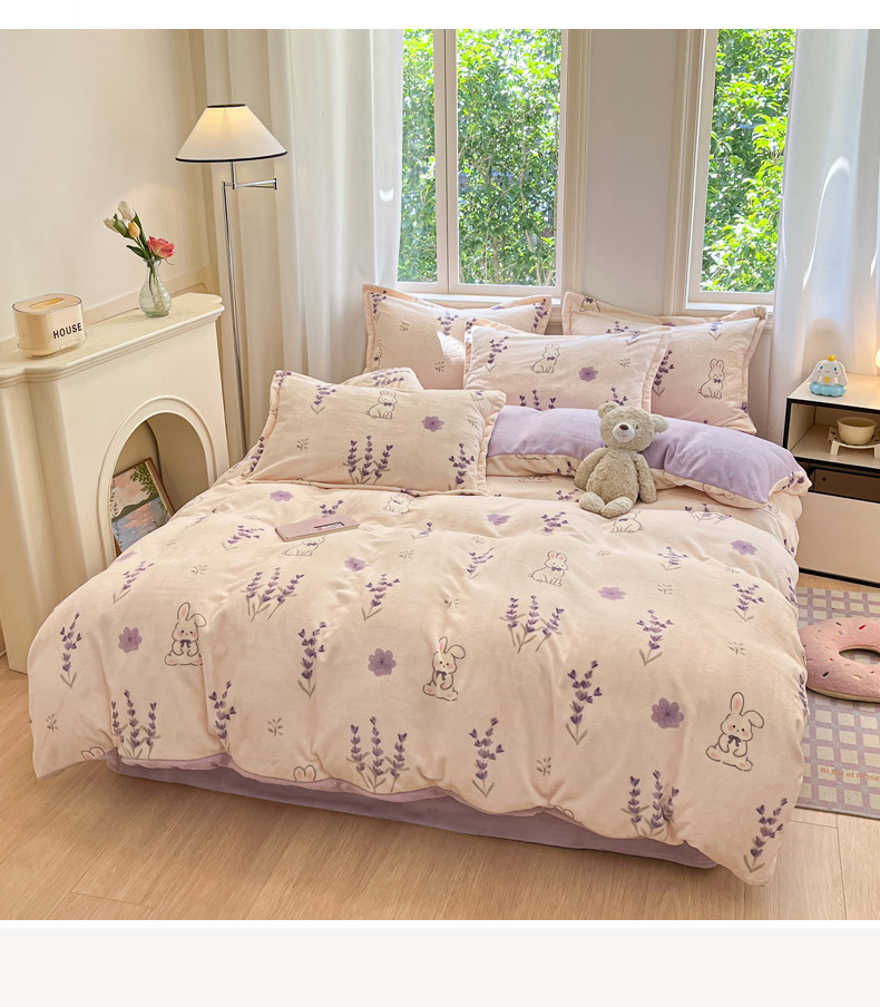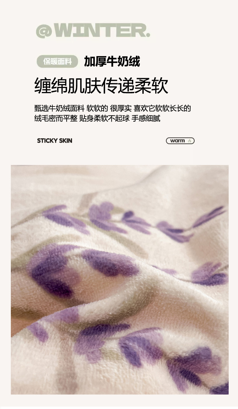 当前位置: 91家纺网 > 商品网购 > 床品套件 > 四件套 > 牛奶绒四件套 > 沐慕 2024新款200g加厚牛奶绒四件套 紫兔花香