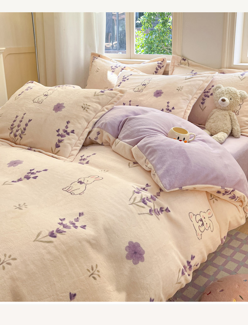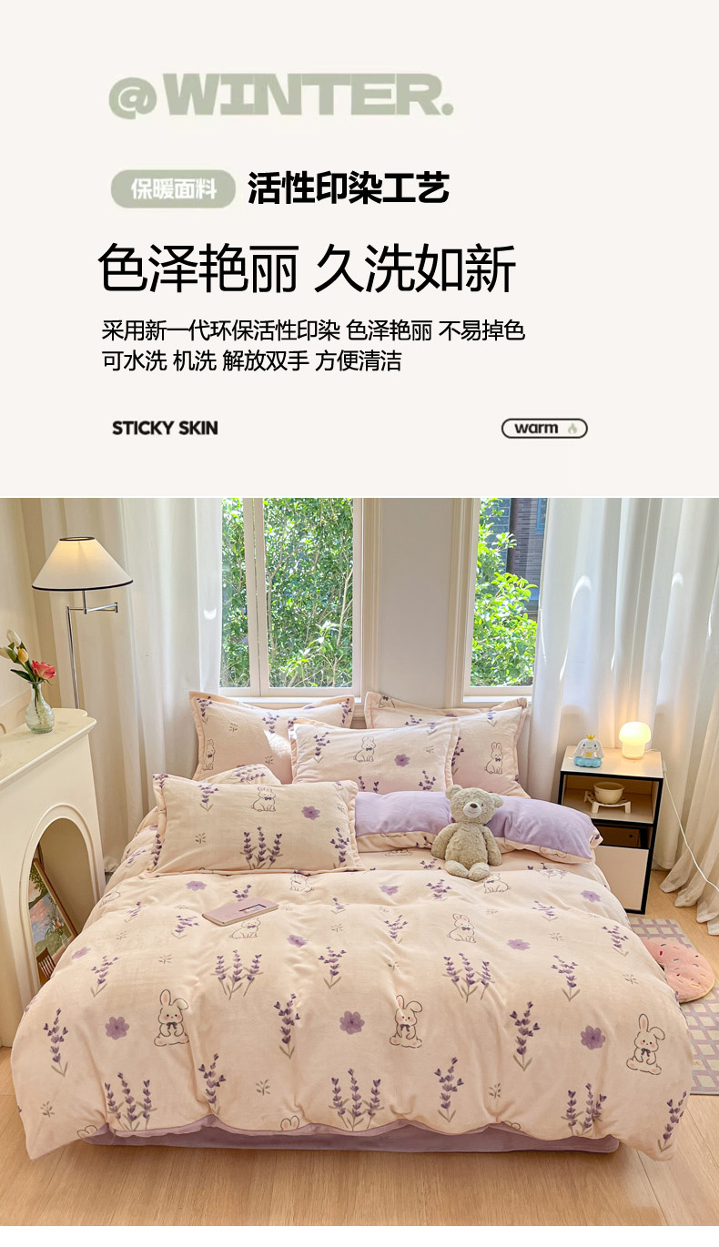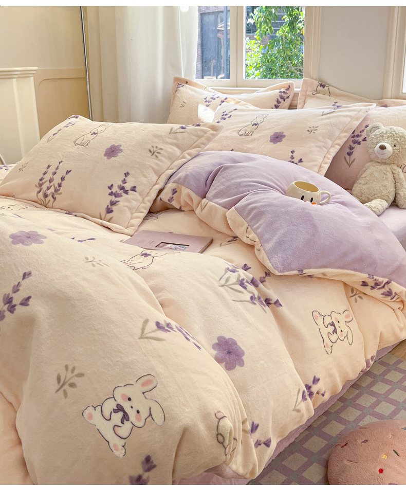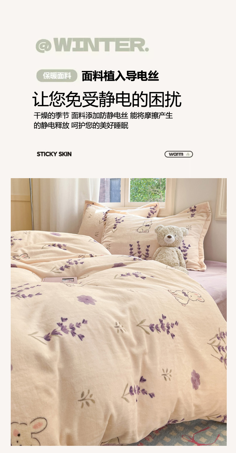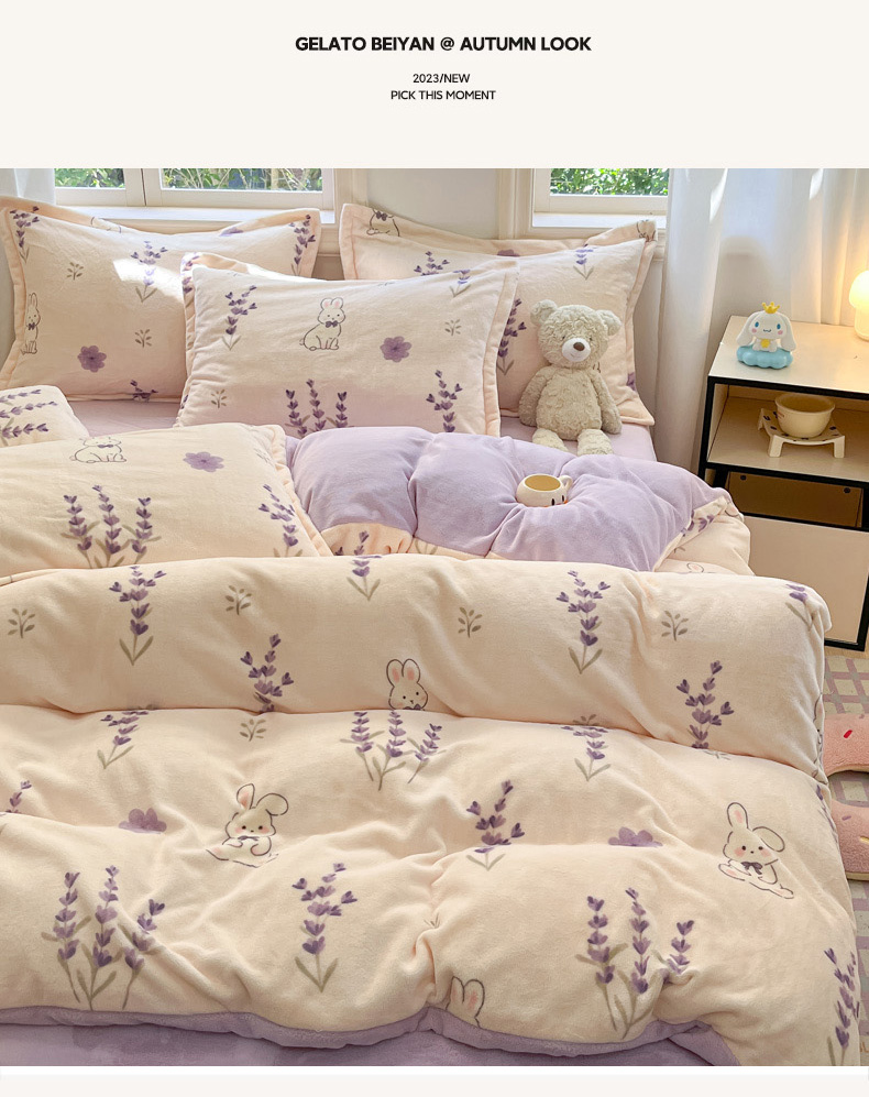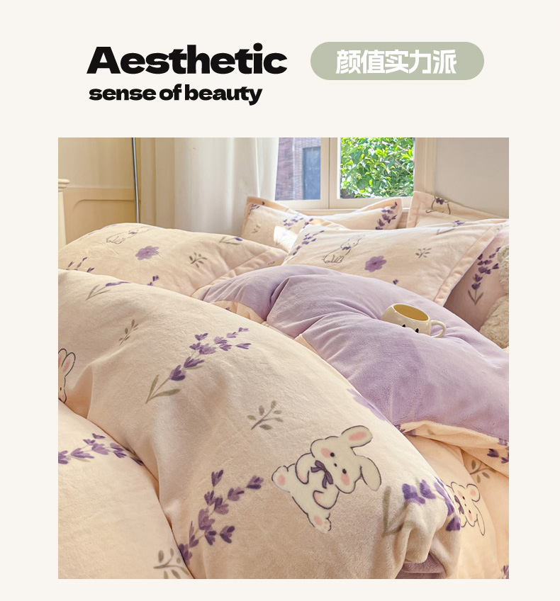 当前位置: 91家纺网 > 商品网购 > 床品套件 > 四件套 > 牛奶绒四件套 > 沐慕 2024新款200g加厚牛奶绒四件套 紫兔花香