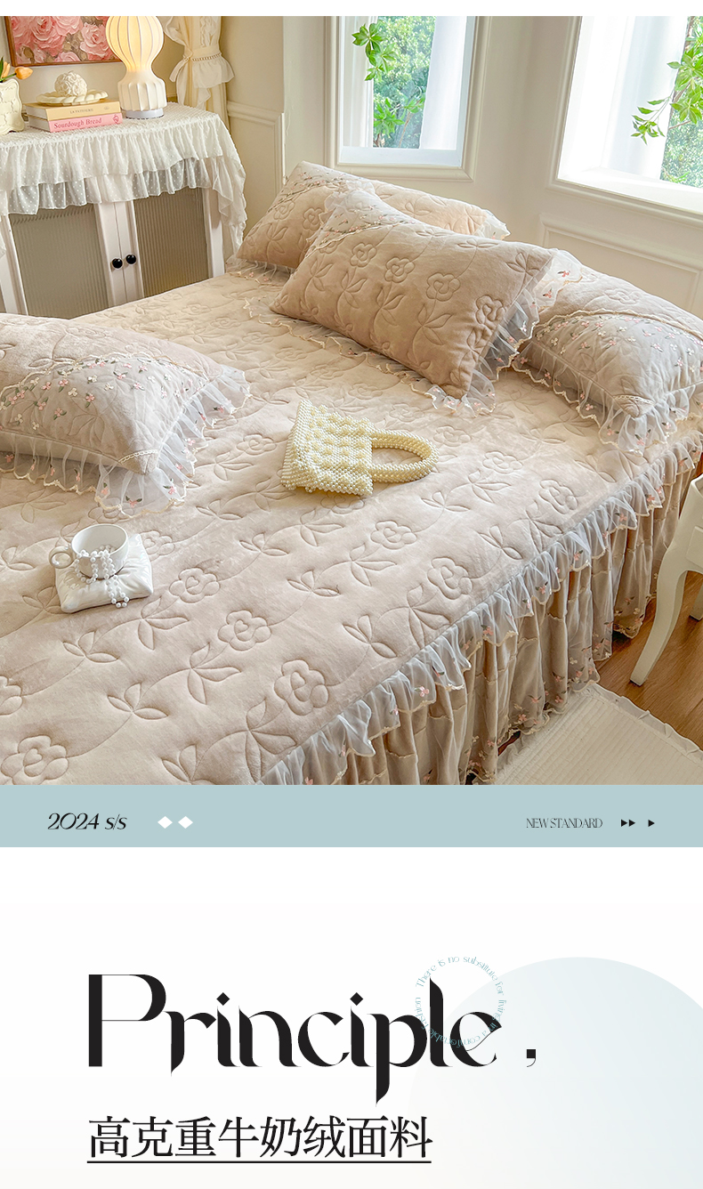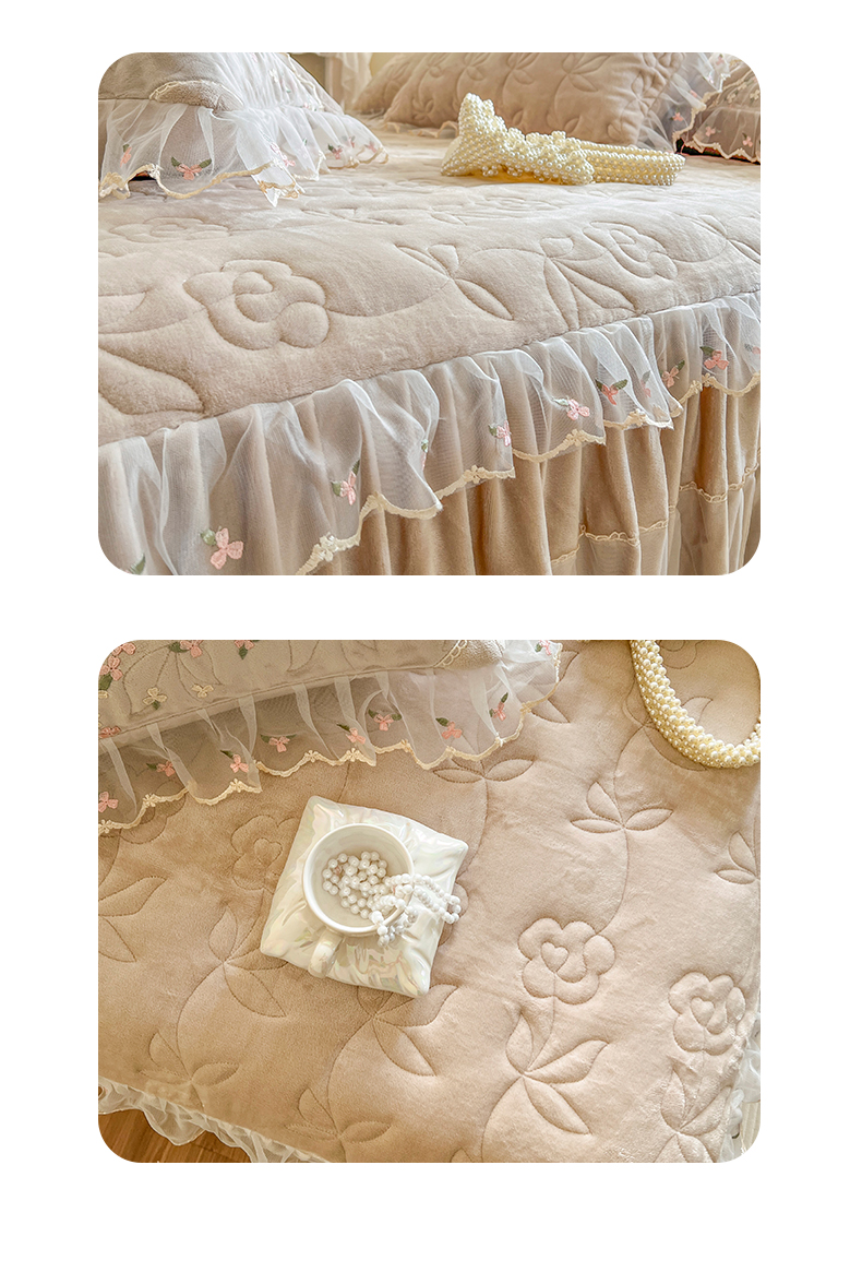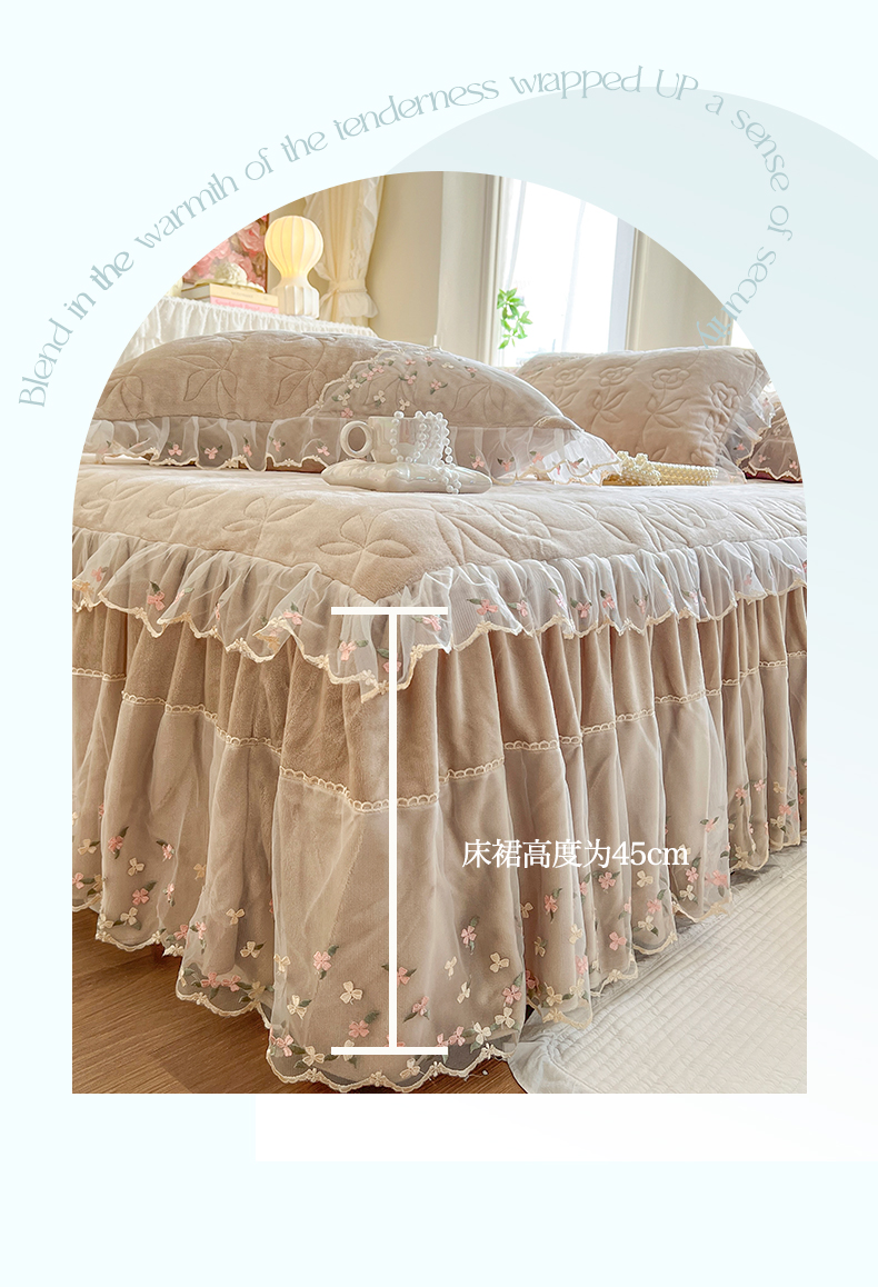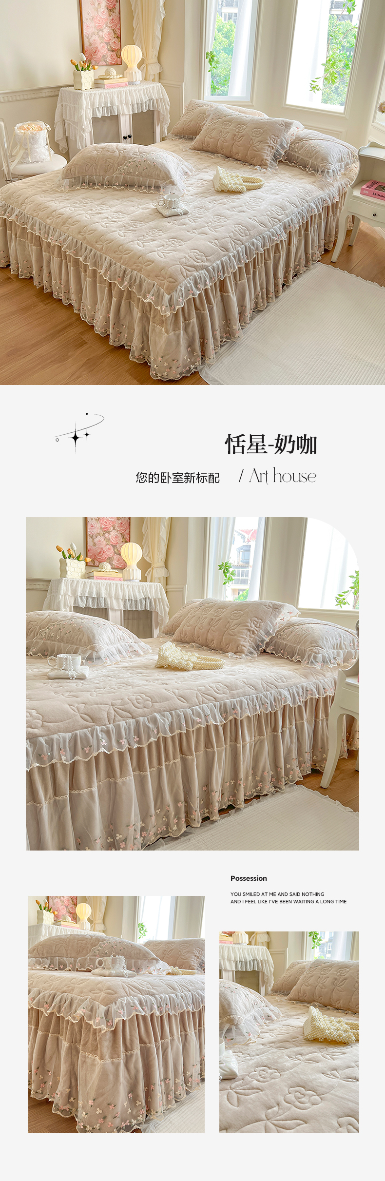 网红馆(ck家纺) 2025新款加厚保暖高克重牛奶绒蕾丝花边床裙款恬星系列床裙三件套 恬星-奶咖