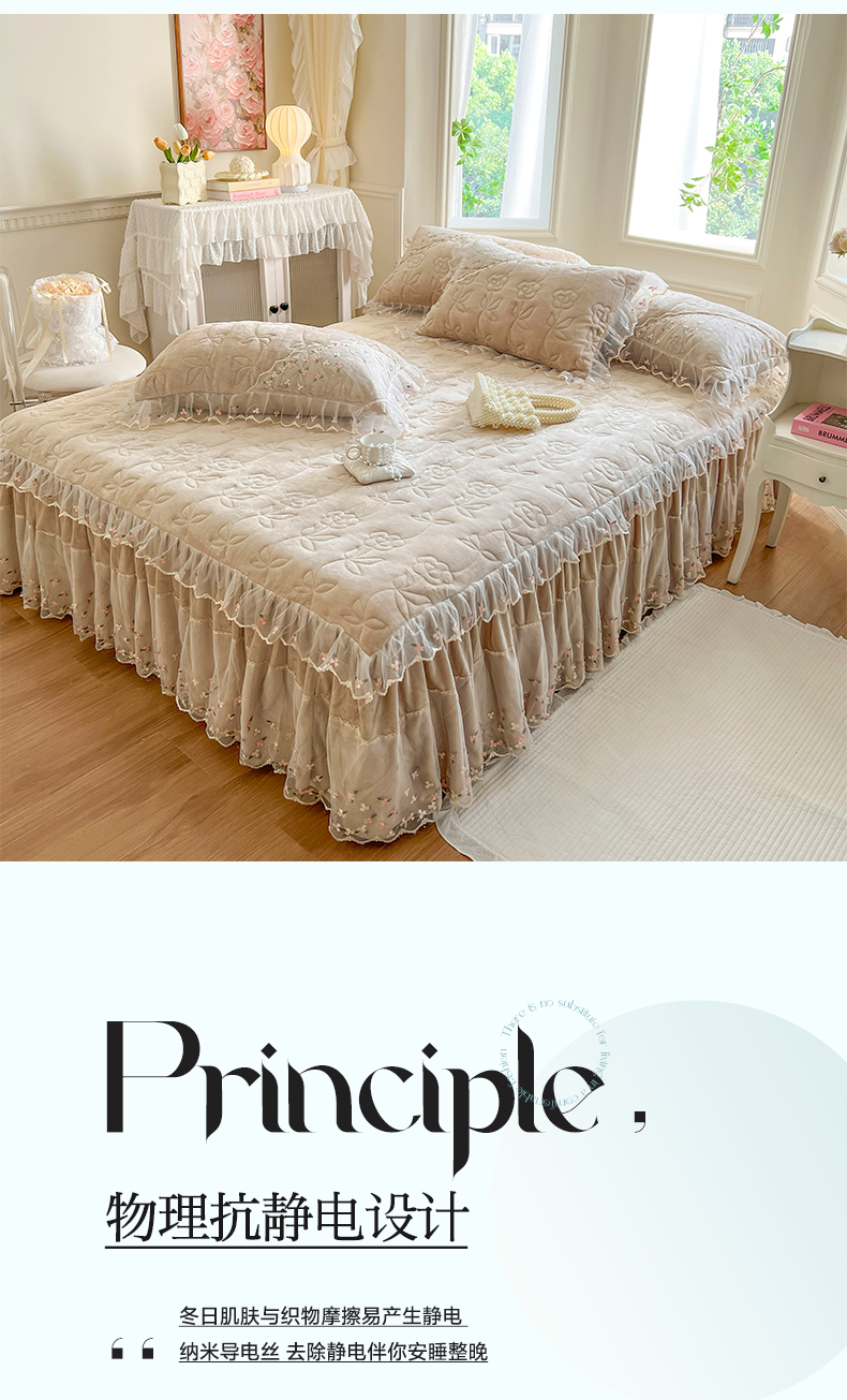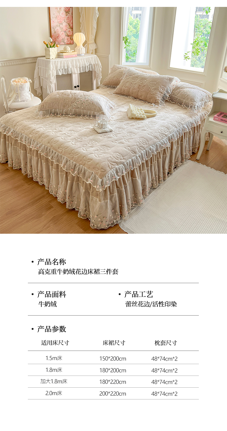 商品名称:网红馆(ck家纺) 2025新款加厚保暖高克重牛奶绒蕾丝花边床裙款恬星系列床裙三件套 恬星-奶咖