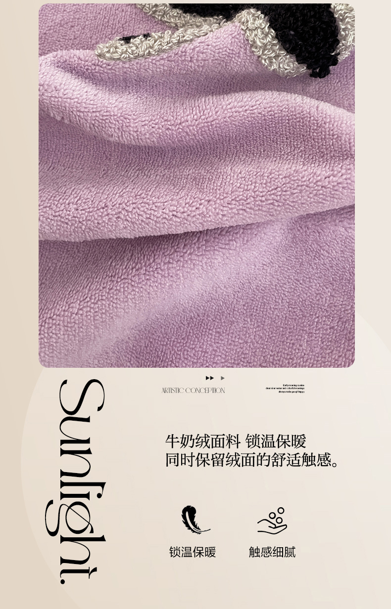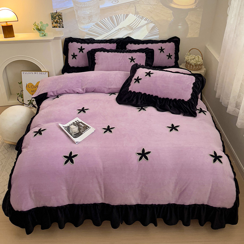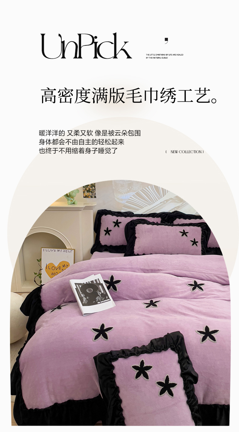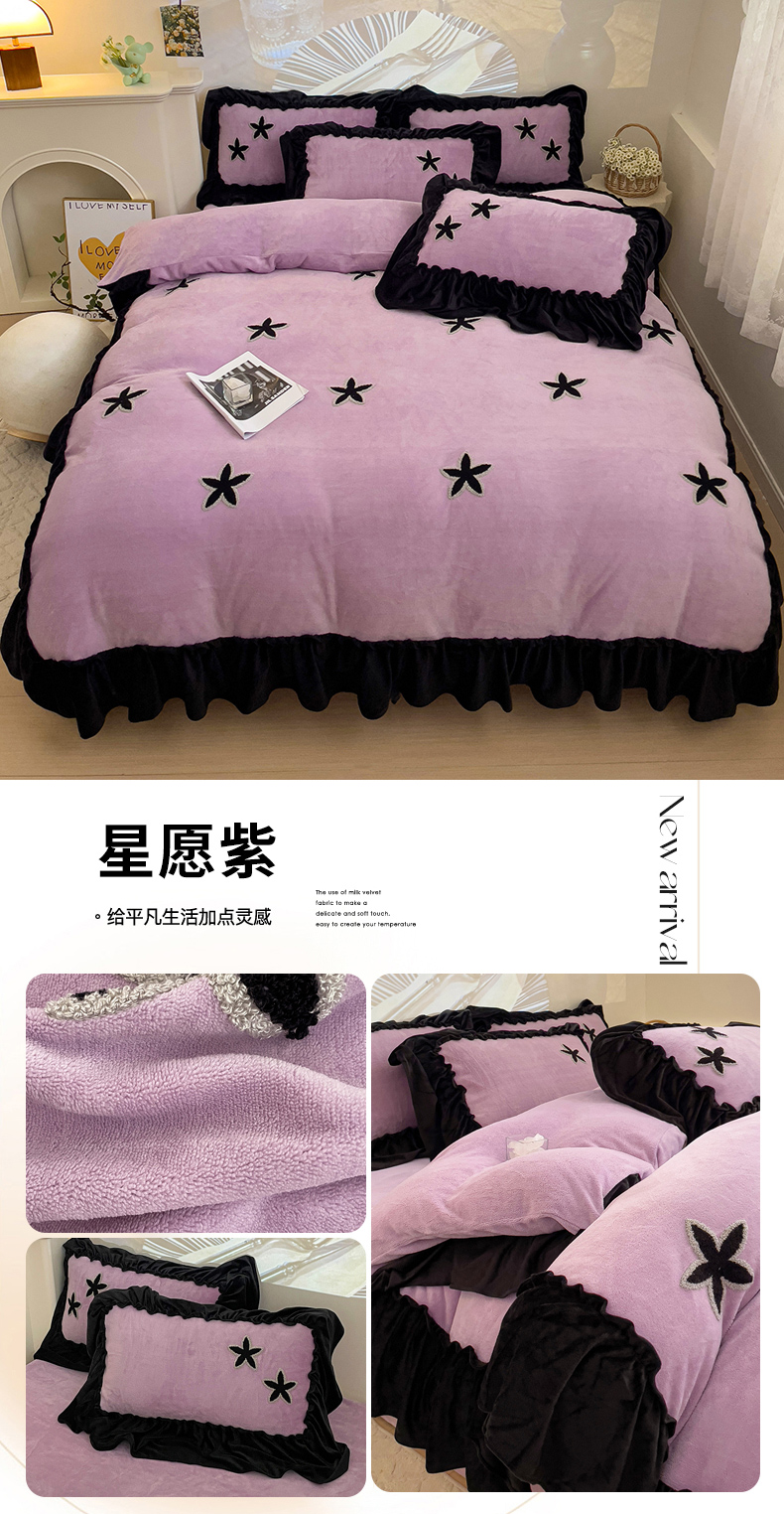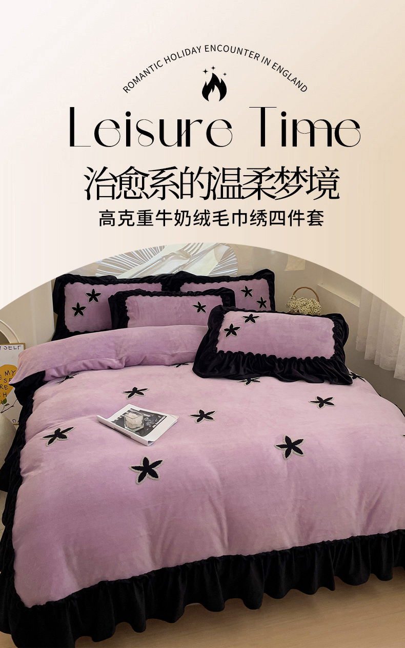 当前位置: 91家纺网 > 商品网购 > 床品套件 > 四件套 > 牛奶绒四件套 > 你好美丽 2025新款牛奶绒A类200克星愿毛巾绣花边四件套 星愿紫