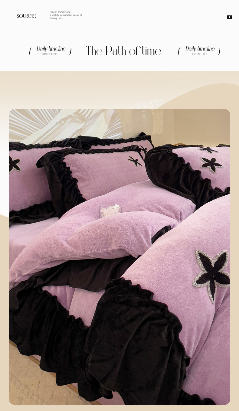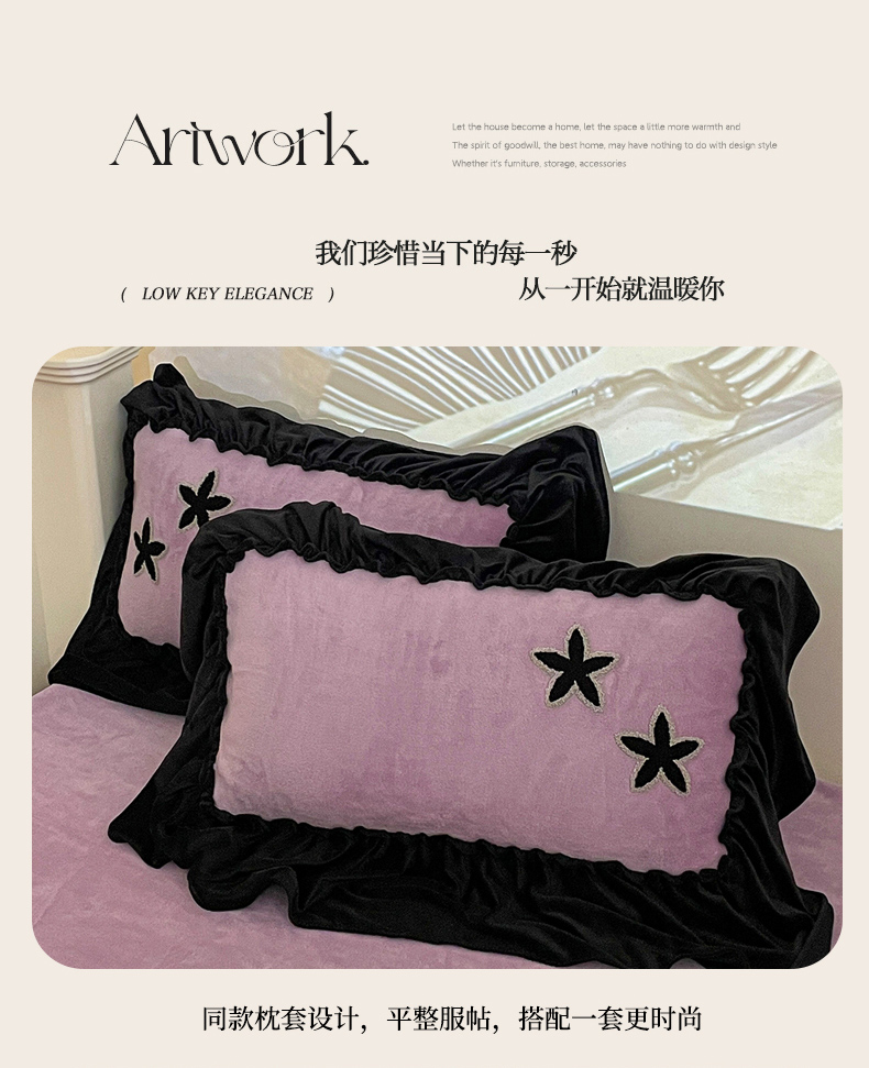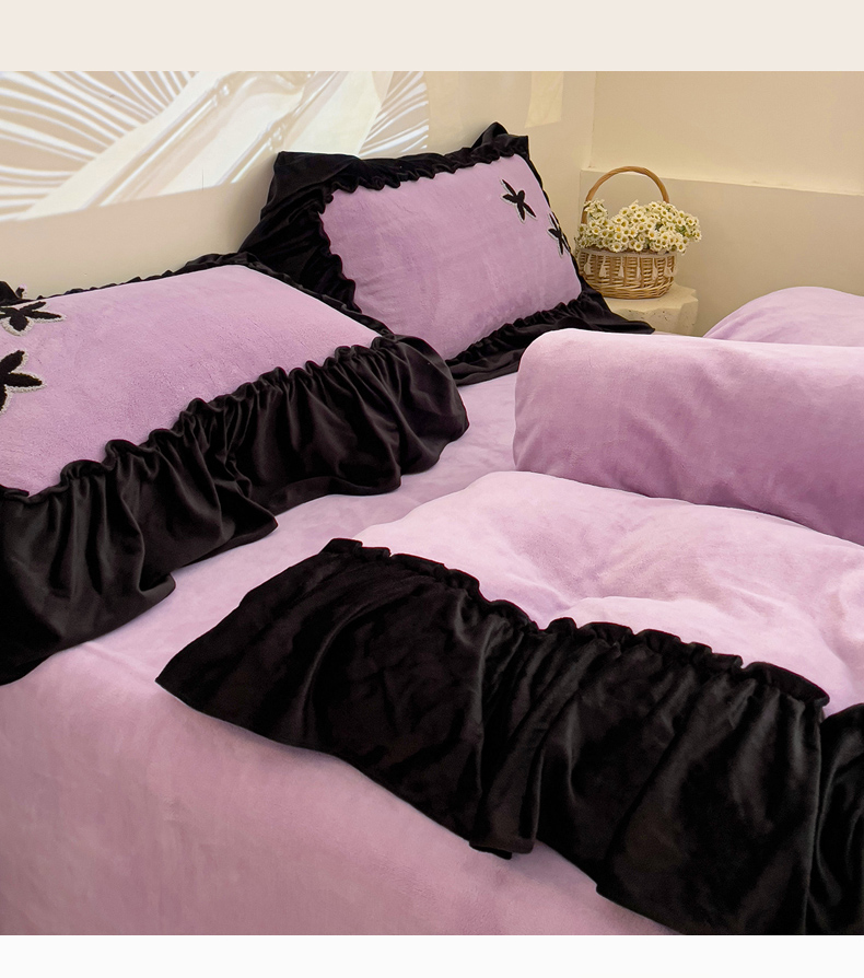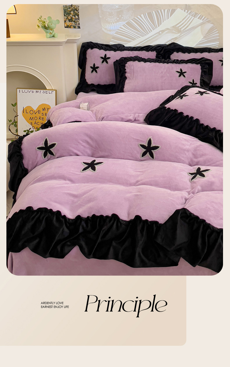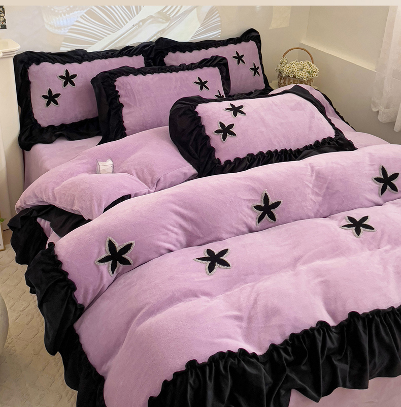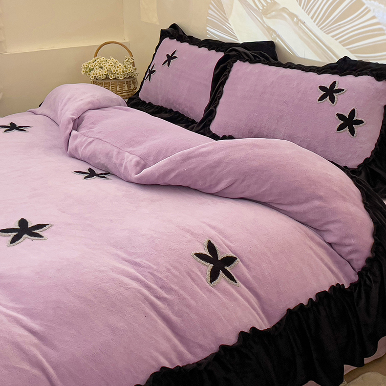 当前位置: 91家纺网 > 商品网购 > 床品套件 > 四件套 > 牛奶绒四件套 > 你好美丽 2025新款牛奶绒A类200克星愿毛巾绣花边四件套 星愿紫