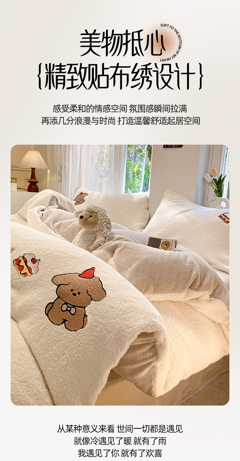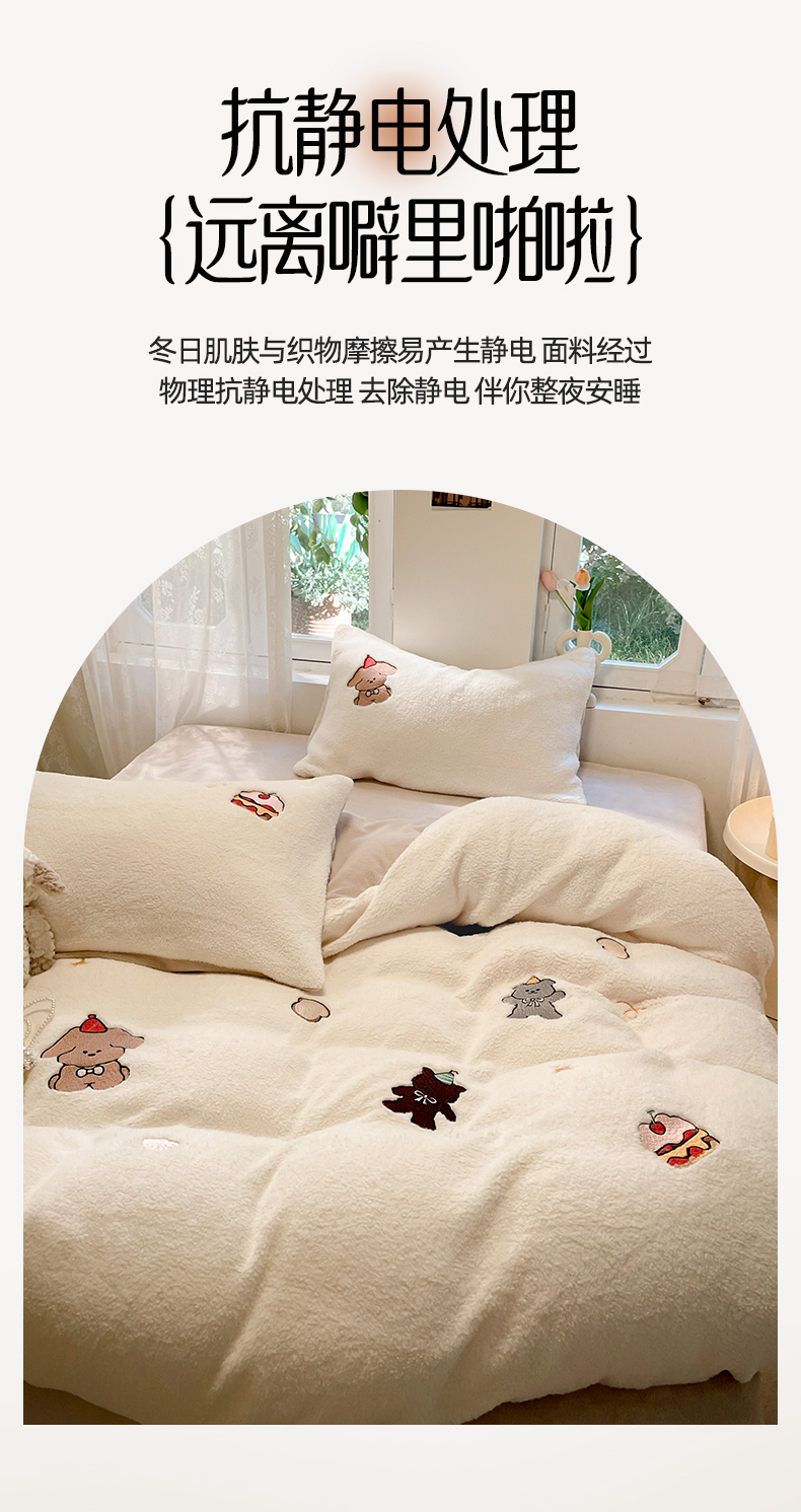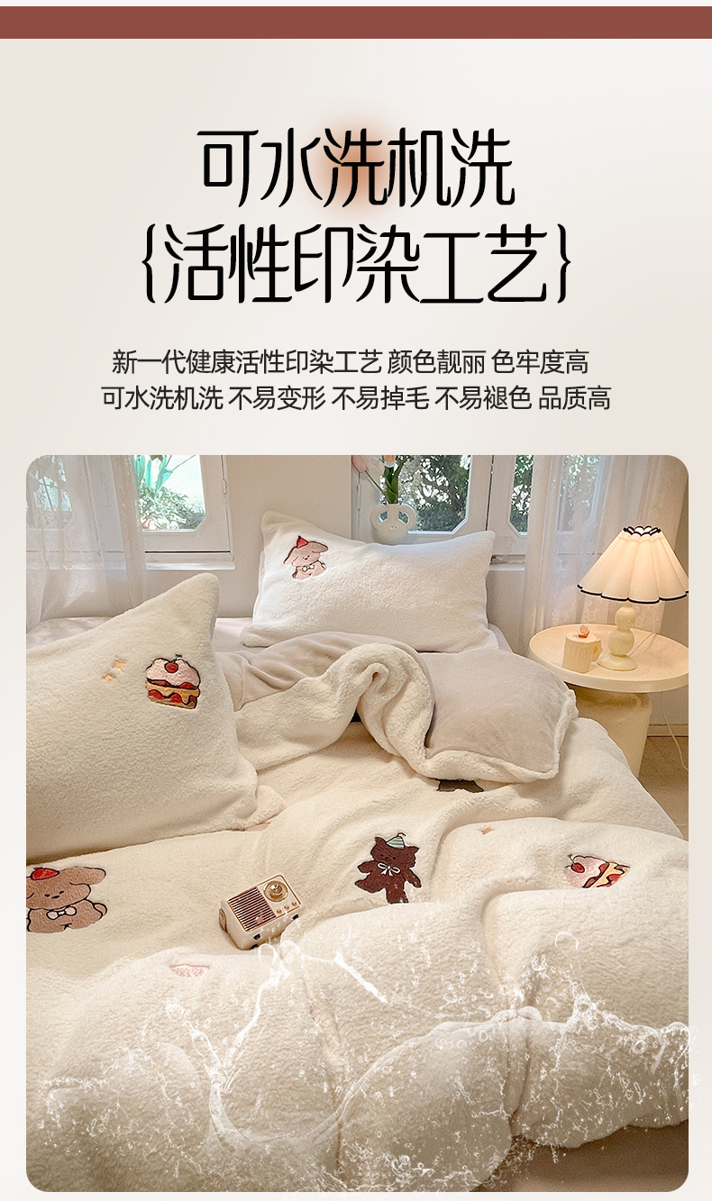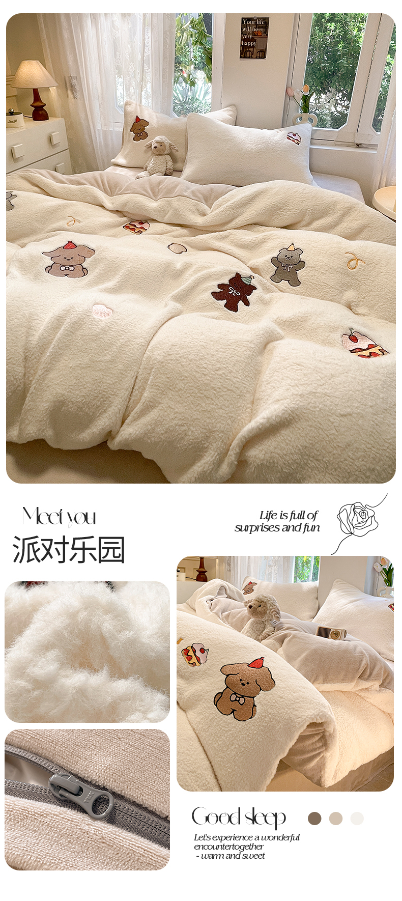 商品名称:满座家居 2025新款绵羊绒牛奶绒绣花小清新四件套 派对乐园