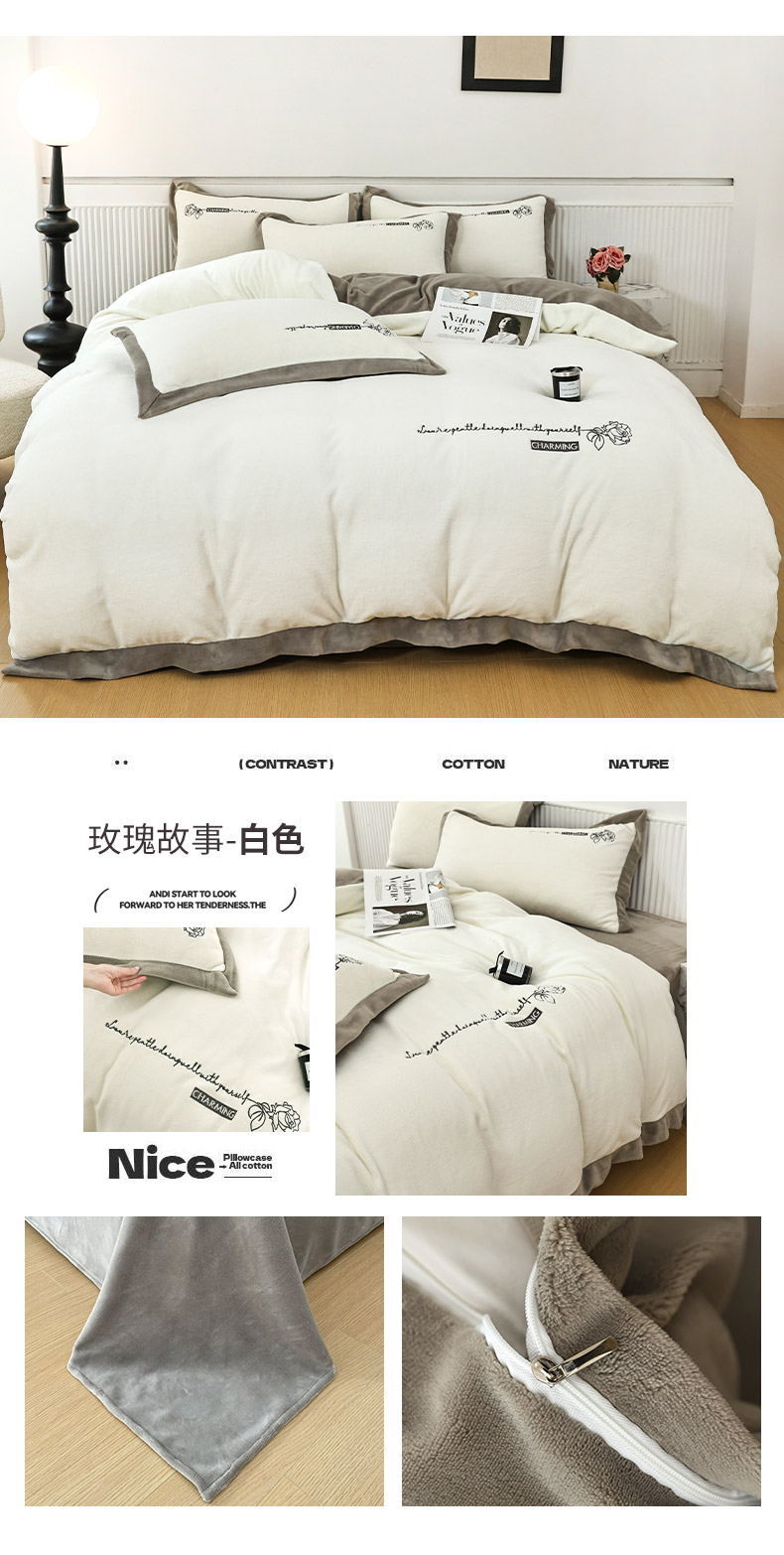 大渔生活 2025新款牛奶绒刺绣四件套-玫瑰故事 玫瑰故事-白色