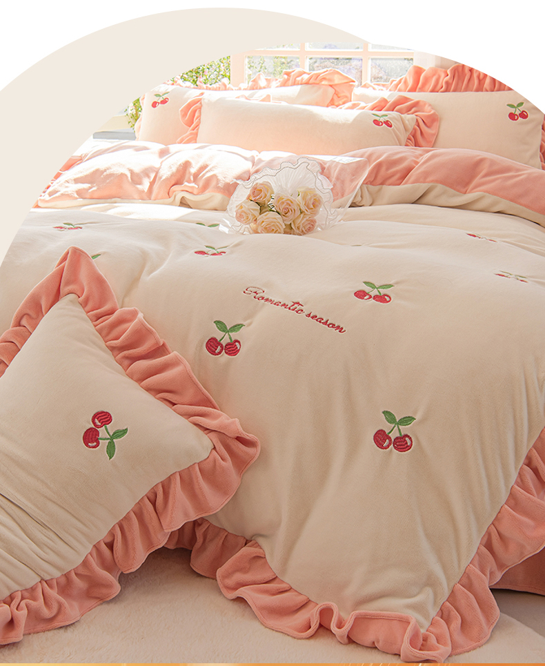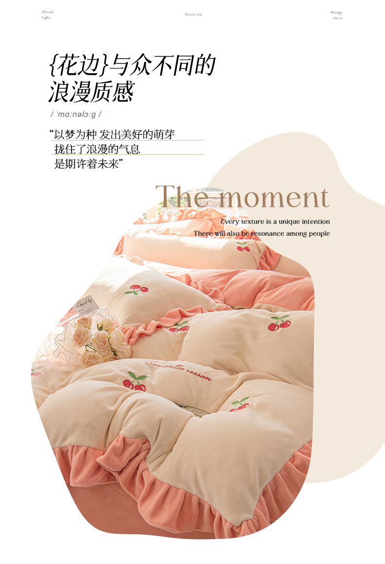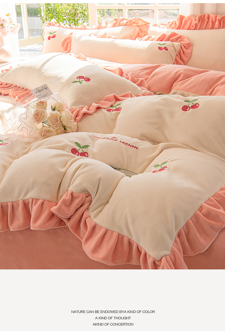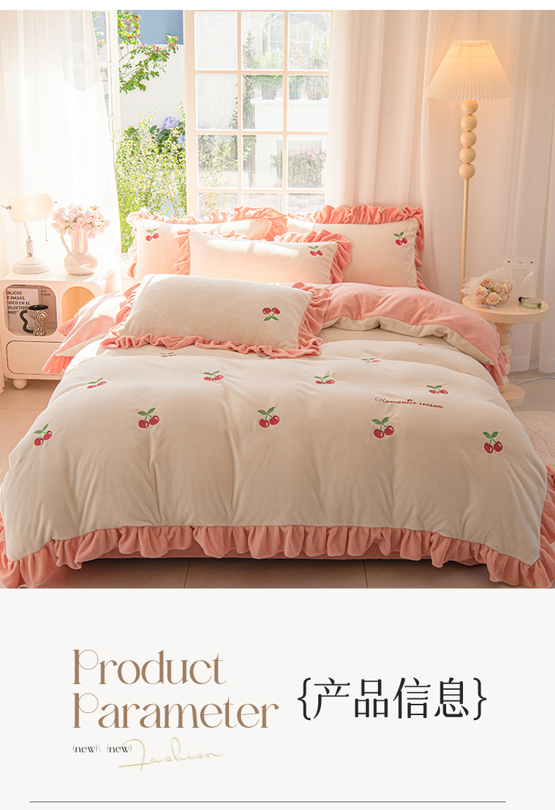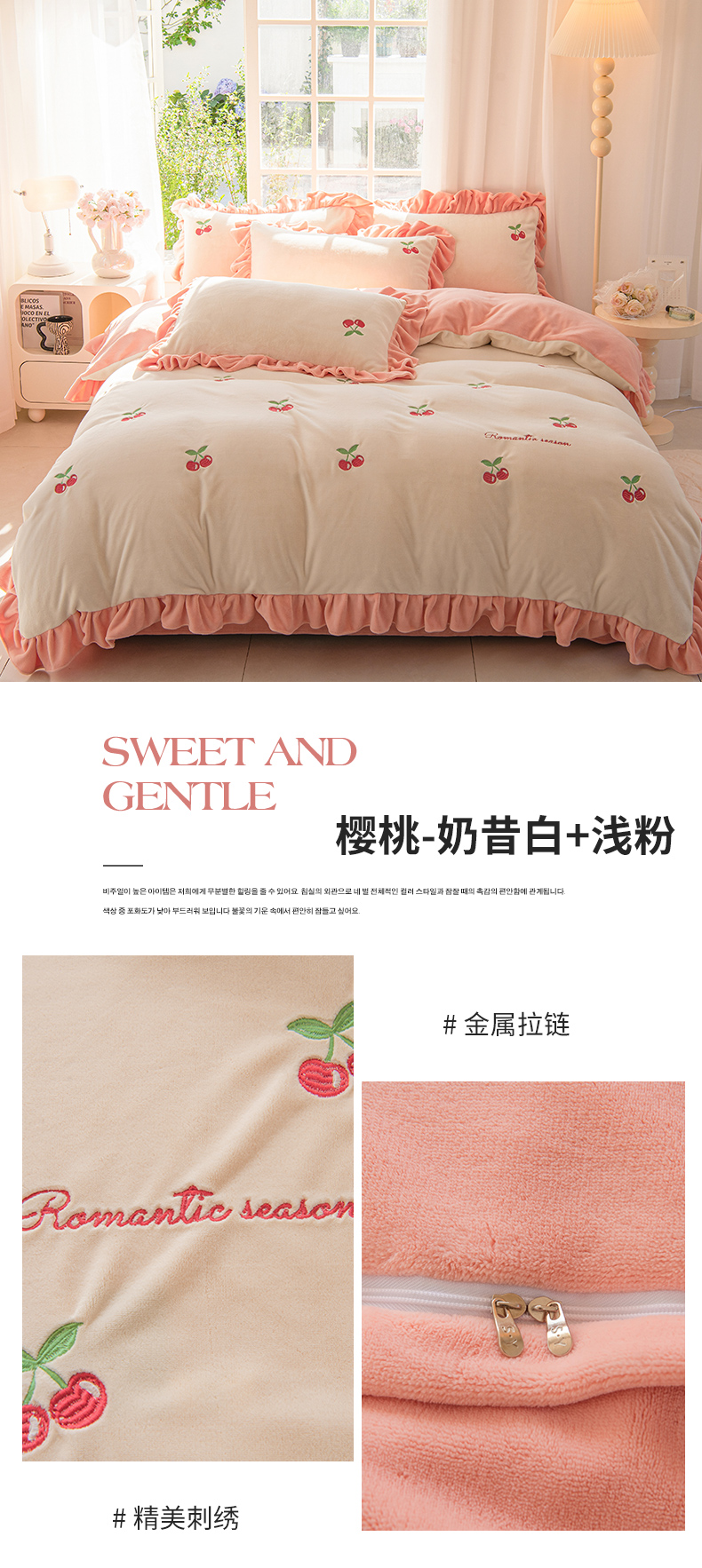 商品名称:眷恋家纺 2024新款牛奶绒花边郁金香花卉刺绣四件套 樱桃-奶昔白+浅粉