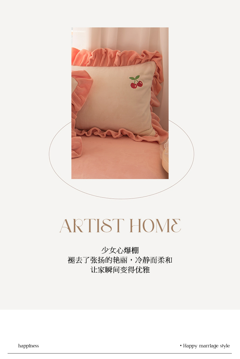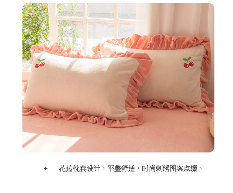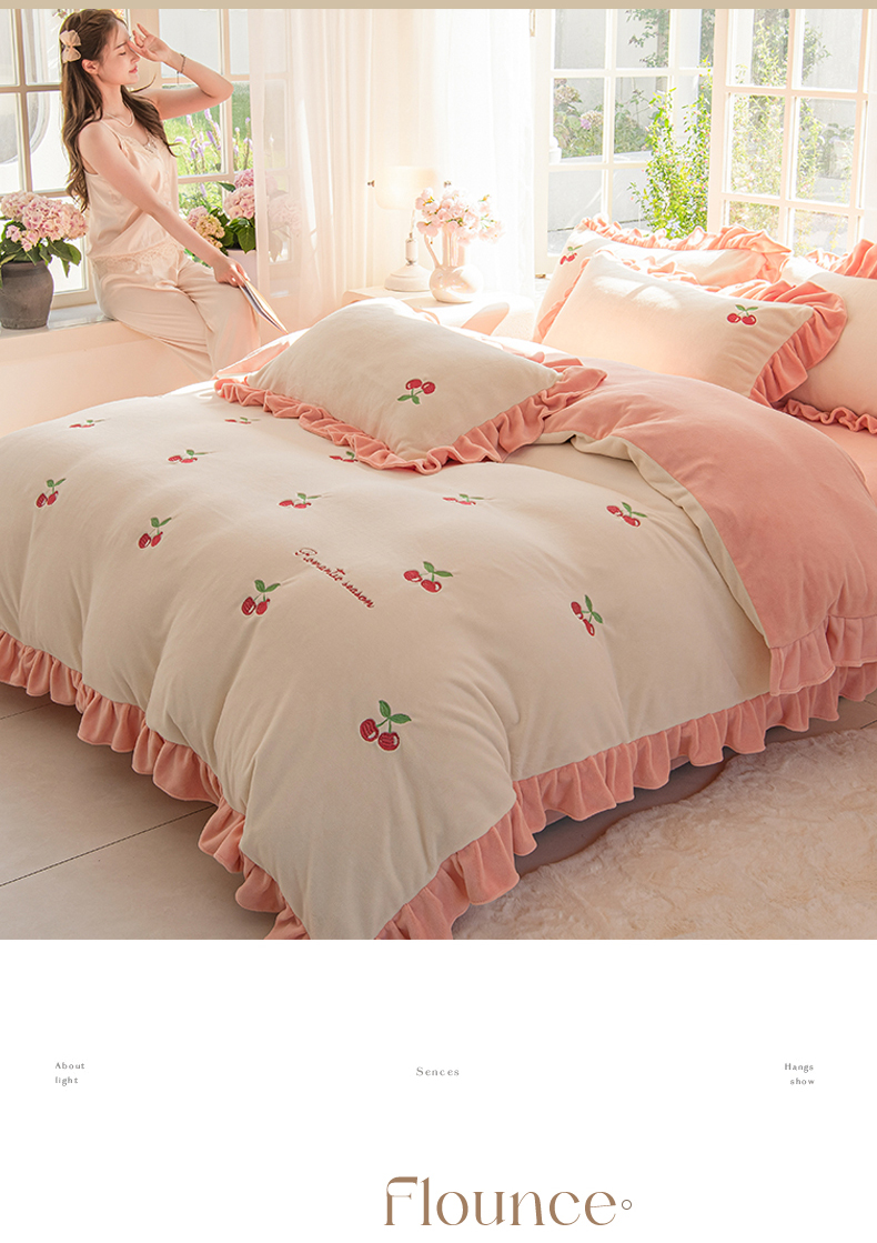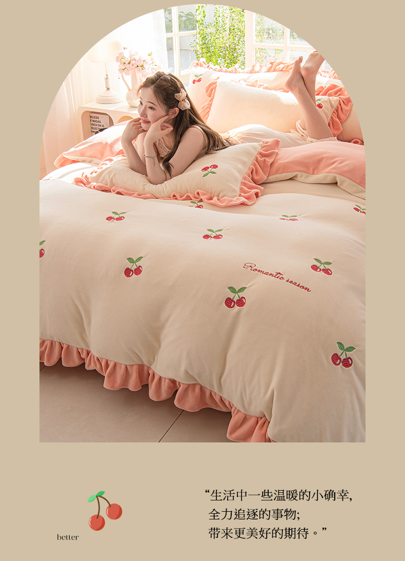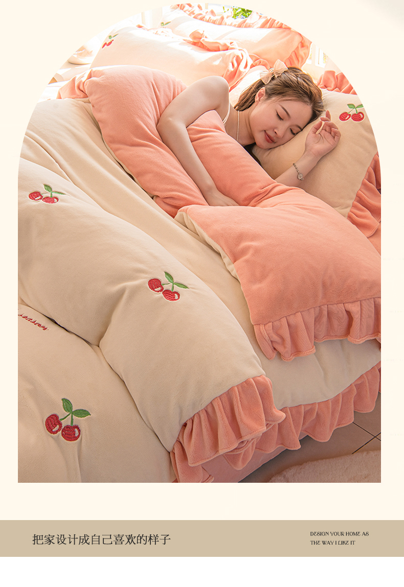 商品名称:眷恋家纺 2024新款牛奶绒花边郁金香花卉刺绣四件套 樱桃-奶昔白+浅粉