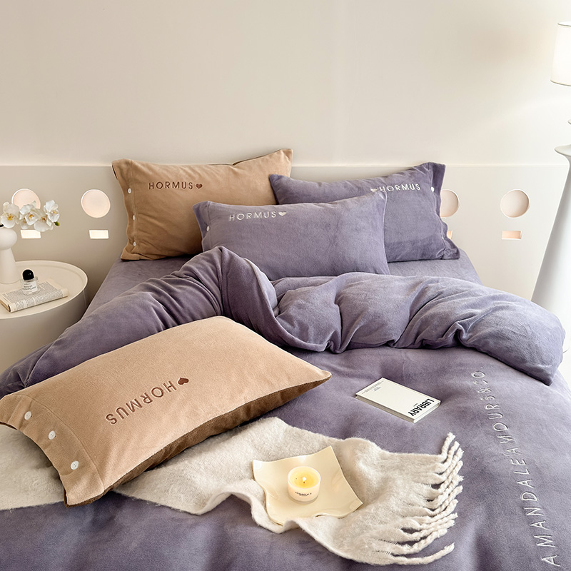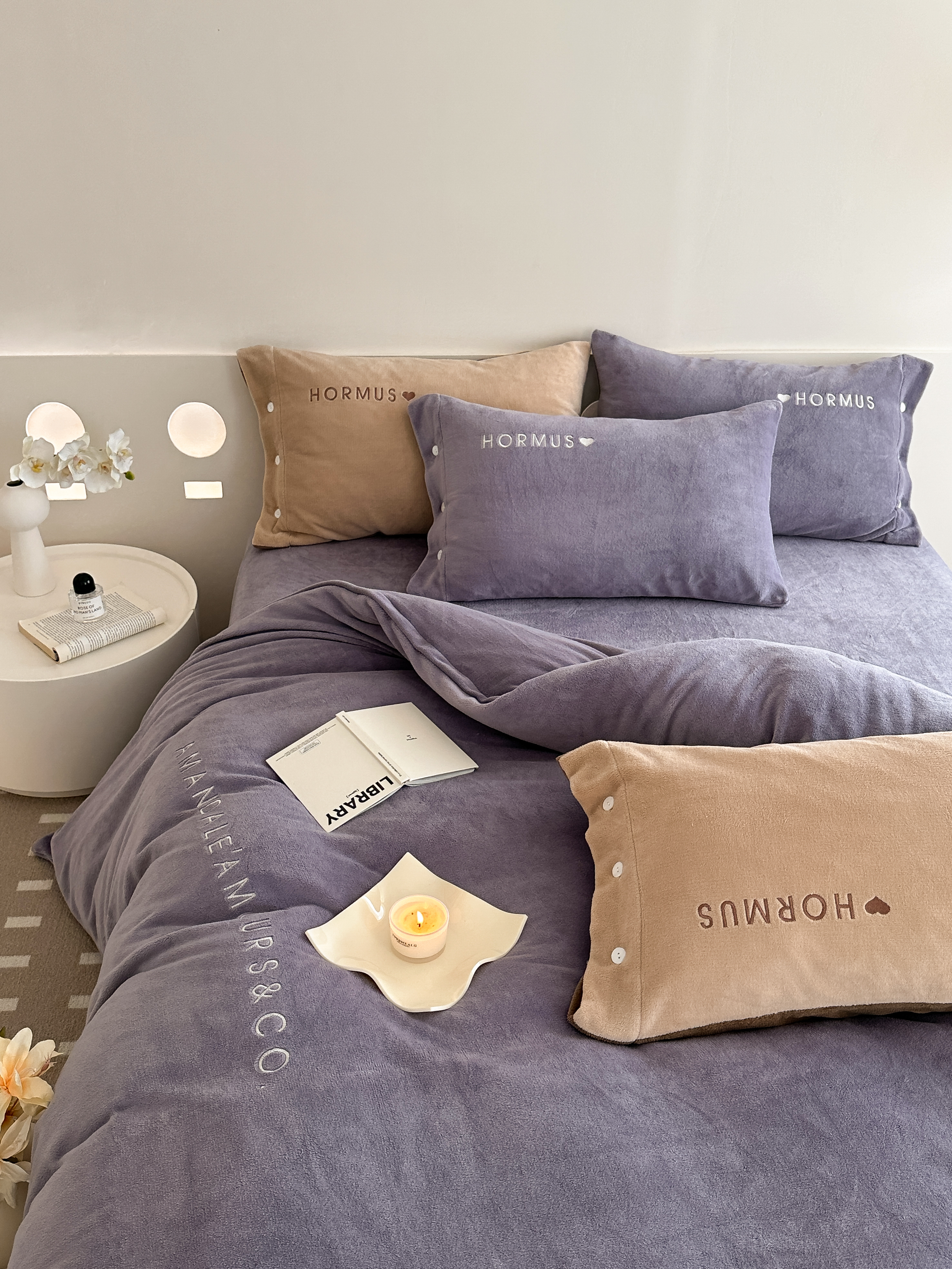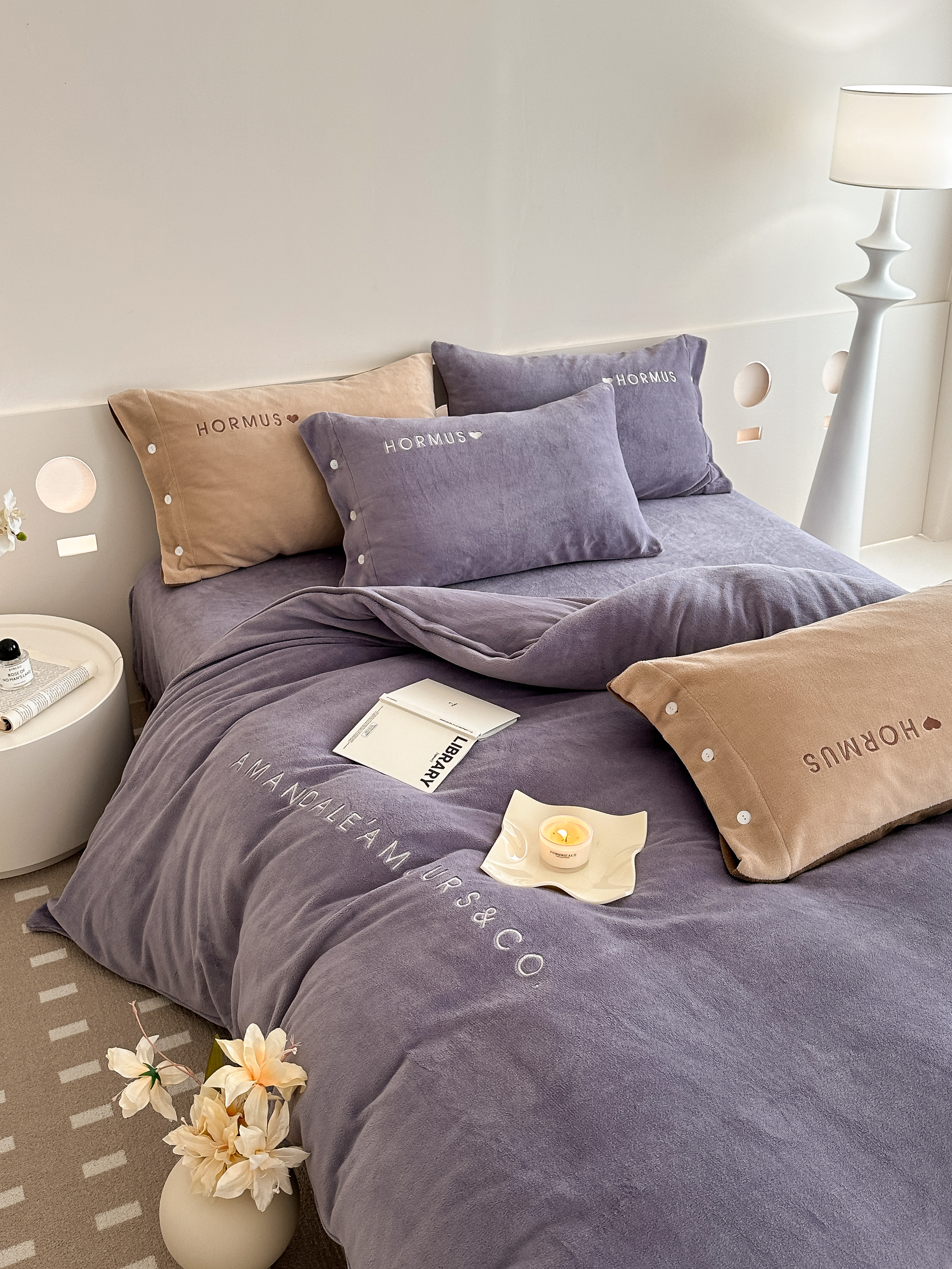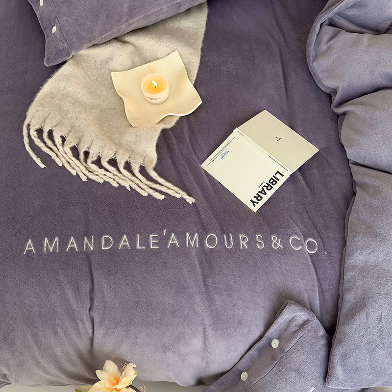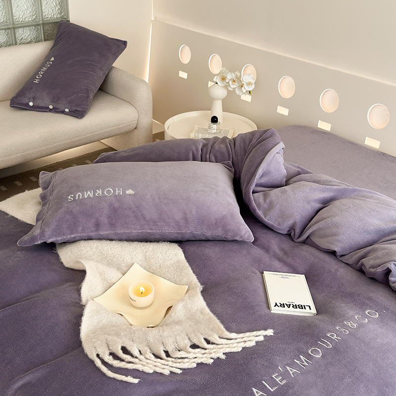 潘朵拉家纺 2024新款字母绣花纯色系列牛奶绒四件套 穆斯 莫奈紫