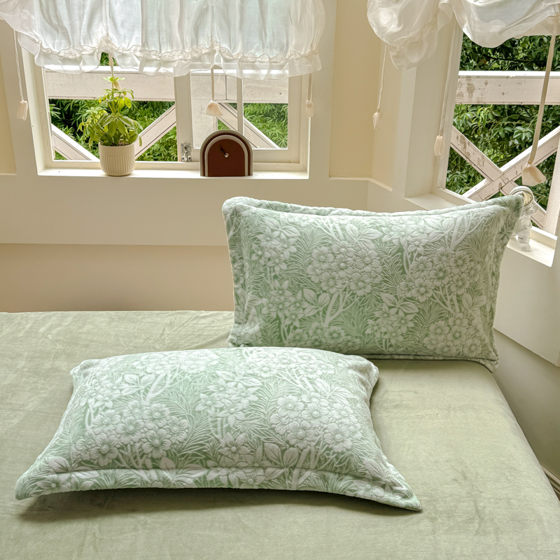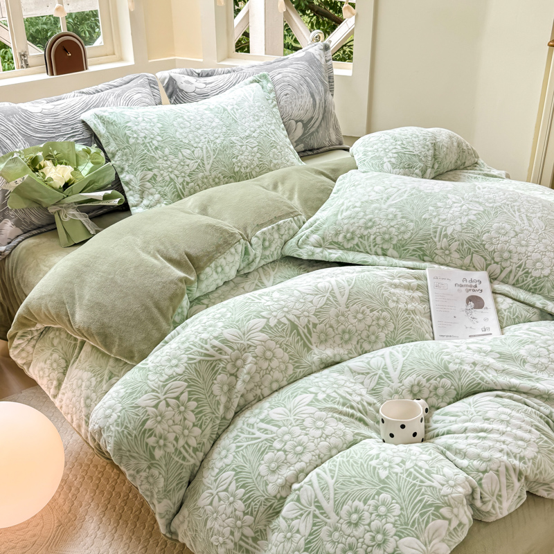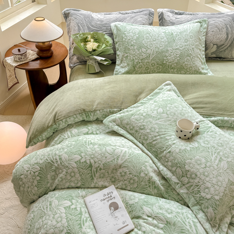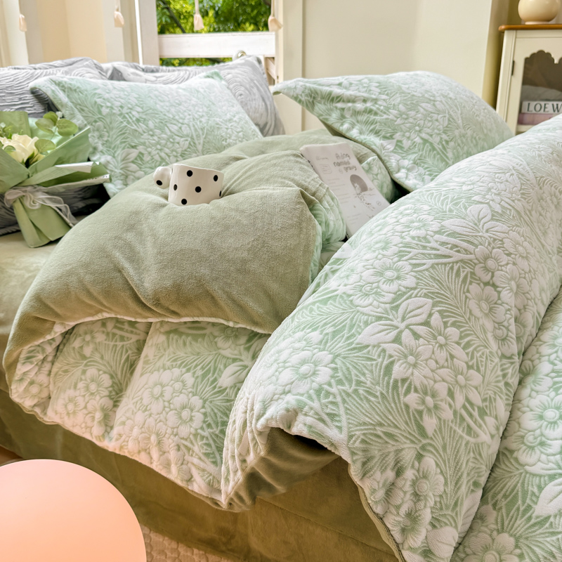 商品名称:梦莱斯 2024新款雕花牛奶绒四件套 繁花-浅绿
