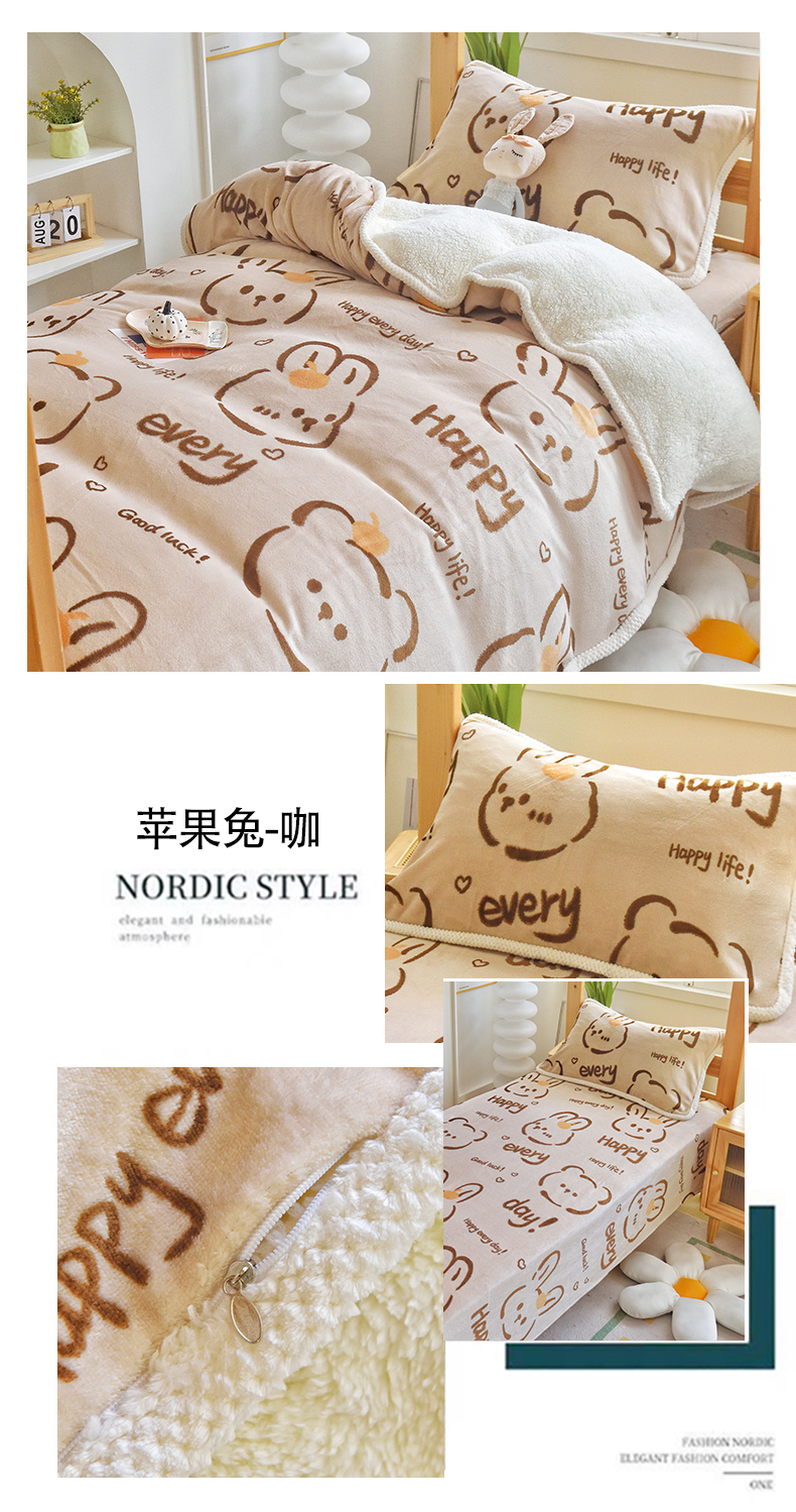 当前位置: 91家纺网 > 商品网购 > 床品套件 > 三件套 > 多乐家纺 2024新款学生宿舍牛奶绒羊羔绒三件套 苹果兔-咖