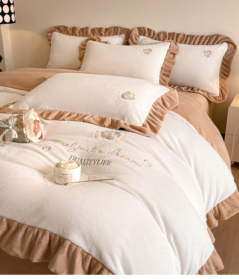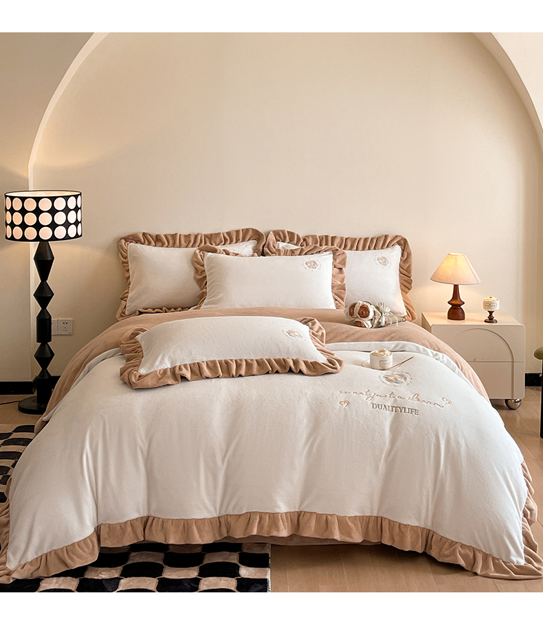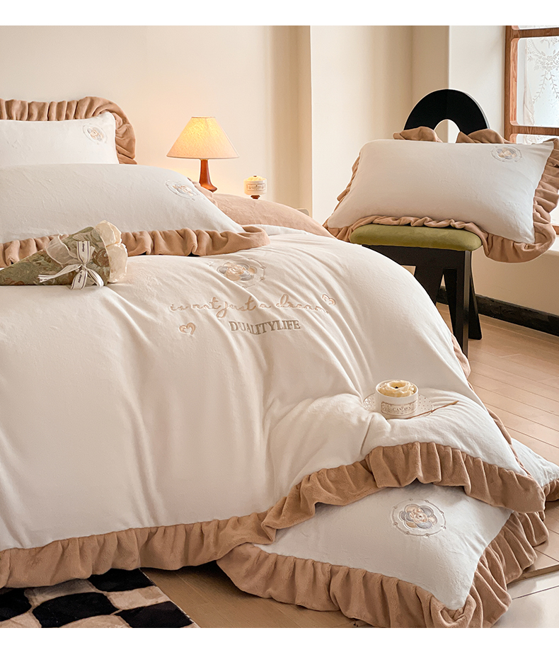 露梦家纺 2025新款A类双面木耳花边加厚保暖牛奶绒刺绣款四件套-繁花系列(提供买家秀) 繁花-奶油白