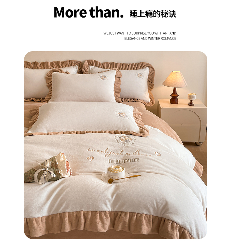 露梦家纺 2025新款加厚保暖牛奶绒刺绣款四件套-轻羽(风格二) 轻羽-桃夭粉,轻羽-桃夭粉