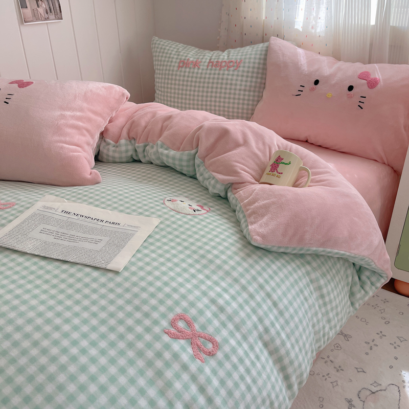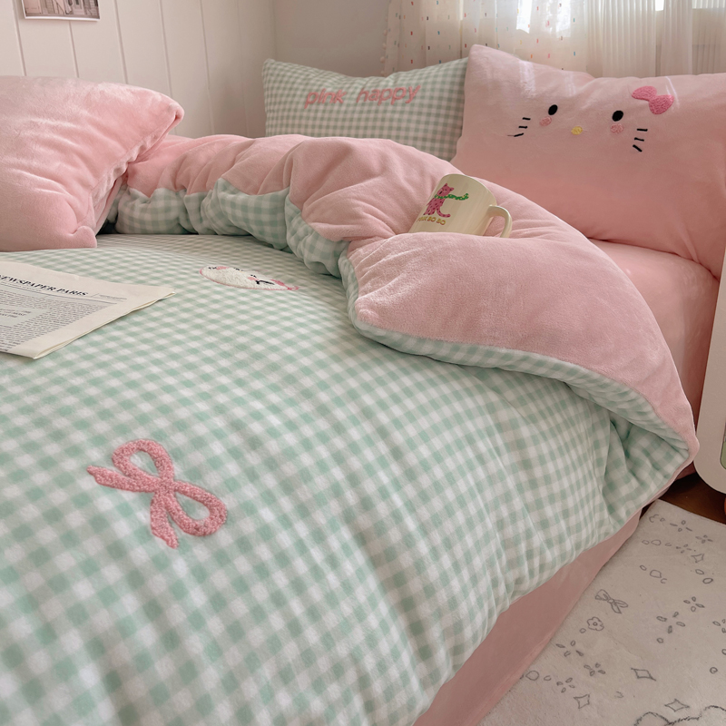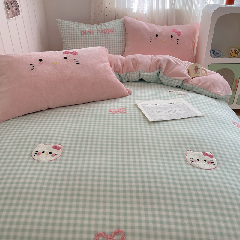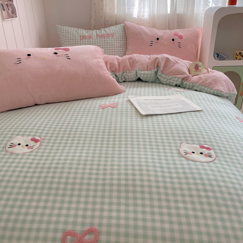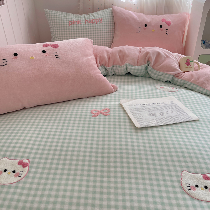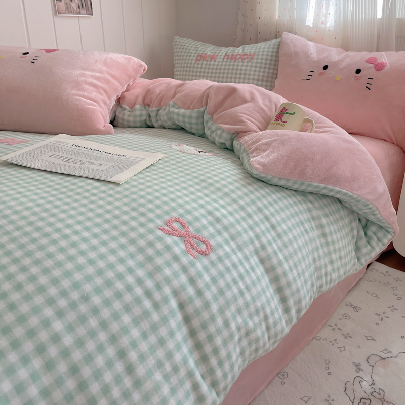 顾里家纺 2024秋冬新款格子猫咪毛巾绣牛奶绒四件套 绿格猫咪