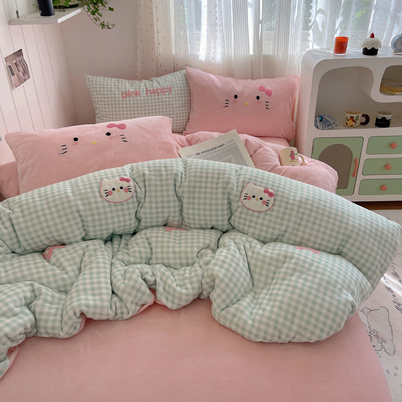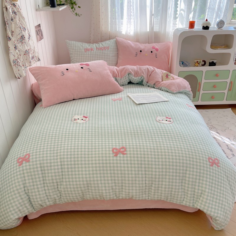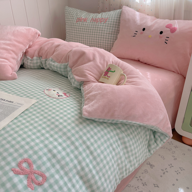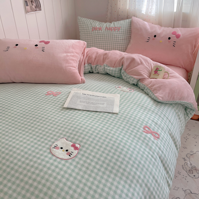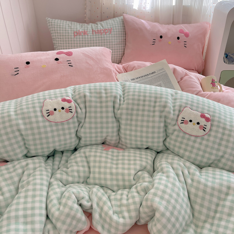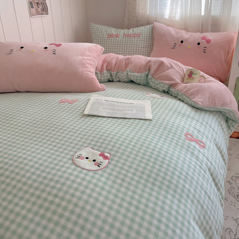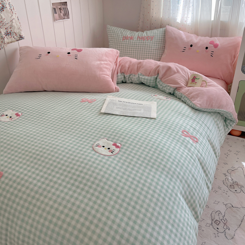 顾里家纺 2024秋冬新款格子猫咪毛巾绣牛奶绒四件套 绿格猫咪