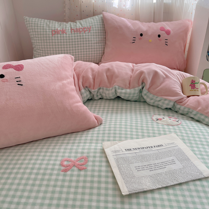 商品名称:顾里家纺 2024秋冬新款格子猫咪毛巾绣牛奶绒四件套 绿格猫咪