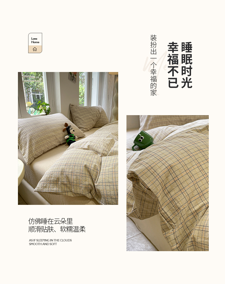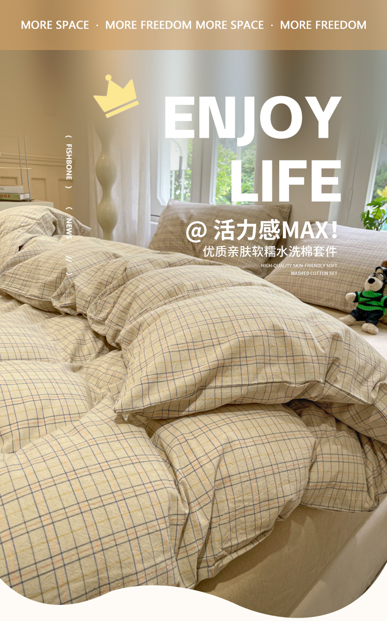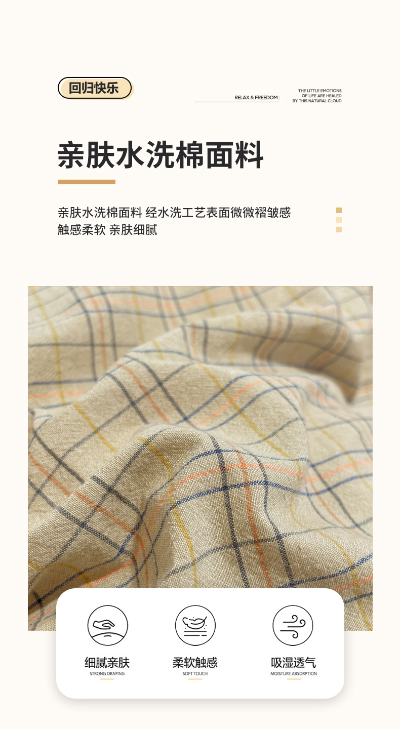 (总)欣晴家纺 2025新款软糯糯亲肤水洗棉条纹格子三件套四件套,海盐纹,风织线,复古格,灰序曲,旧时光,木年轮,奶霜条,云糖纹,云影格