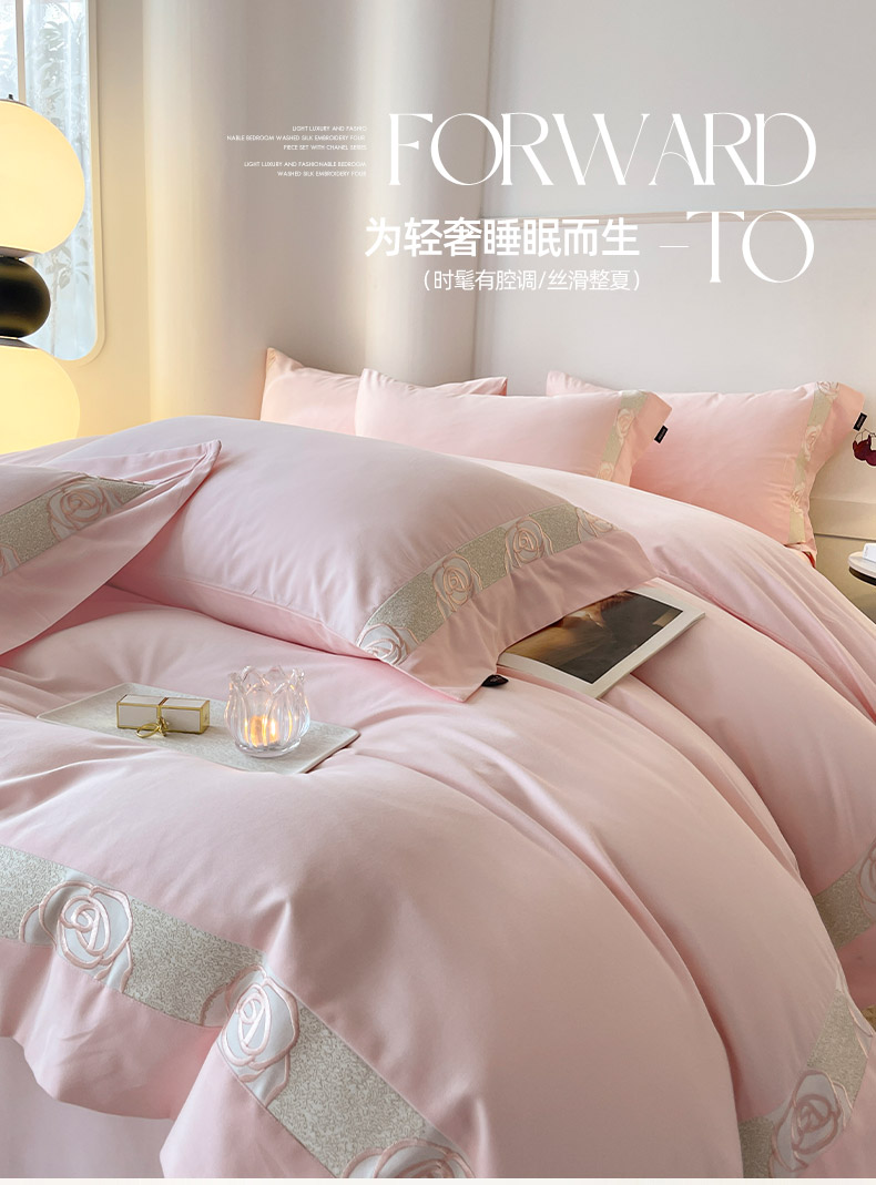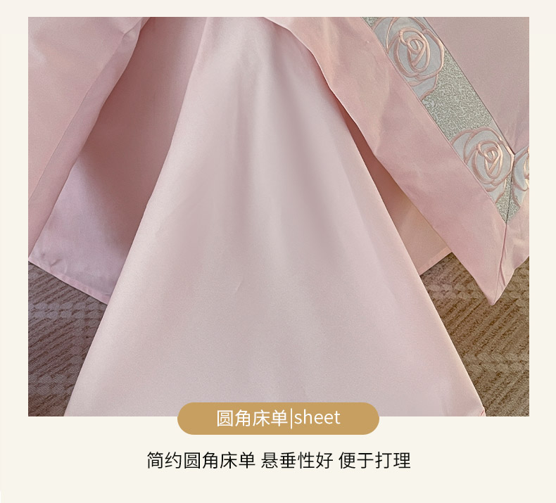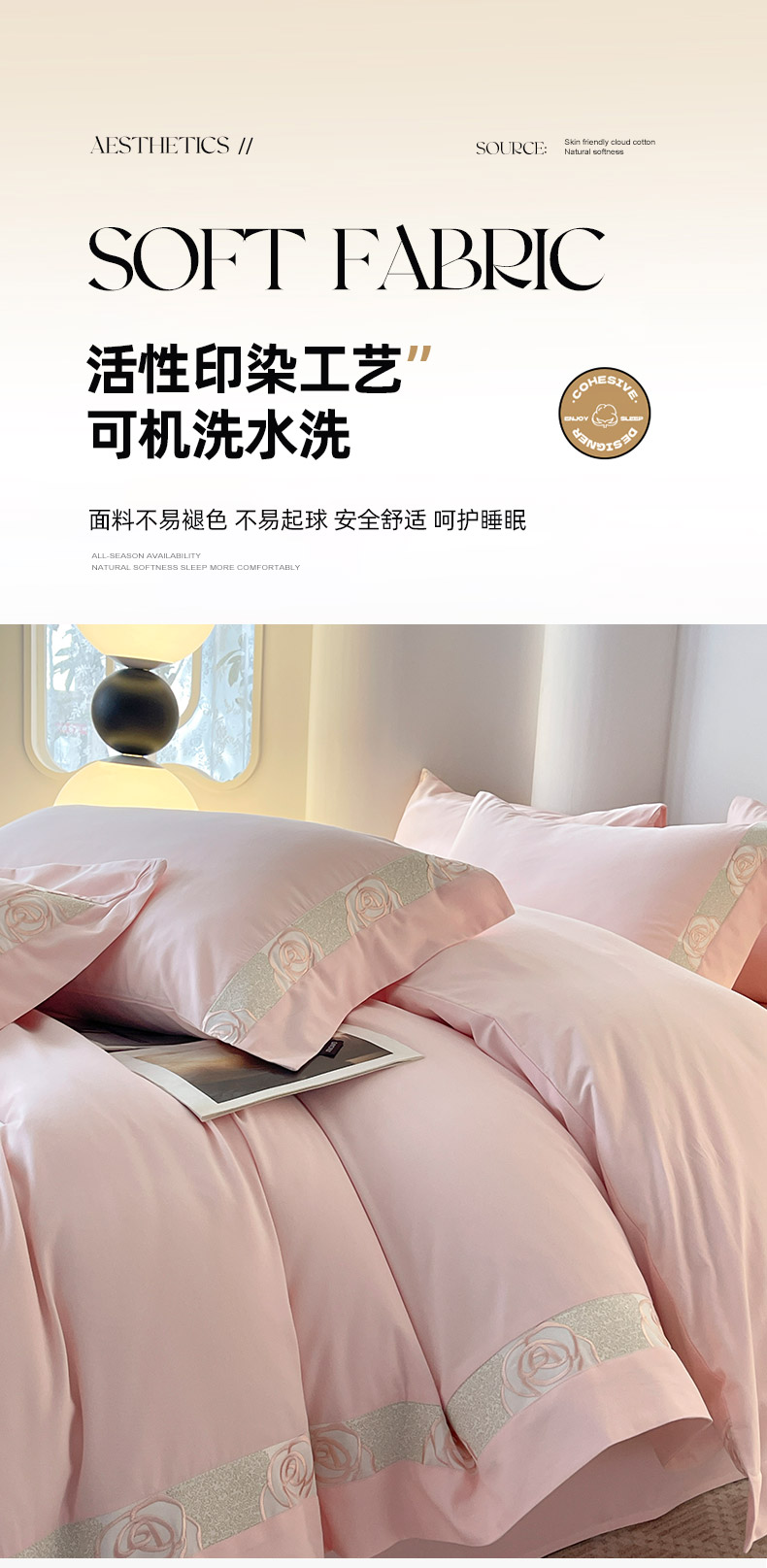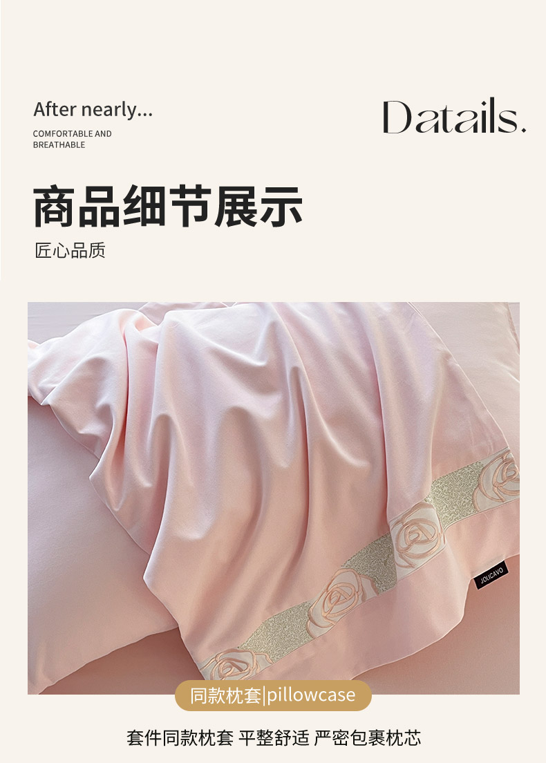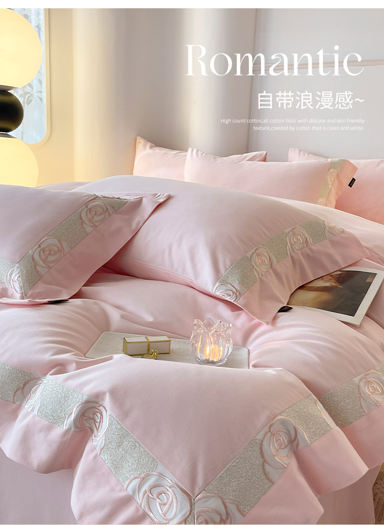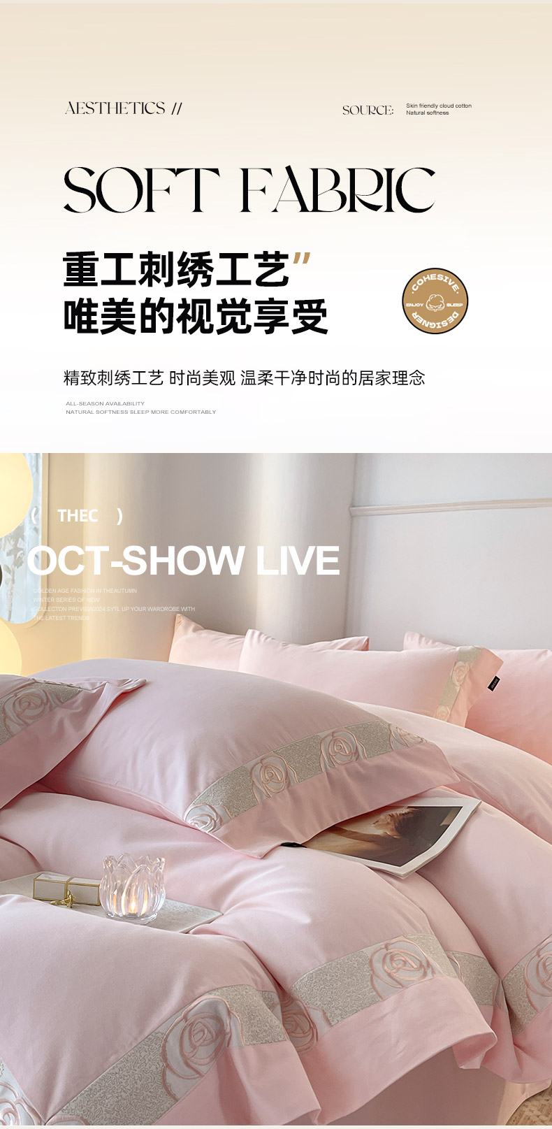 商品名称: 2024新款秋冬高端全棉加厚磨毛四件套刺绣轻奢高级亲肤裸睡爆款床单被套床笠款床上用品 花韵颜粉