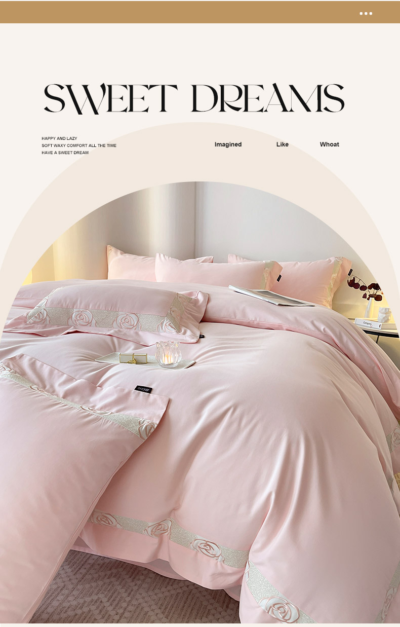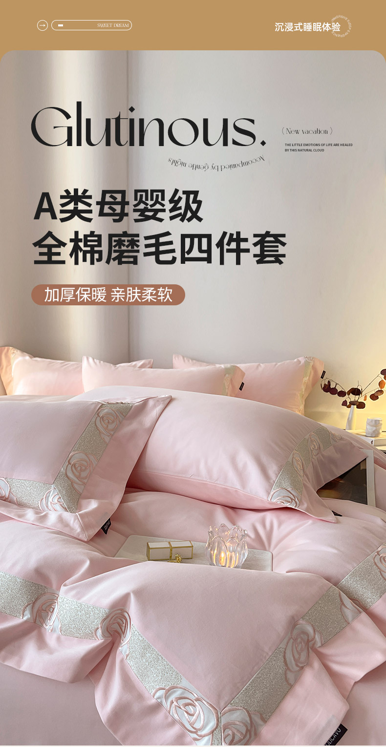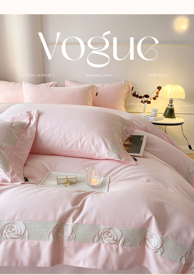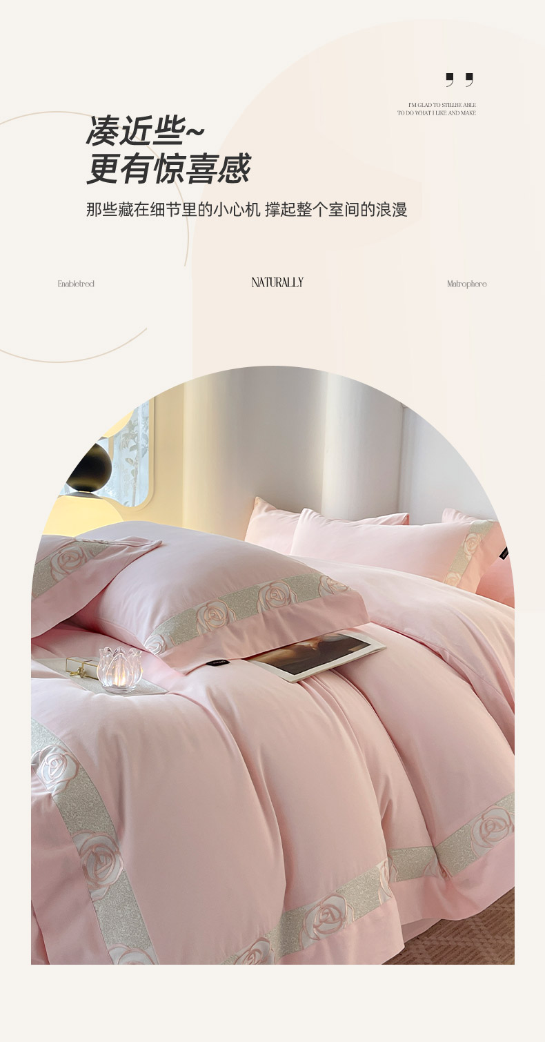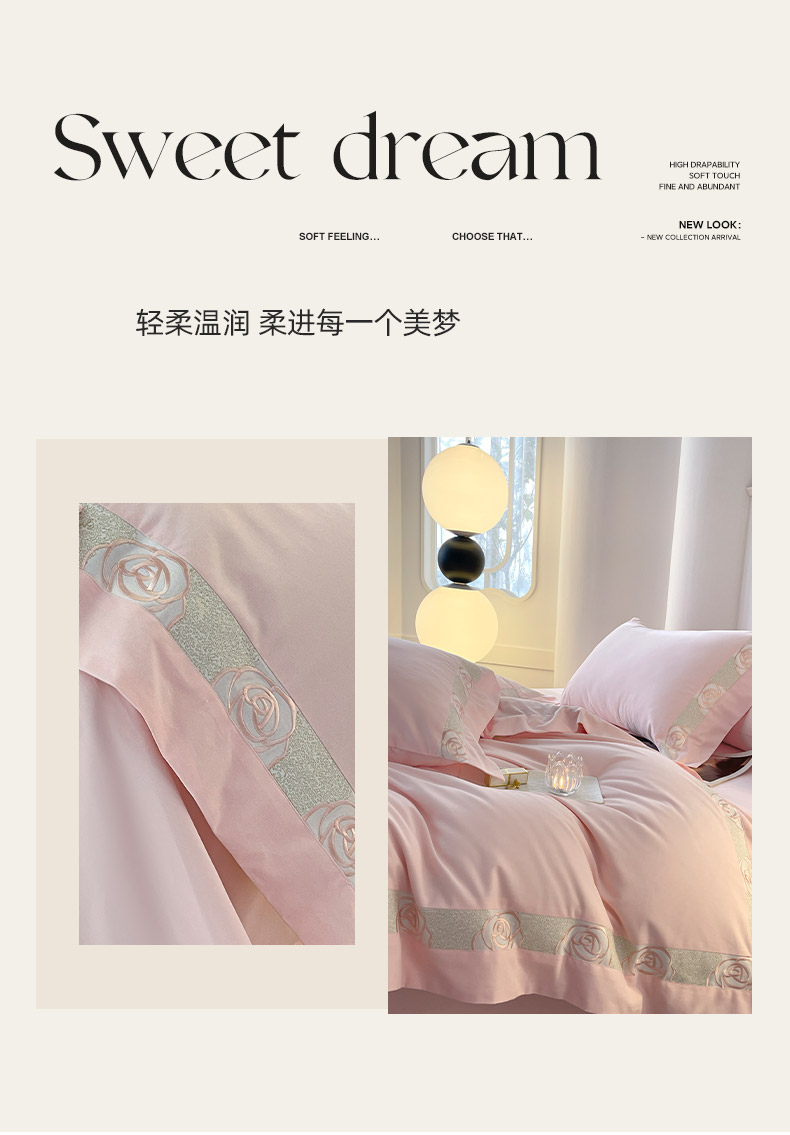 商品名称: 2024新款秋冬高端全棉加厚磨毛四件套刺绣轻奢高级亲肤裸睡爆款床单被套床笠款床上用品 花韵颜粉
