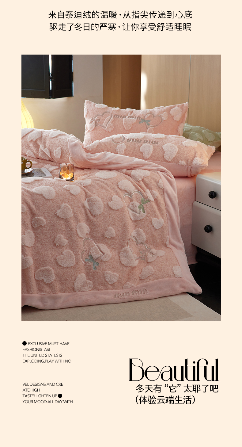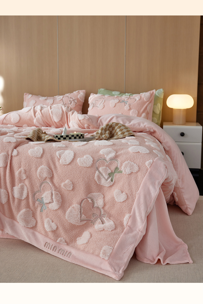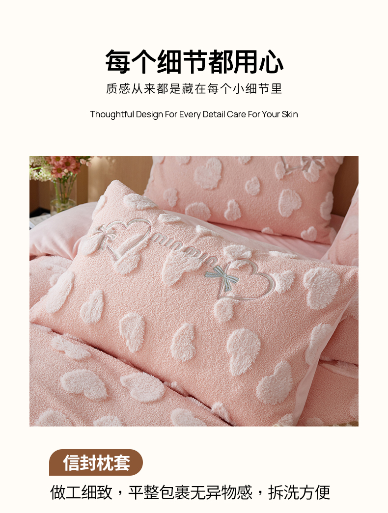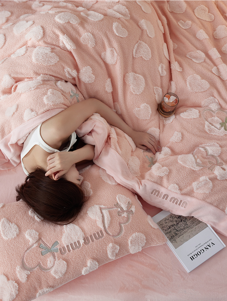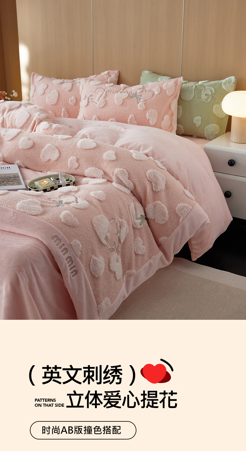 安莱生活 2024新款minmin泰迪绒立体提花爱心四件套 爱心绒-樱花粉