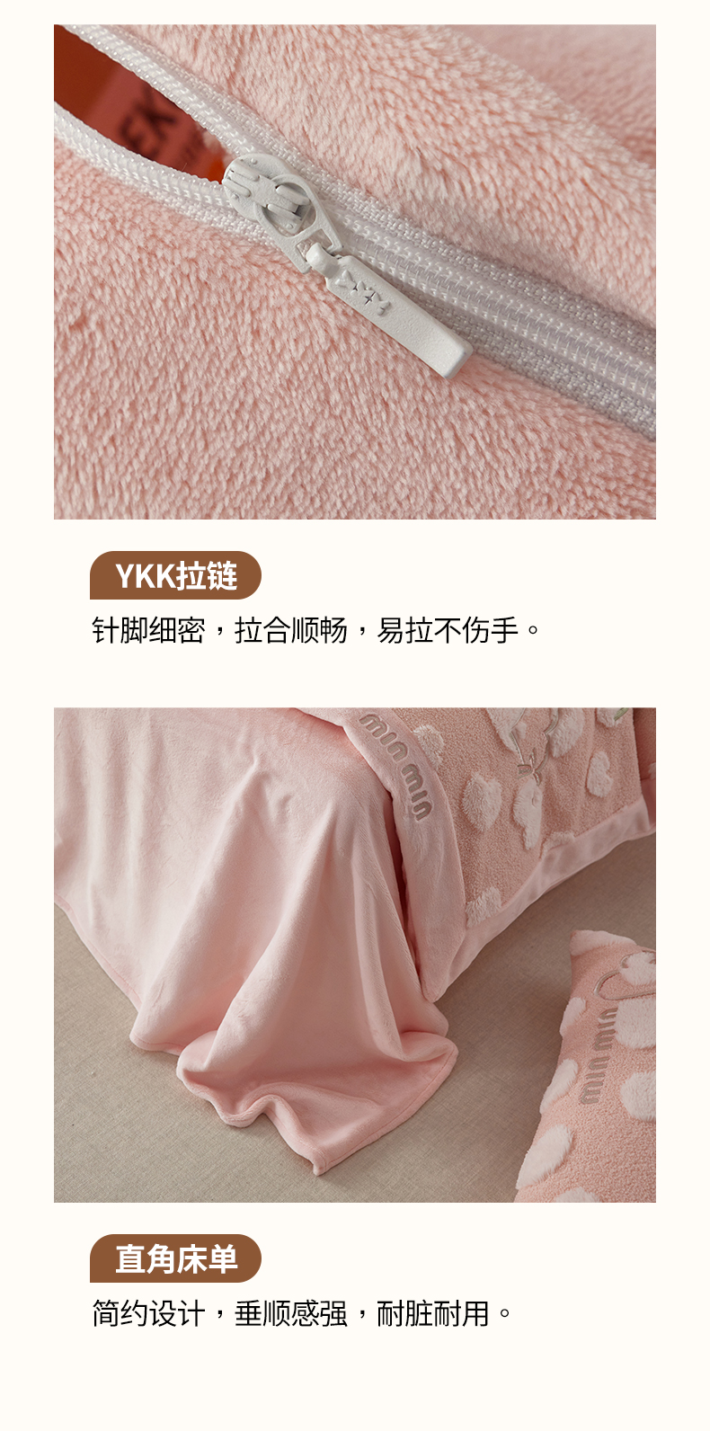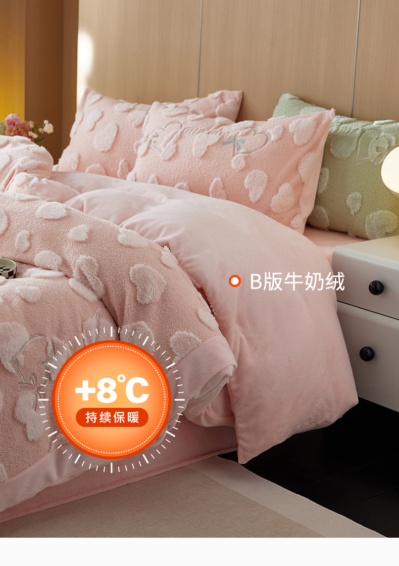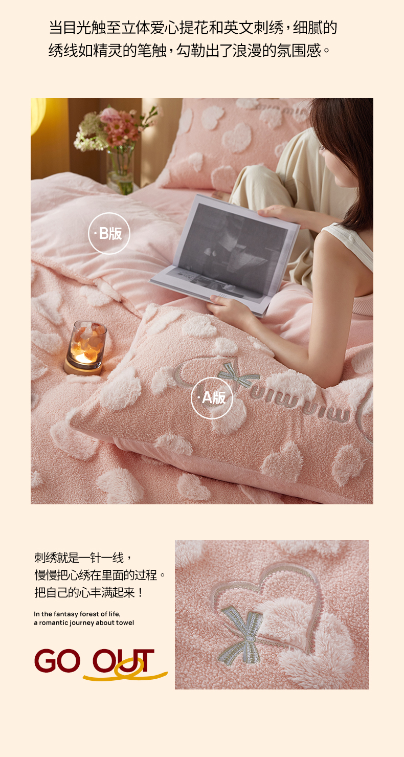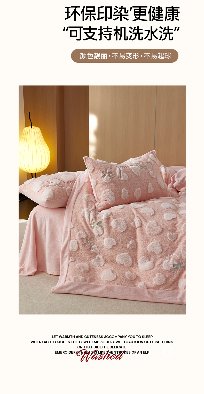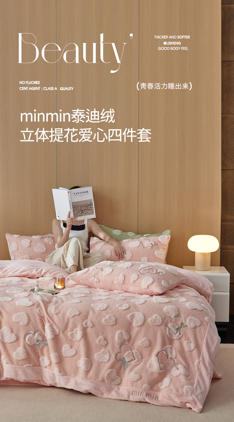 安莱生活 2024新款minmin泰迪绒立体提花爱心四件套 爱心绒-樱花粉