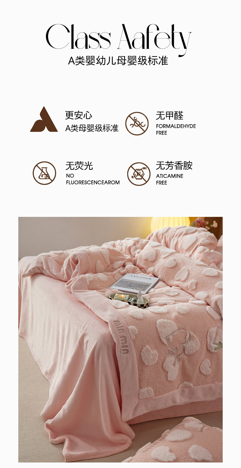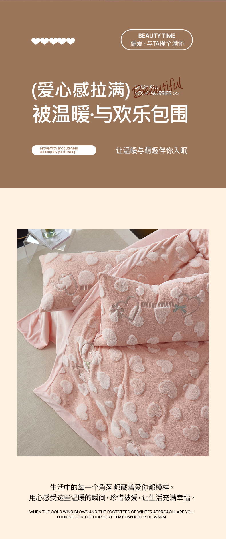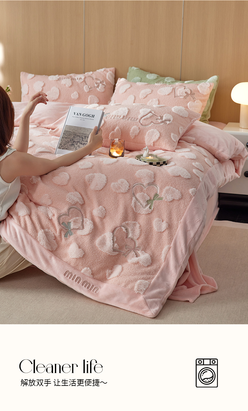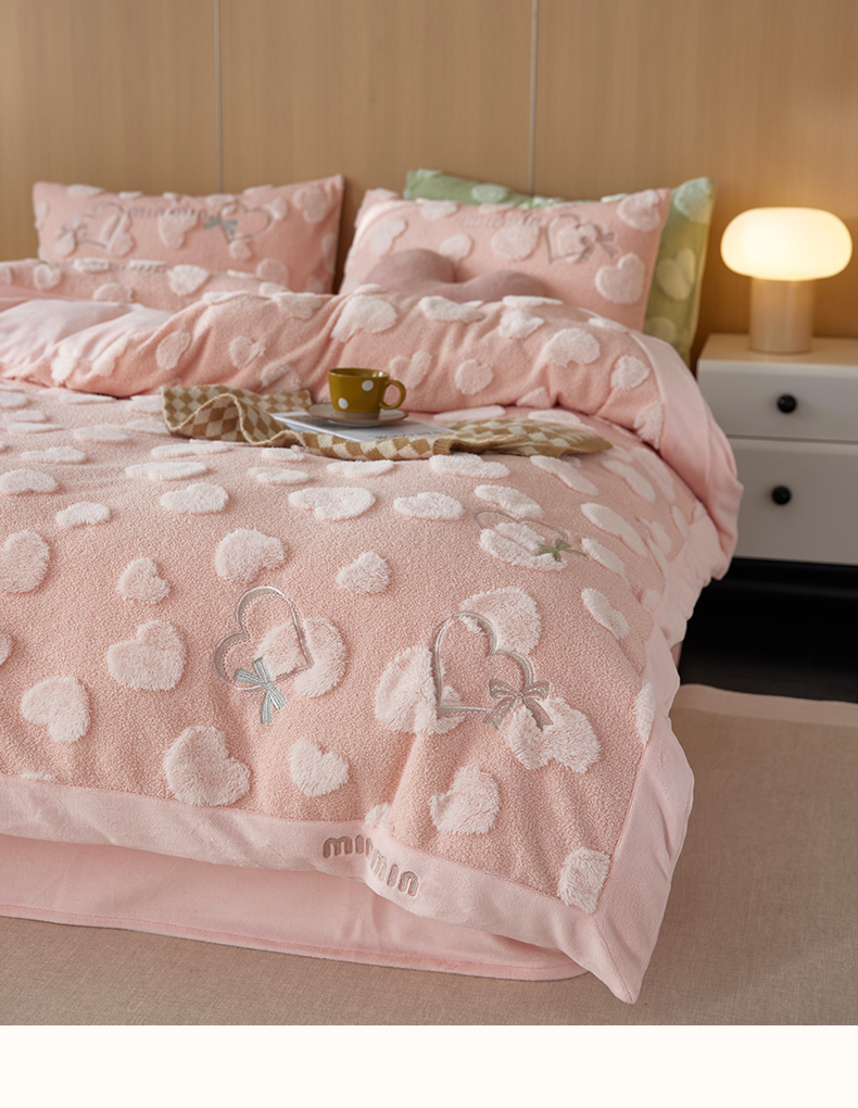 商品名称:安莱生活 2024新款minmin泰迪绒立体提花爱心四件套 爱心绒-樱花粉