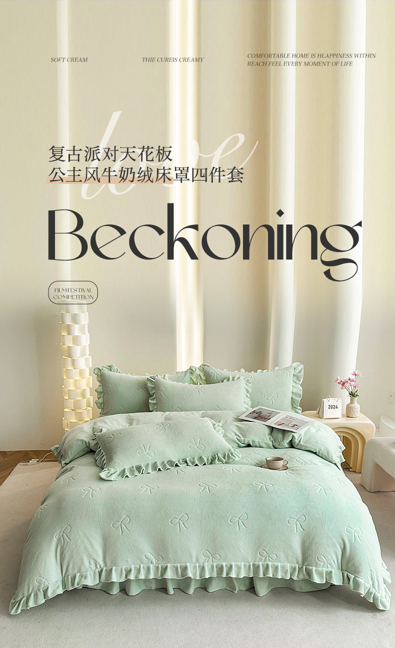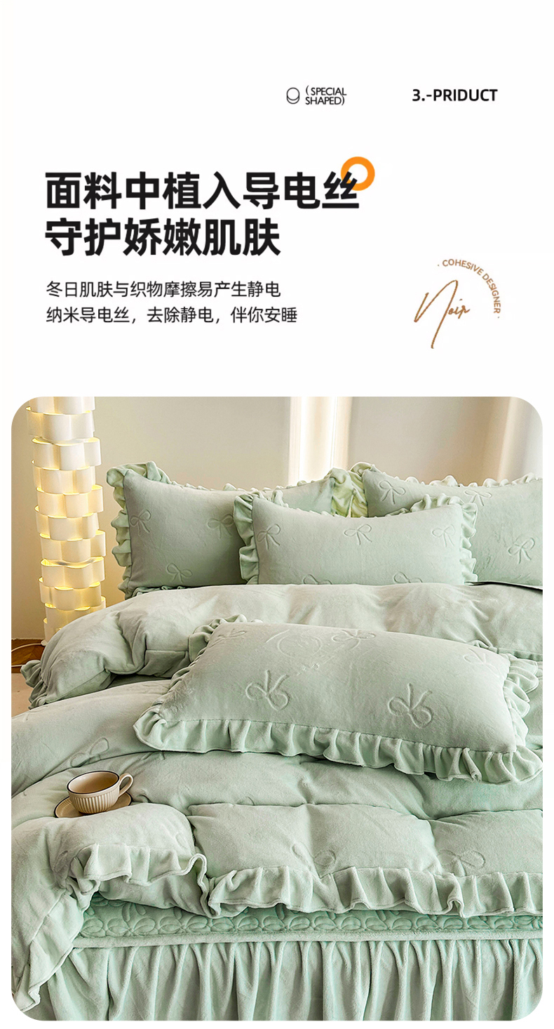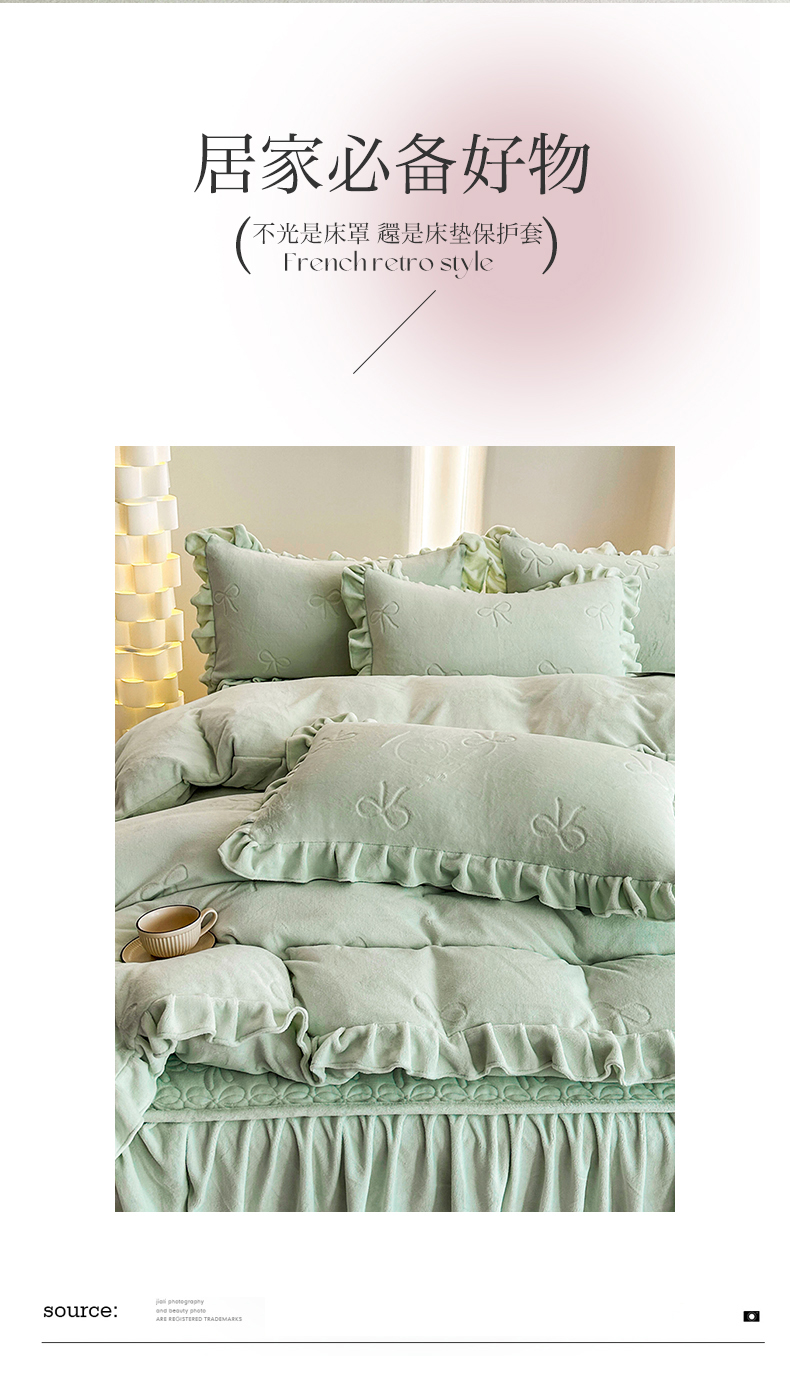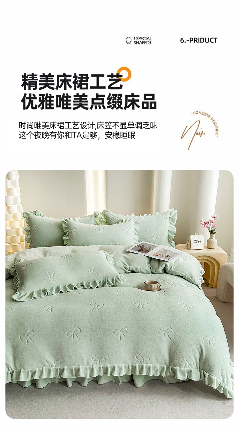 商品名称:乐嘉盈 2025新款公主风牛奶绒床罩四件套 浅绿