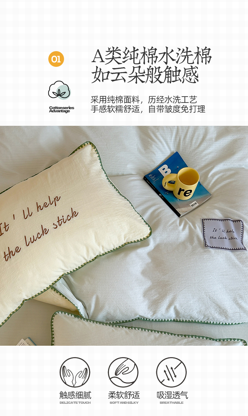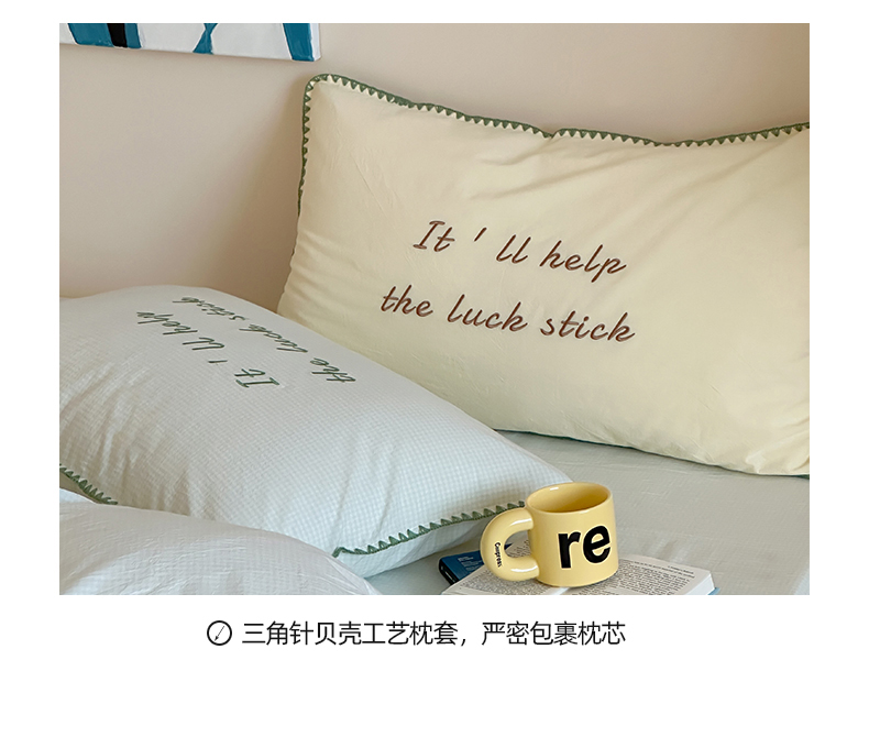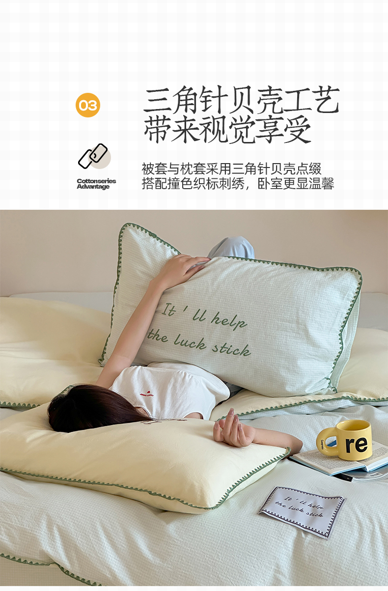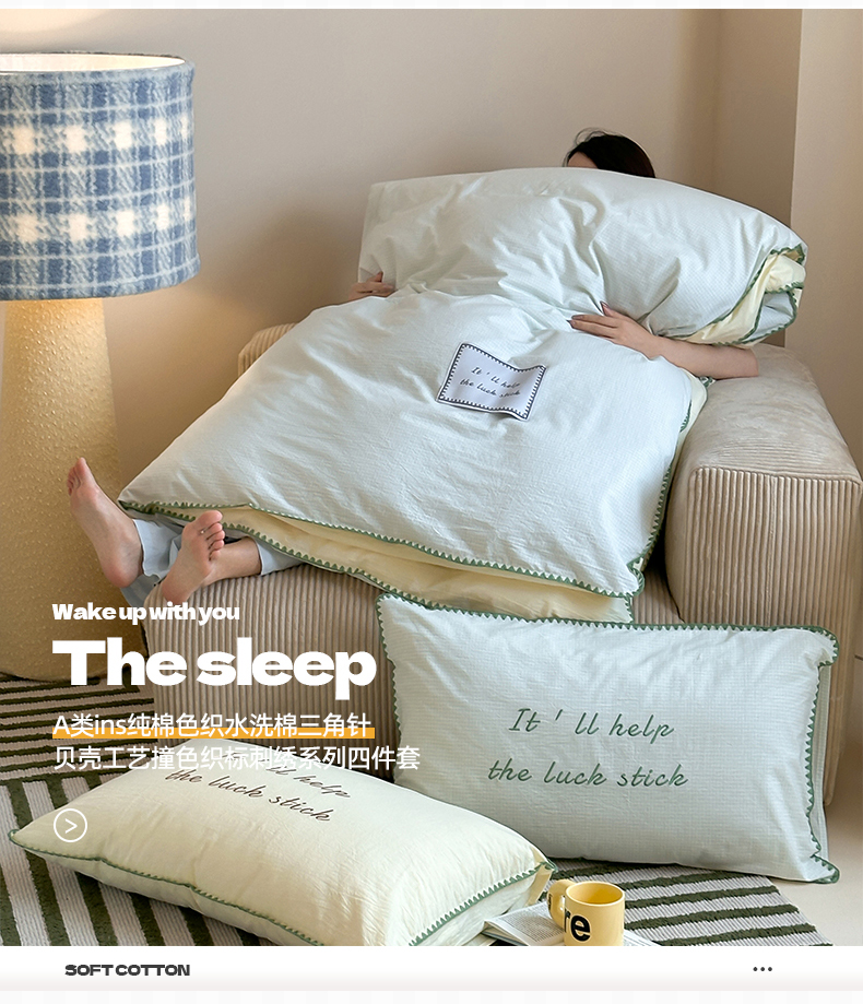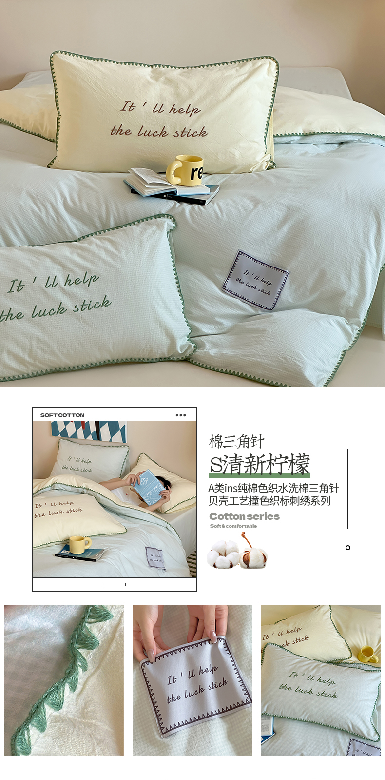 当前位置: 91家纺网 > 商品网购 > 床品套件 > 四件套 > 水洗棉四件套 > 桃子家居 2025新款A类ins纯棉色织水洗棉三角针贝壳工艺撞色织标刺绣系列四件套 棉三角针-S清新柠檬