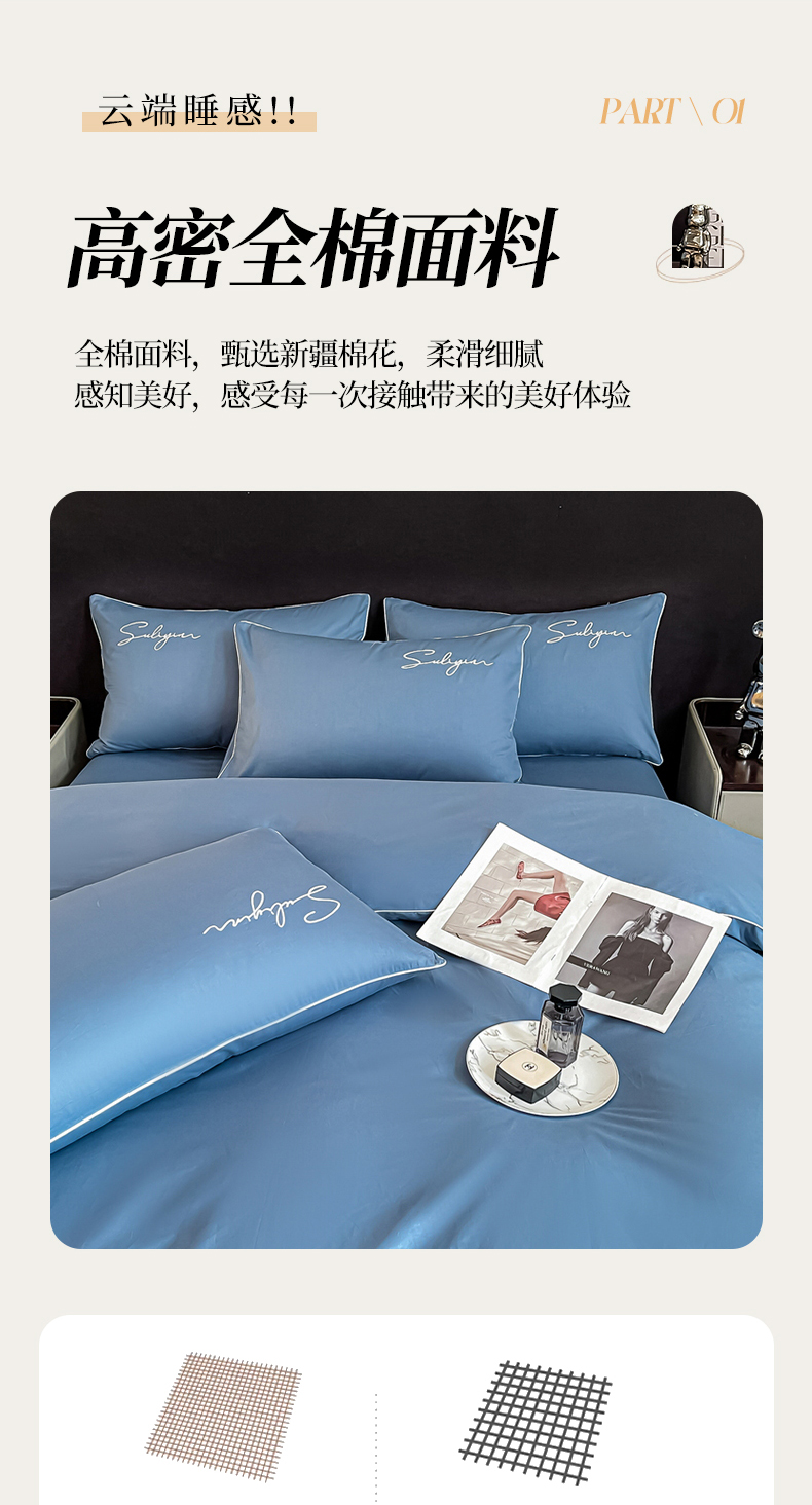 当前位置: 91家纺网 > 商品网购 > 床品套件 > 四件套 > 全棉普通四件套 > 一帆毯业 2024新款全棉纯色刺绣麻绳滚边四件套 月光蓝