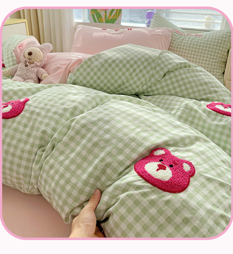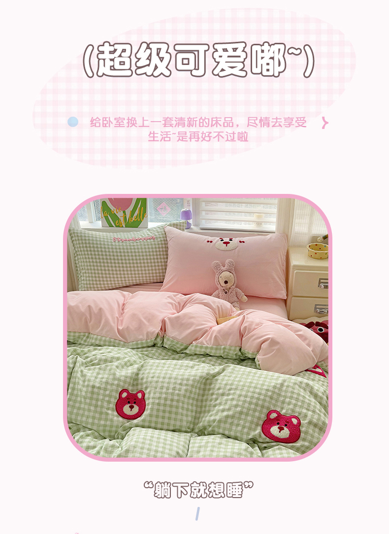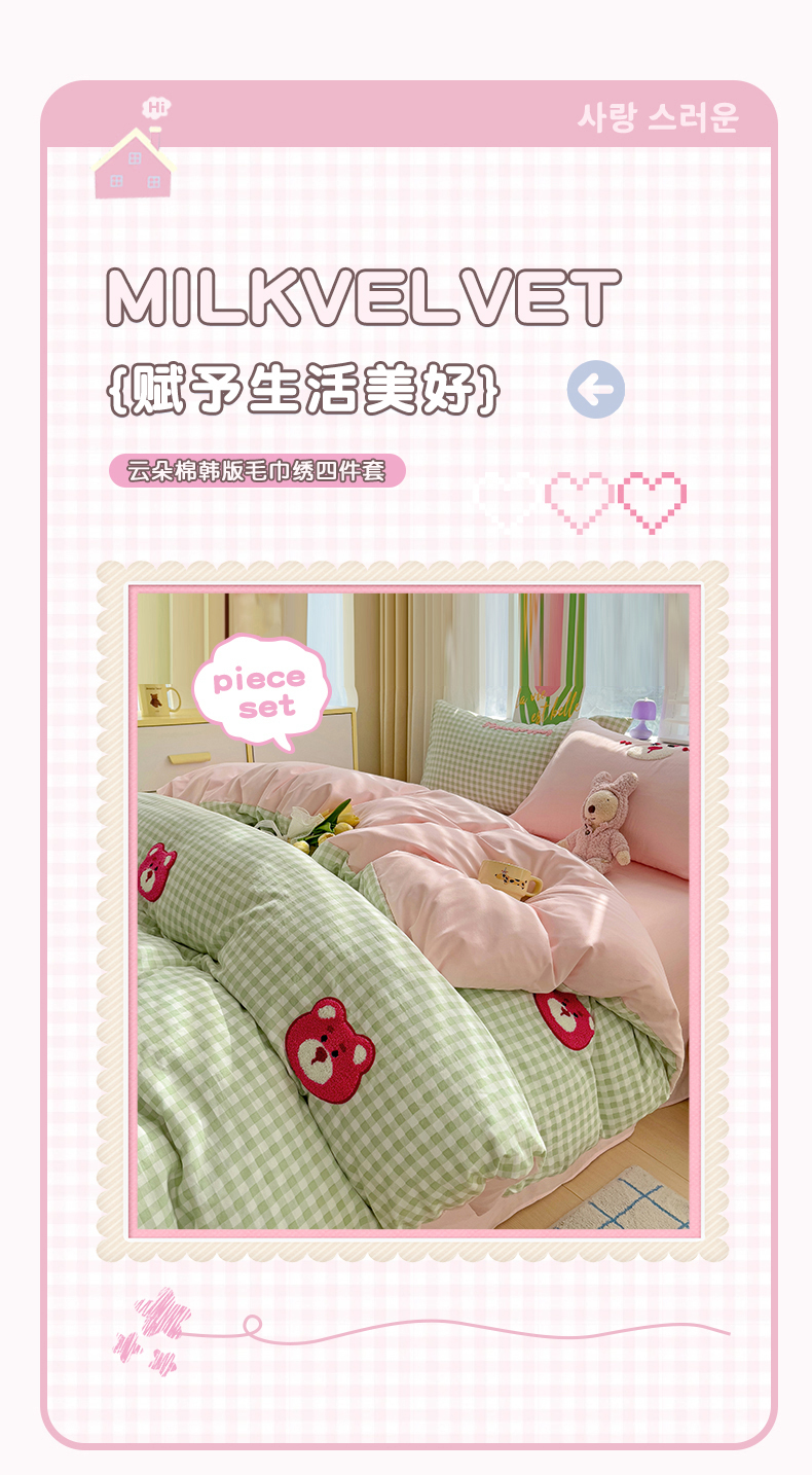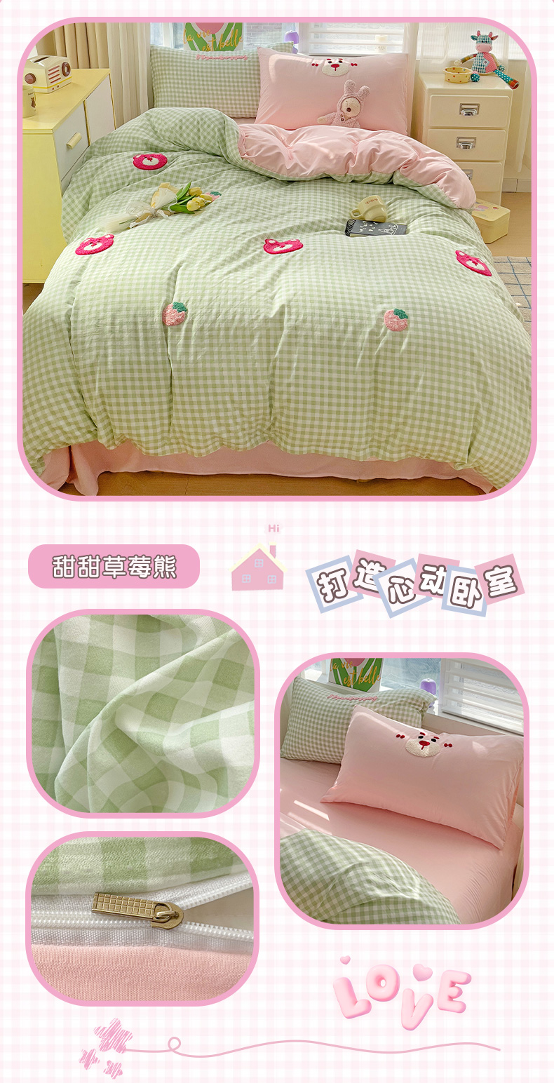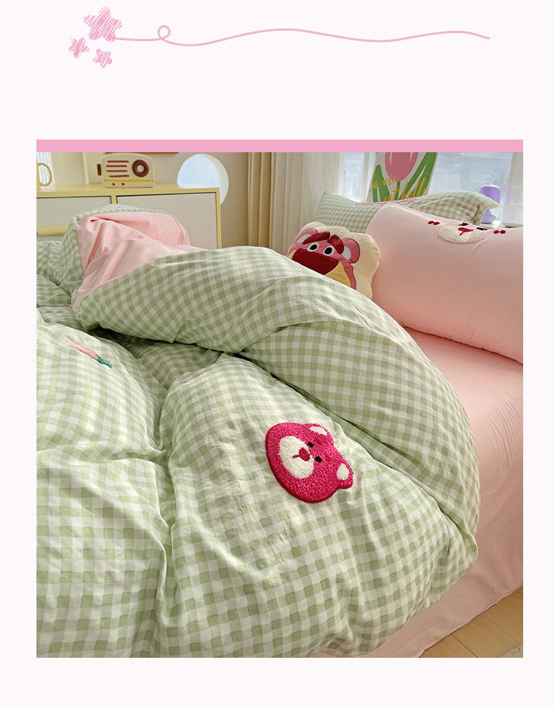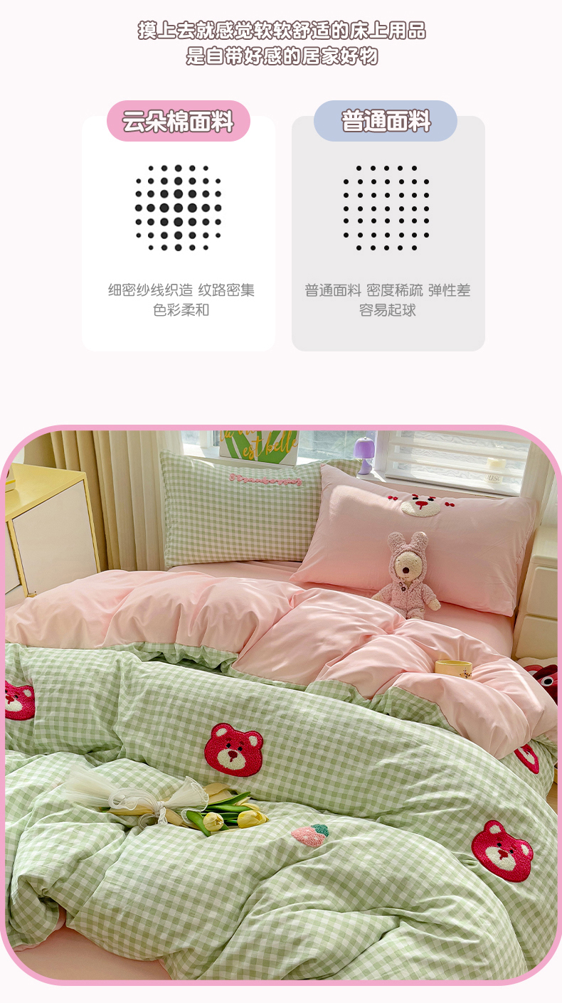 当前位置: 91家纺网 > 商品网购 > 床品套件 > 四件套 > 毛巾绣四件套 > 罗亿家纺 2025新款格子卡通云朵棉毛巾绣四件套场景二(提供买家秀) 甜甜草莓熊