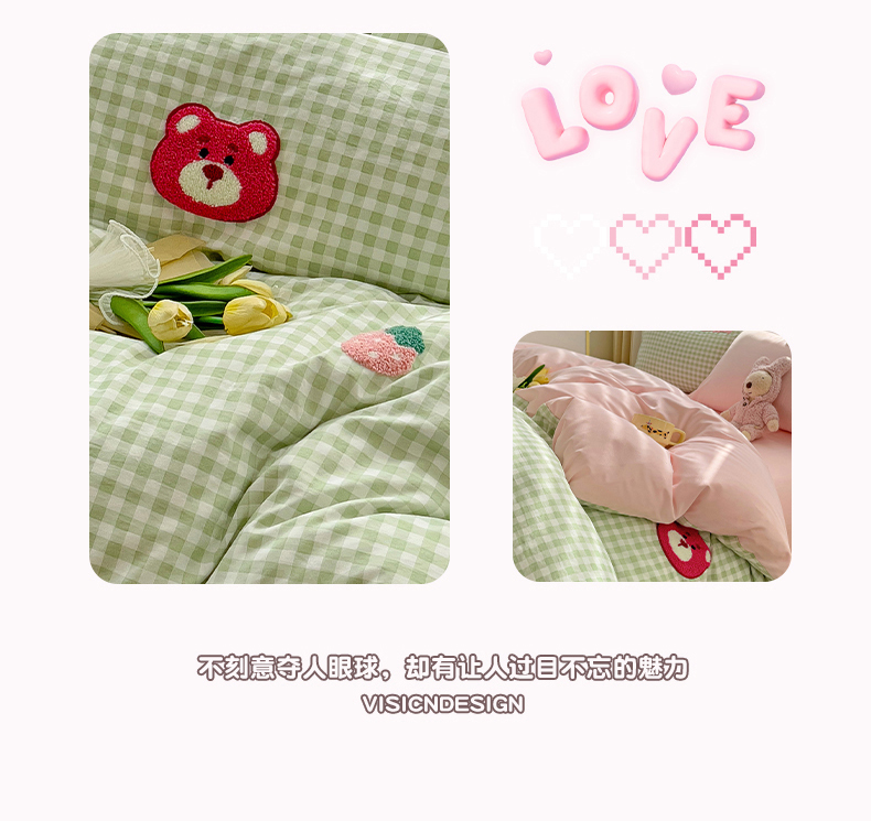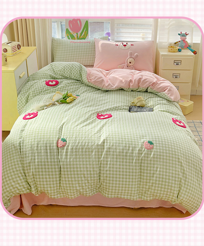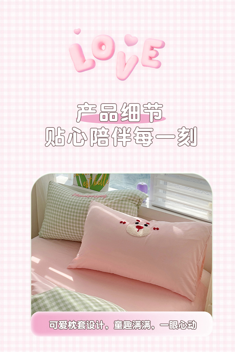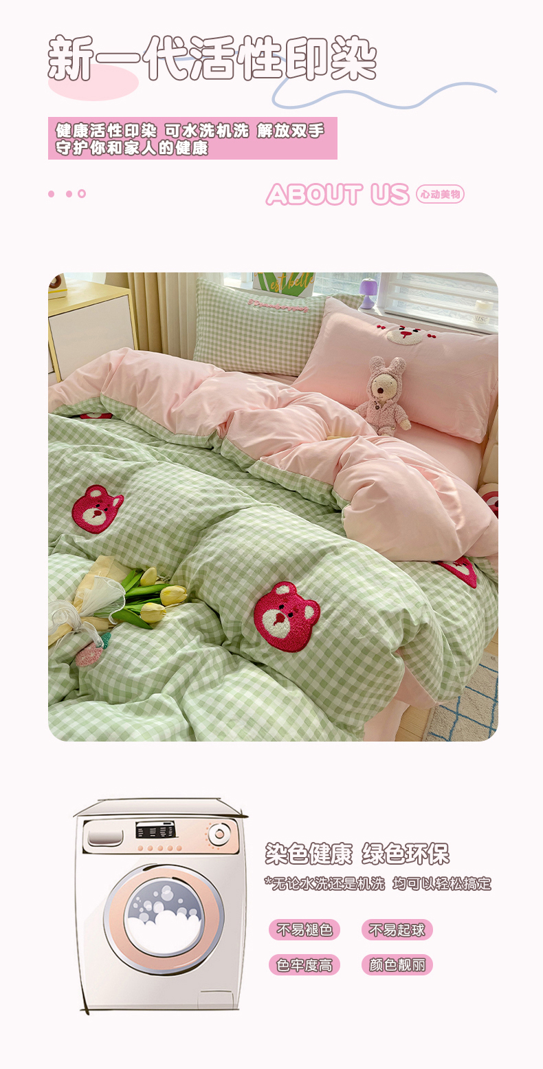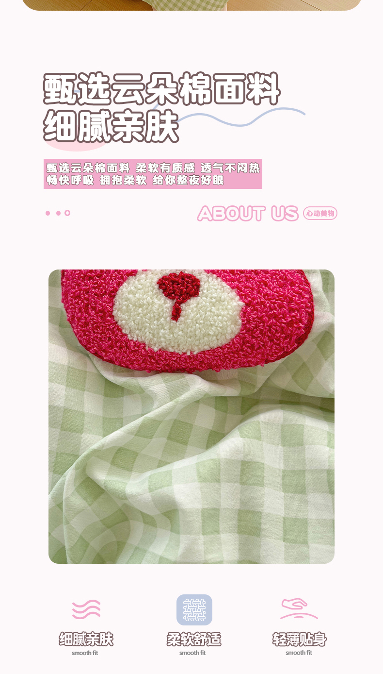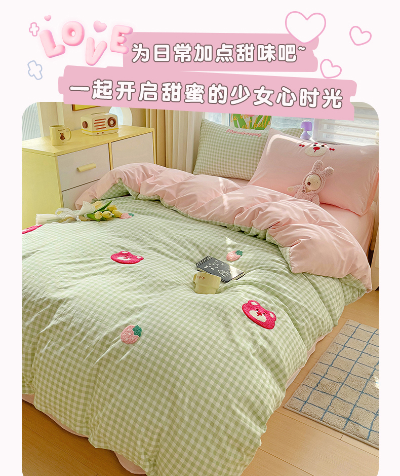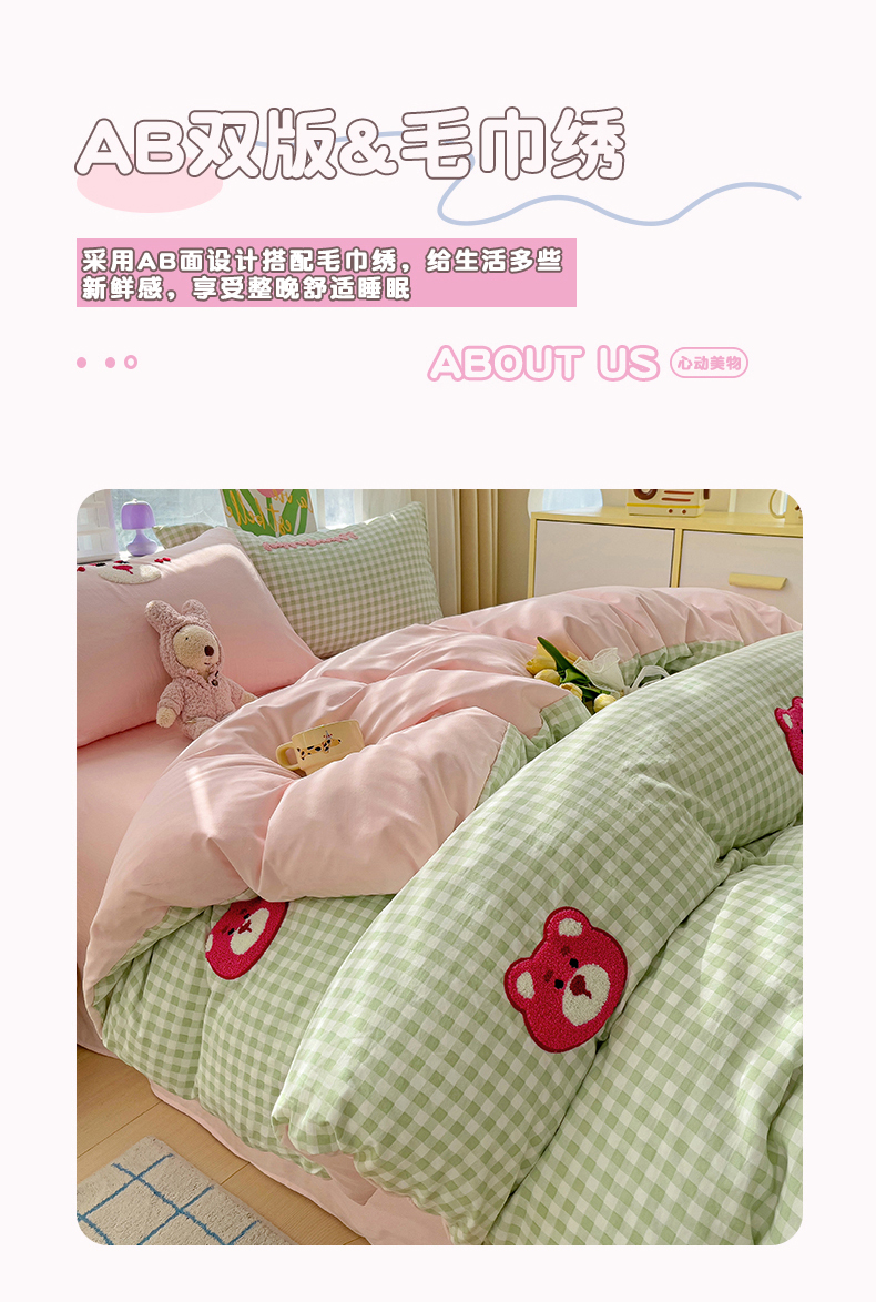 当前位置: 91家纺网 > 商品网购 > 床品套件 > 四件套 > 毛巾绣四件套 > 罗亿家纺 2025新款格子卡通云朵棉毛巾绣四件套场景二(提供买家秀) 甜甜草莓熊