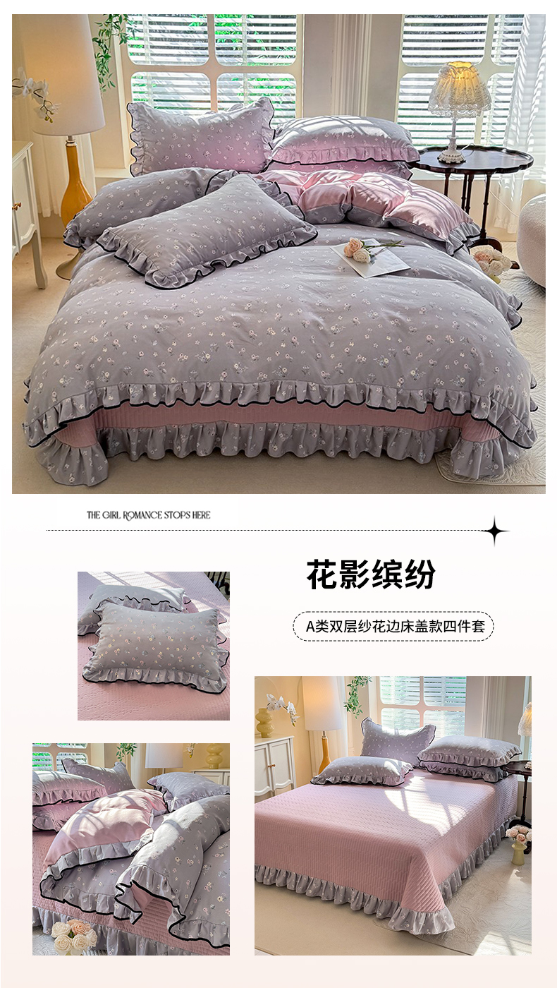 商品名称:韩约家纺 2025新款1针织双层纱花边款床盖四件套 花影缤纷(花边款)