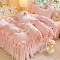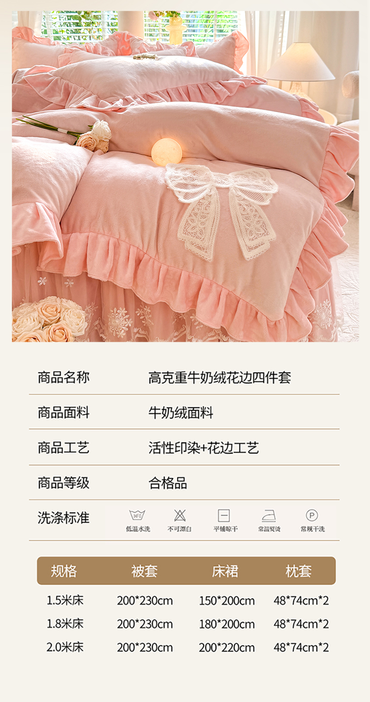 商品名称:2025秋冬新款230g全消光牛奶绒床裙款四件套纯色蕾丝花边刺绣蕾丝床裙款床盖款法式蕾丝公主粉奶油风四件套 甜心—樱花粉
