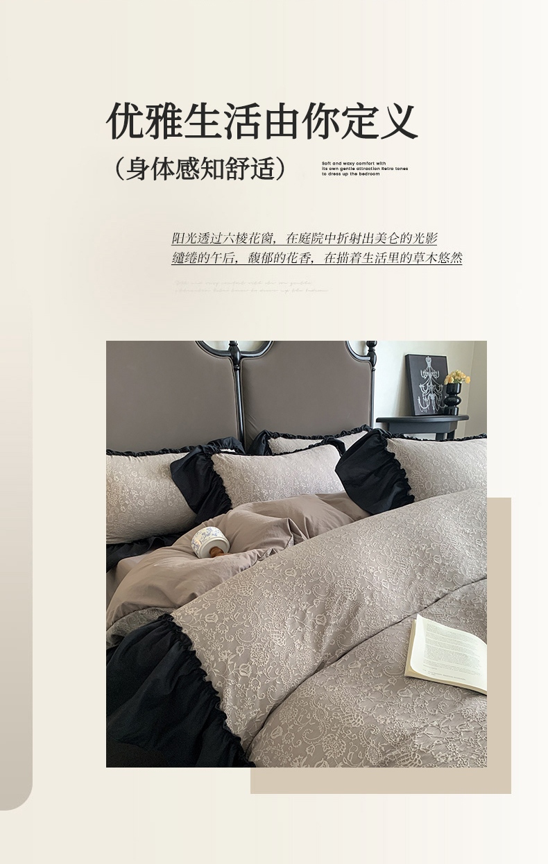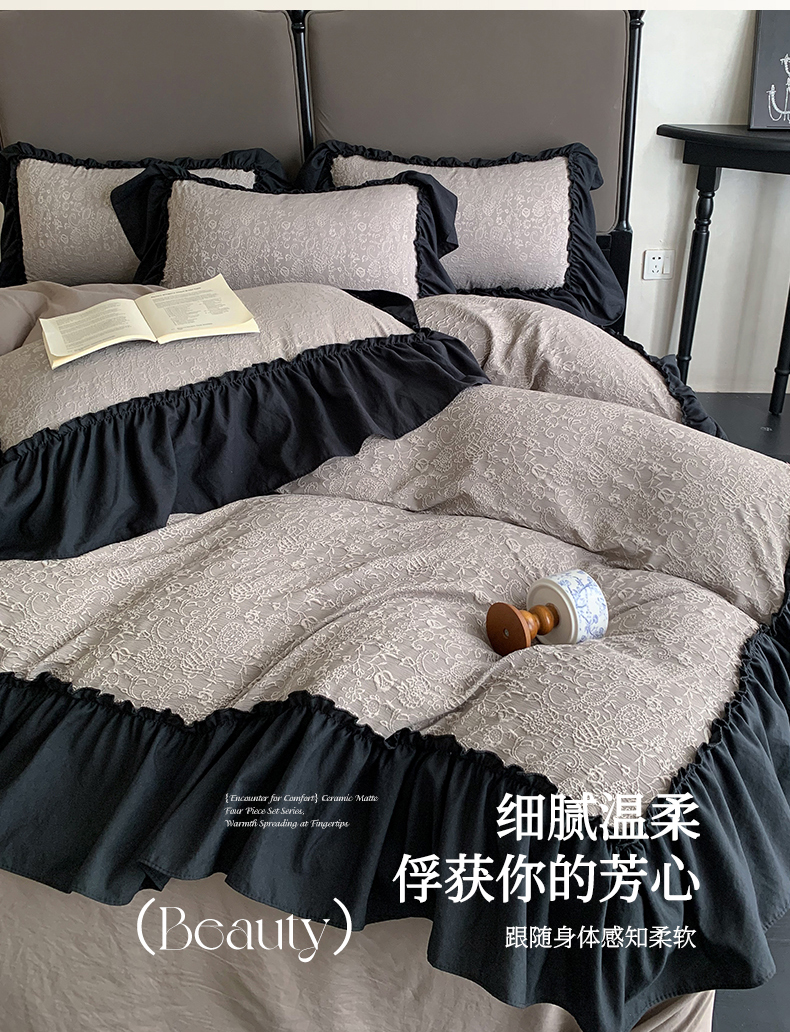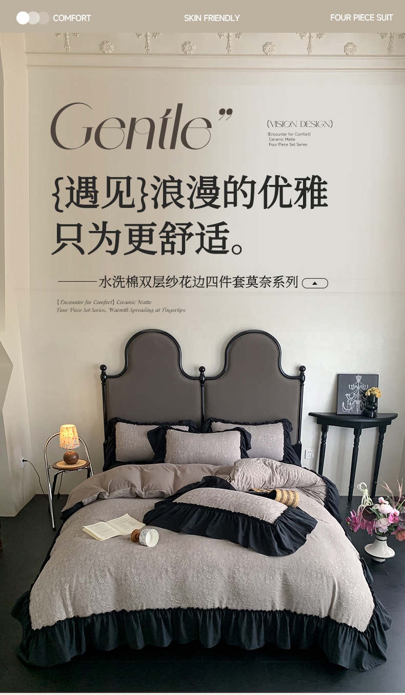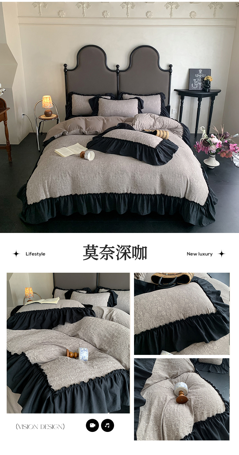 当前位置: 91家纺网 > 商品网购 > 床品套件 > 四件套 > 水洗棉四件套 > 你好美丽 2025新款莫奈水洗磨毛双层纱立体提花大花边工艺款四件套 莫奈深咖