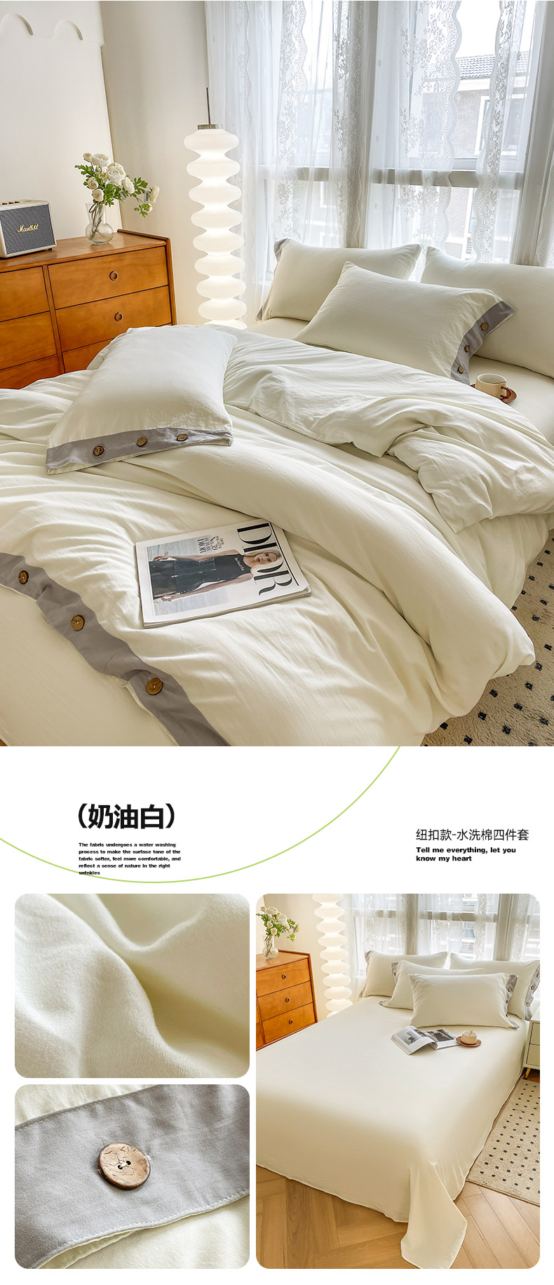 当前位置: 91家纺网 > 商品网购 > 床品套件 > 四件套 > 水洗棉四件套 > 库里梦家纺 2025新款贴边纽扣式纯色水洗棉四件套 贴边纽扣-奶油白