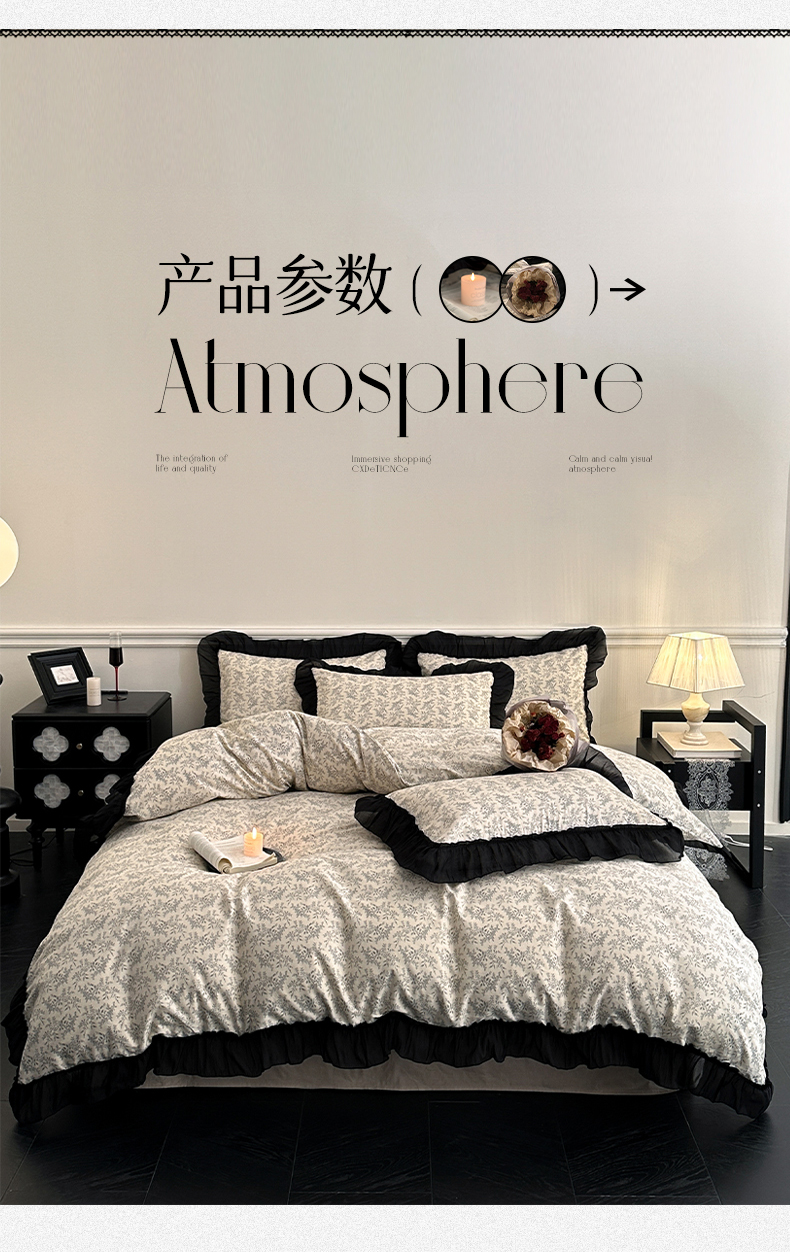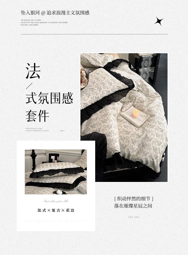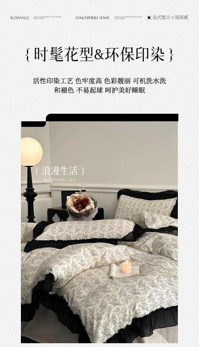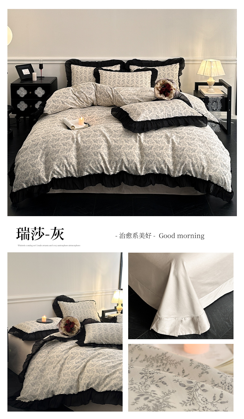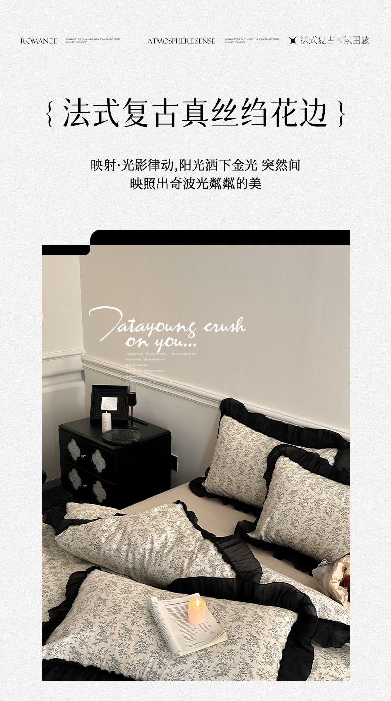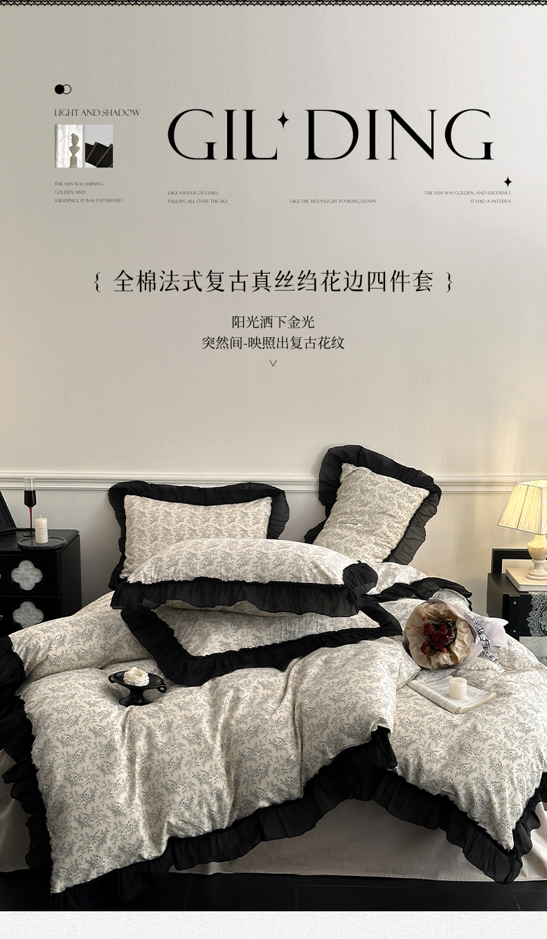 当前位置: 91家纺网 > 商品网购 > 床品套件 > 四件套 > 全棉普通四件套 > 蓝邻家纺 2025年新款全棉法式复古真丝绉花边四件套系列 瑞莎-灰