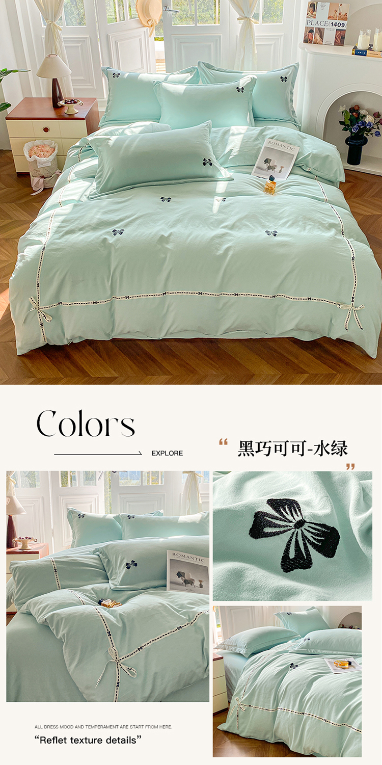 庭笙 2025新款小香风满版刺绣蝴蝶小清新四件套—黑巧可可 水绿