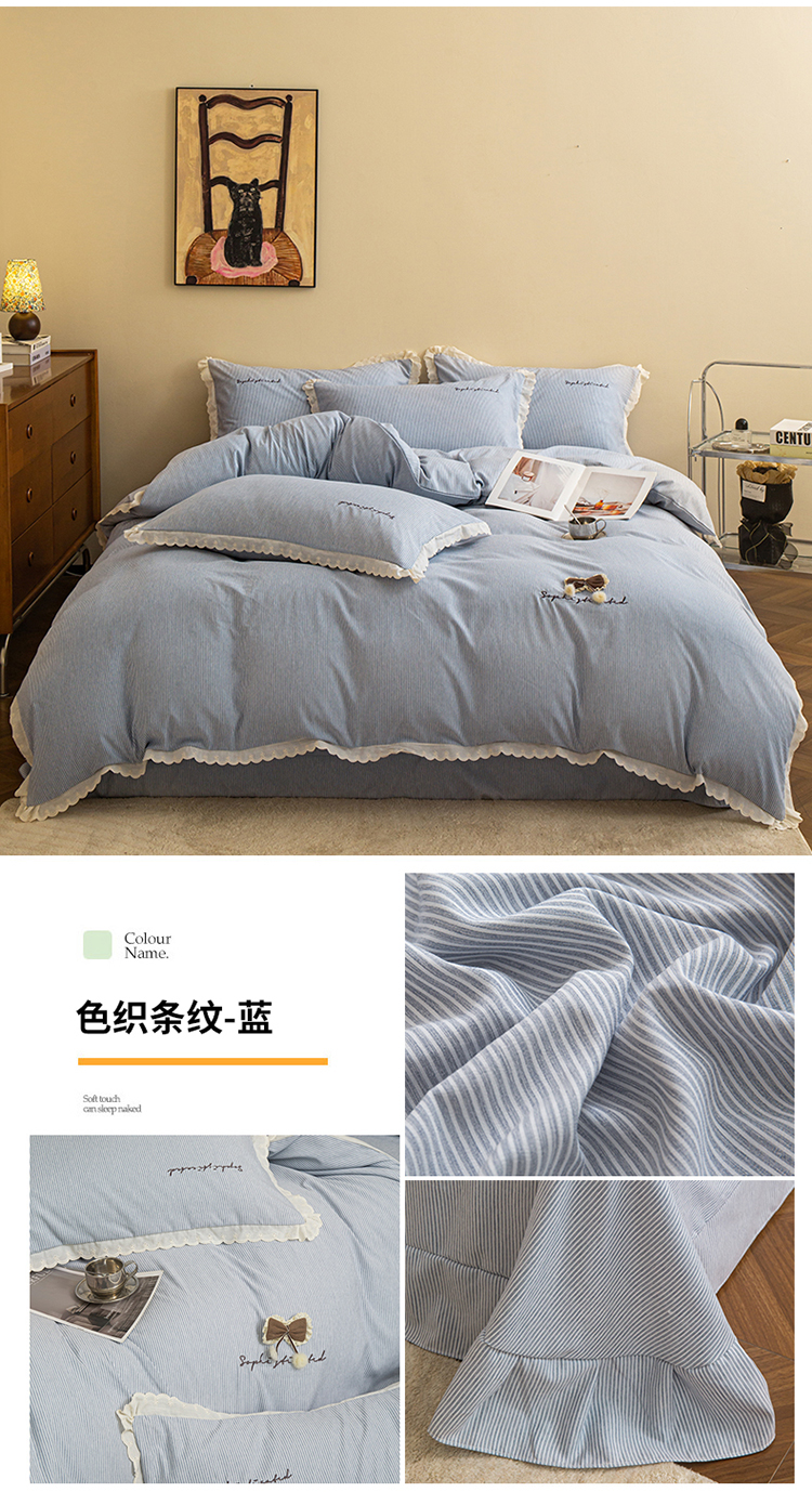 商品名称:庭笙 2025新款无印.色织条纹少女韩式小花边简约条纹四件套 色织条纹.蓝