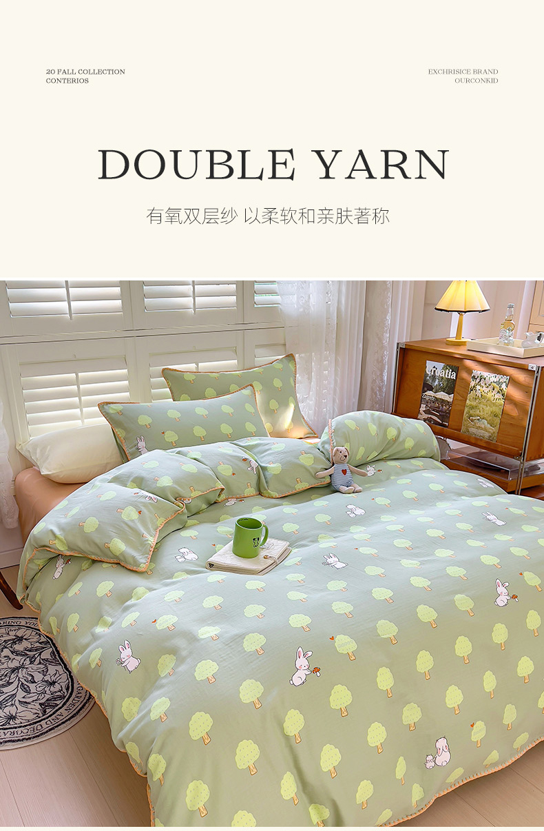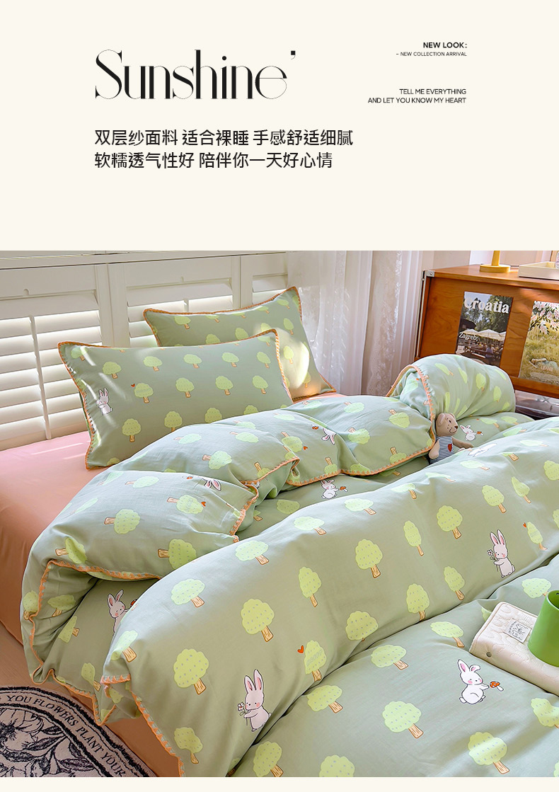 田野家纺2025新款A类全棉双层纱四件套 萌兔森林