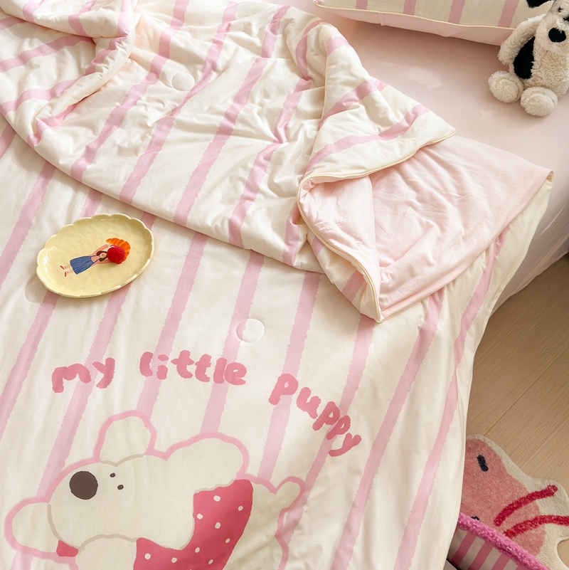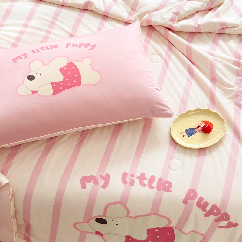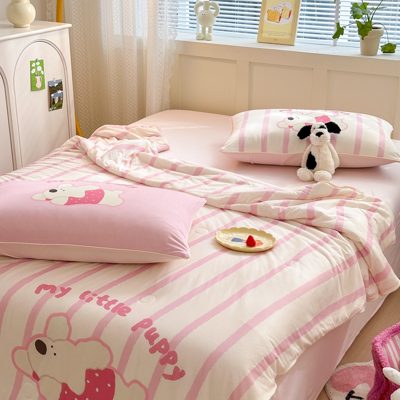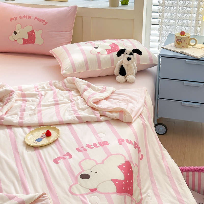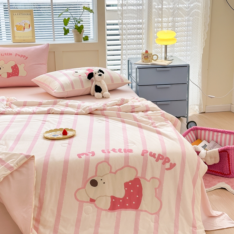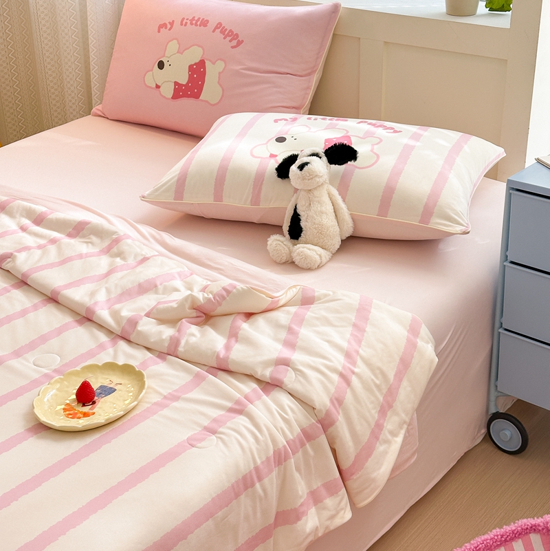 星期八 2025新款针织棉夏被四件套 竖条狗狗粉